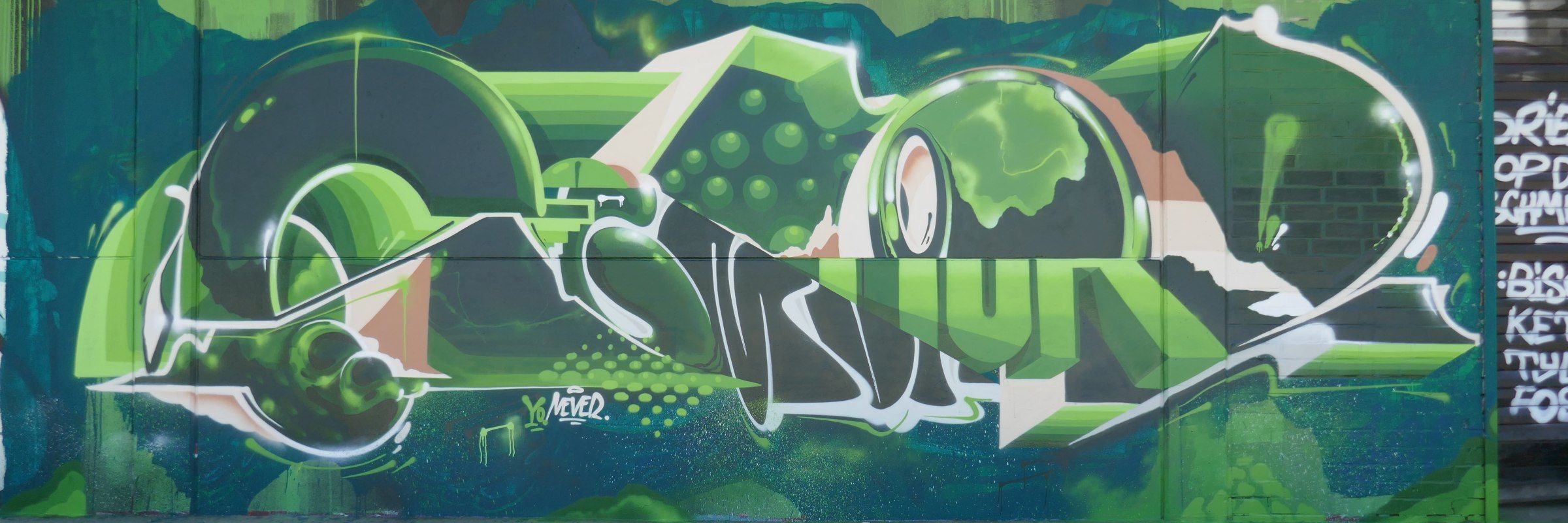 Schaut man sich Semors Styles einmal genauer an, so fällt auf, dass auch diese von abstrakten Formen sowie Buchstaben geprägt sind – dennoch hat auch er eine lange Entwicklung hinter sich, hat vieles ausprobiert und nie aufgehört, zu experimentieren. „Irgendwann, so um das Jahr 2013, wurde es dann grafischer“, expliziert Semor. „Ich war in Dänemark, hab mit ZOER, DAIS, Velvet und Storm gemalt und da war dann wirklich der Punkt, wo wir alles sehr grafisch aufgebaut haben.“ Und diesen Einfluss spürt man bis heute. So sind seine Pieces bis heute von enormer kompositorischer Übersicht geprägt und vereinen abstrakte, grafische Formen und Strukturen mit typografischen Extravaganzen. Filigrane Linien treffen auf ausufernde Farbflächen, messerscharfe Outlines auf nebulöses Fading, abstrakte Buchstaben auf flächendeckende Strukturen – wodurch eine starke bildinhärente Spannung erzeugt wird. Dennoch weist Semor darauf hin, dass sein Style sich mittlerweile wieder ein bisschen mehr ‚in Richtung Graffiti‘ entwickle, denn vor ein paar Jahren habe er damit angefangen, z.B. auch wieder kleine Throw-Ups miteinzubauen. Im Endeffekt ist sein Stil dominiert von einem Mix aus verschiedenen Styles, nicht willkürlich gedacht, sondern vielmehr minutiös aufeinander abgestimmt. Ein überproportionierter Buchstabe vorne, ein filigran wirkender hinten; eine offene Form hier und ein grafisches Element dort – und dennoch passt alles perfekt zusammen. Es handelt sich folglich mehr um eine Komposition aus Buchstaben, Formen, Ebenen und Strukturen und nicht um eine kontinuierliche Handschrift im strengen Sinne.