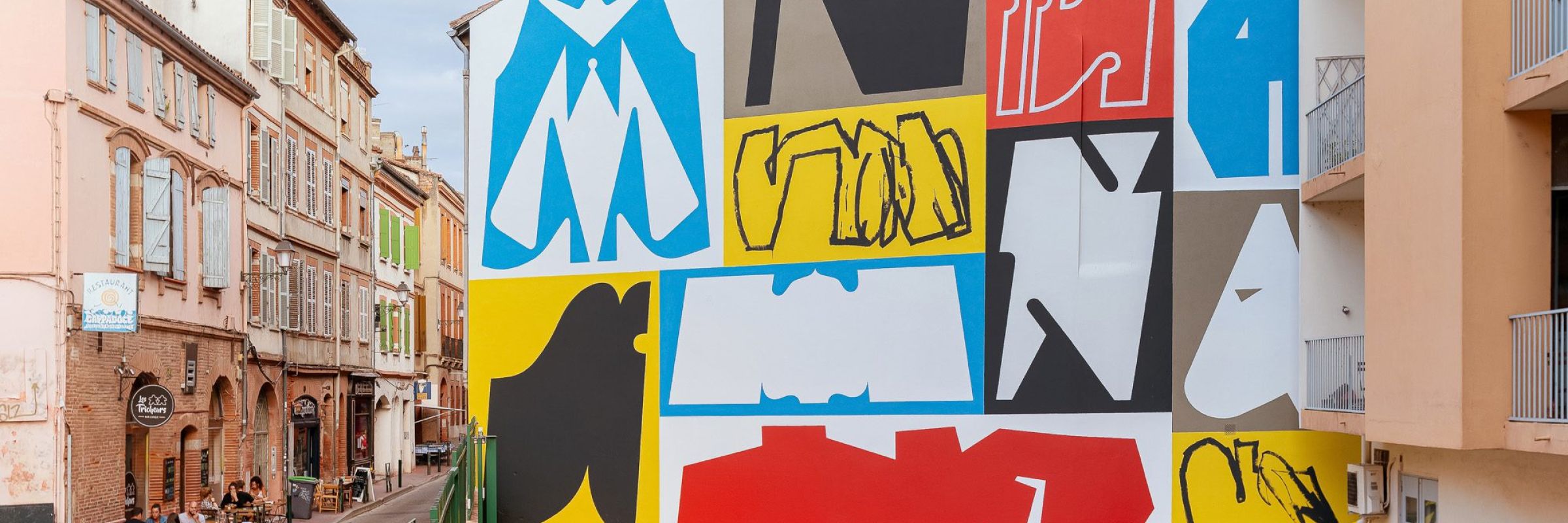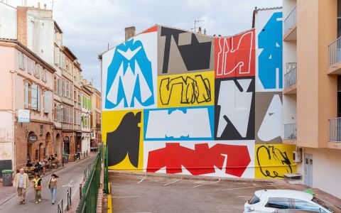 Für seine Wandmalereien fertigt EROSIE vor dem Malen eine grobe Skizze an, die er aber nie fertigstellt, weil er wegen der Größe zwischendurch eh improvisieren muss. Er verwendet Wandfarbe, Pinsel und Rollen und wählt Schwarz und Weiß und drei Komplementärfarben, um mit einer begrenzten Palette für seine Formen auf rechteckigen Feldern zu variieren. Von links nach rechts zu arbeiten, eine Form neben eine andere zu setzen und die Formen auszubalancieren, ist für ihn ein organischer Prozess und nicht nur eine mentale Projektion. Laut EROSIE, schafft er dies mit einem bestimmten Werkzeugsatz in seinem System, den er durch Zeichnen und Graffiti Writing entwickelt hat. Die Ergebnisse verblüffen durch die Schönheit der reinen Formen, die sich in farbigen Rechtecken nebeneinander ausbreiten und als Ganzes wie ein originelles handgefertigtes Muster aussehen, immer wieder anders, aber wunderbar zusammenpassend. Die schwebenden, großflächigen, bunten, abstrakten Formen an den Wänden sind faszinierend, verspielt und fröhlich.