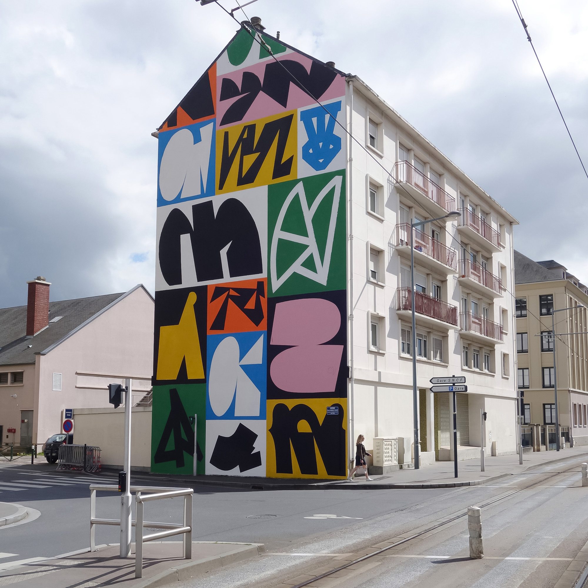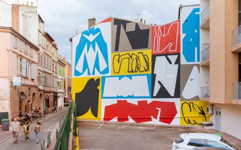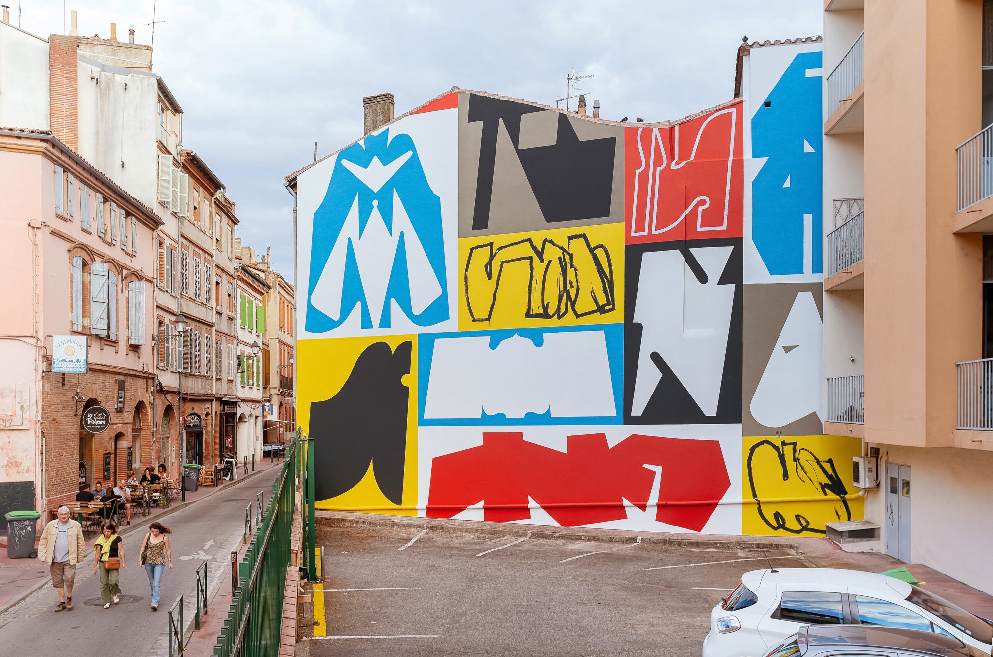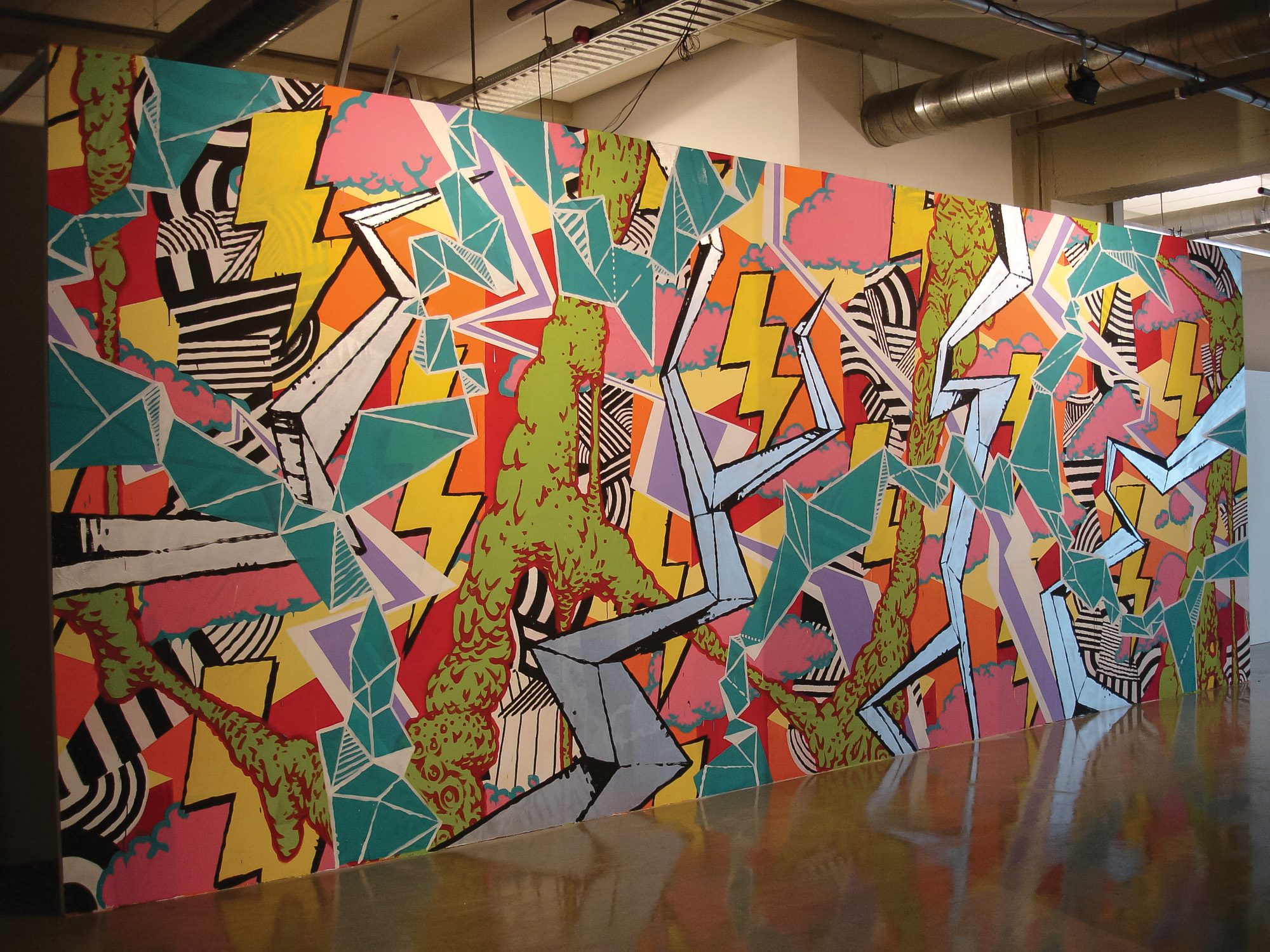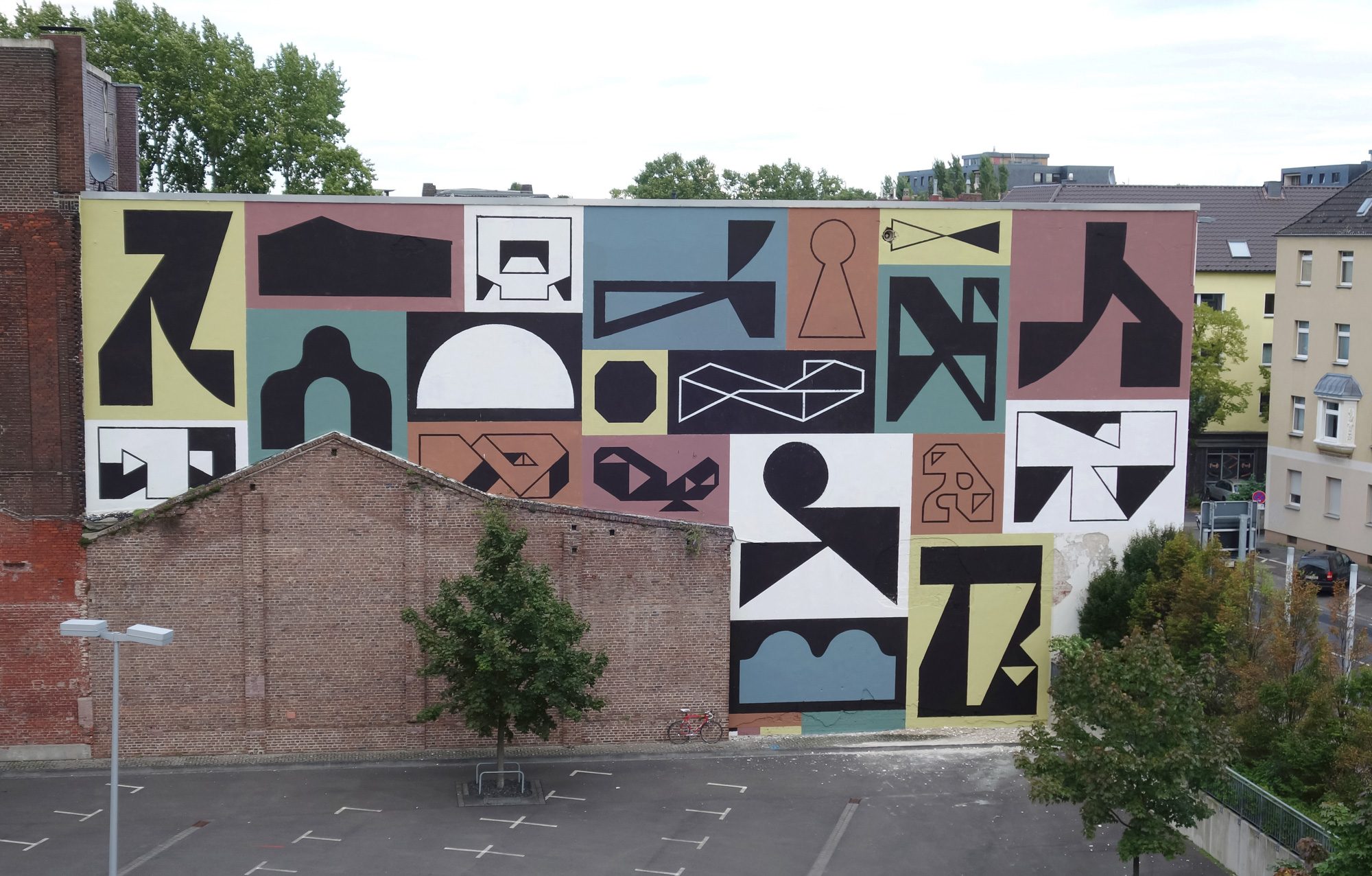 Für seine Wandmalereien fertigt EROSIE vor dem Malen eine grobe Skizze an, die er aber nie fertigstellt, weil er wegen der Größe zwischendurch eh improvisieren muss. Er verwendet Wandfarbe, Pinsel und Rollen und wählt Schwarz und Weiß und drei Komplementärfarben, um mit einer begrenzten Palette für seine Formen auf rechteckigen Feldern zu variieren. Von links nach rechts zu arbeiten, eine Form neben eine andere zu setzen und die Formen auszubalancieren, ist für ihn ein organischer Prozess und nicht nur eine mentale Projektion. Laut EROSIE, schafft er dies mit einem bestimmten Werkzeugsatz in seinem System, den er durch Zeichnen und Graffiti Writing entwickelt hat. Die Ergebnisse verblüffen durch die Schönheit der reinen Formen, die sich in farbigen Rechtecken nebeneinander ausbreiten und als Ganzes wie ein originelles handgefertigtes Muster aussehen, immer wieder anders, aber wunderbar zusammenpassend. Die schwebenden, großflächigen, bunten, abstrakten Formen an den Wänden sind faszinierend, verspielt und fröhlich.