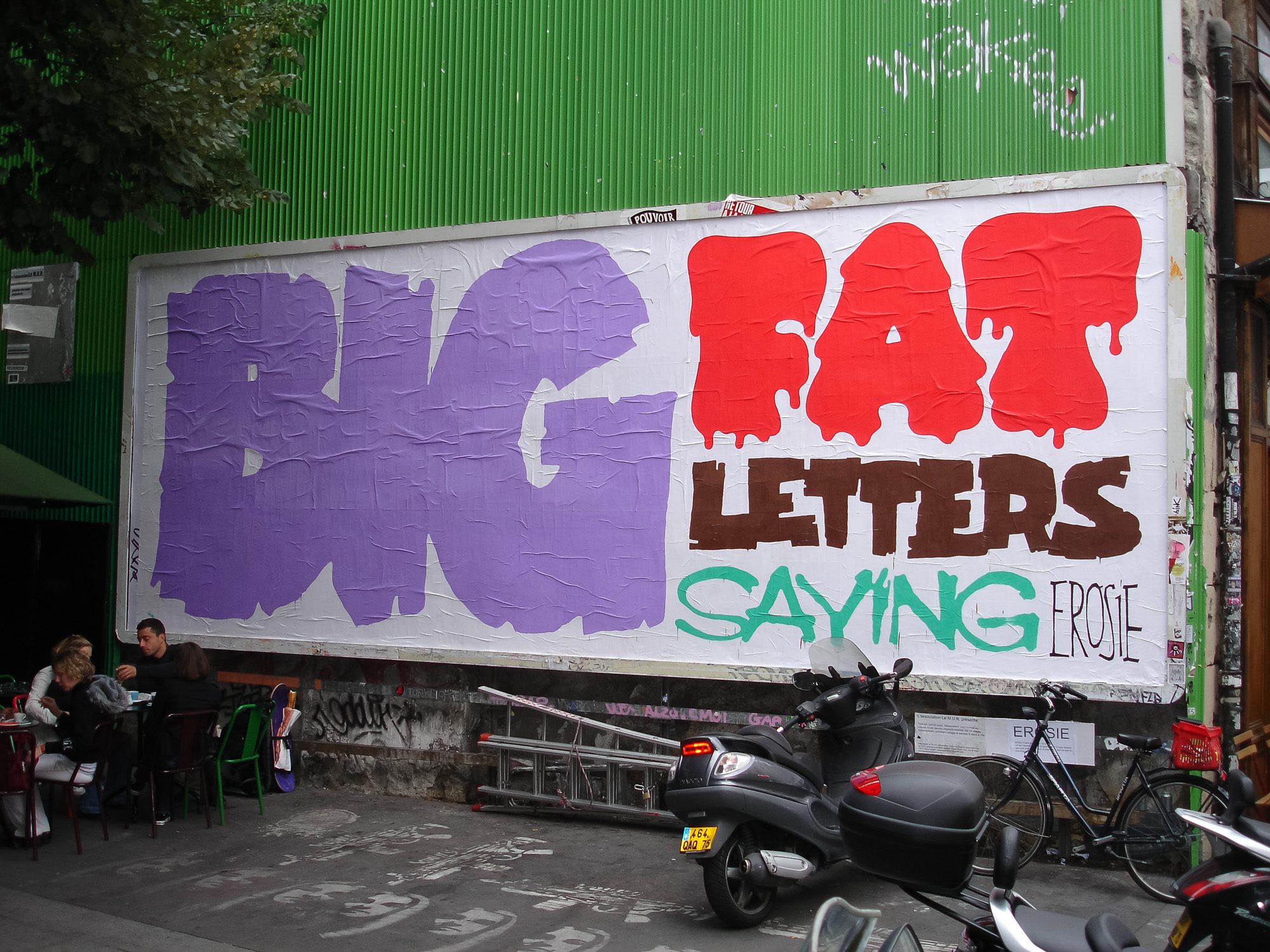 EROSIE ließ sich von allem, was er entdeckte, inspirieren und entwickelte seinen eigenen Stil, wobei er offen für Experimente war, Characters hinzufügte und sich nicht auf eine bestimmte Buchstabenform wie Block oder Semi-Wildstyle beschränkte. Ende der 1990er Jahre begann er, das Interesse am klassischen Style Writing seines Namens zu verlieren und entwickelte neue Ideen und Ausdrucksmöglichkeiten, insbesondere für die Straße.