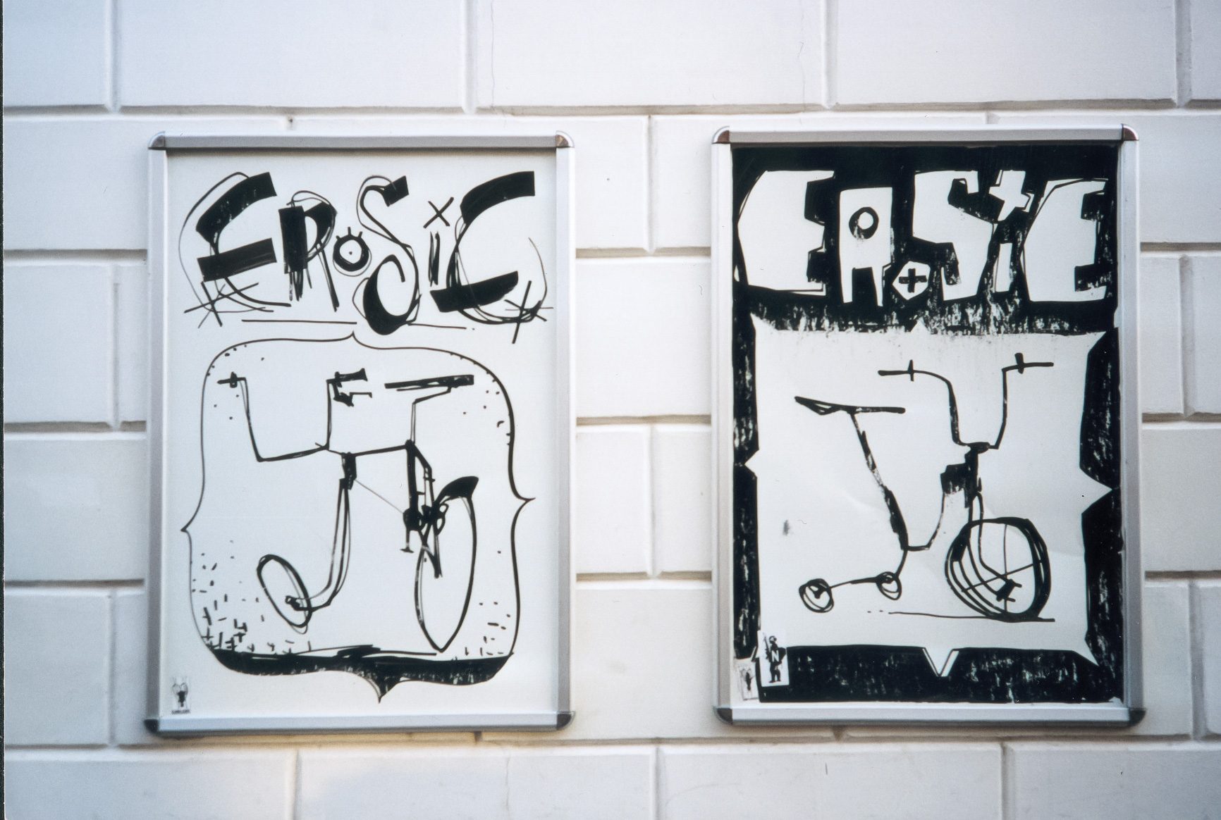 EROSIE trennte bereits seine Arbeit auf der Straße von der Arbeit an der Kunstschule, was ihm ermöglichte, zwischen den beiden Welten hin- und herzuspringen. Im Jahr 1999 machte er seinen Abschluss als Illustrator und wurde ein professioneller Zeichner für Kinderbücher, machte redaktionelle Arbeiten für Zeitungen und Zeitschriften sowie kommerzielle Arbeiten, einen Job, den er tagsüber ausübte, während er nachts mit seinen Street Art-Arbeiten auf der Straße unterwegs war. Aufgrund dieses ständigen Abriebs war EROSIE nach ein paar Jahren erschöpft Auftragsillustrationen zu machen und kündigte zeitweise seinen Job ab 2003. Denn durch den verbundenen Stress in diesem Beruf verlor er zeitweise den Spaß am Zeichnen und wollte diese Freude mit anderen Mischtechniken unbedingt zurückgewinnen. Er entwickelte somit andere Formen von Graffiti mit der Sprühdose, wie z.B. seine Fahrräder, und suchte nach einer freien Art der Verwendung von Bildern/Zeichnung. Seine bekannten „Fahrrad-Tags“ waren ein Bedürfnis, den Illustrator und Graffiti Writer in ihm zu vereinen, indem er eine pure Strichzeichnung und ein pures Tag in einem schaffte. Das Motiv des Fahrrads war damals eine Reaktion auf die kontrollierte Stadtplanung in Eindhoven und das Verschwinden von Fahrradparkplätzen. Für EROSIE war es ein persönliches Projekt, das mit seiner Liebe zum Fahrradfahren verbunden ist.