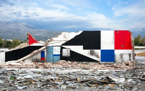 Ich stelle meine eigenen Farben her. Wenn man sich in den großen Städten Griechenlands genau umschaut, insbesondere während Renovierungsarbeiten, sieht man oft, dass alte Farbe auf die Straße gestellt wird. Ich sammle diese Farben ein und bringe sie in mein Atelier. Dort mische ich sie und kombiniere sie mit anderen Materialien. Durch diesen Prozess kann ich einzigartige und persönliche Farben kreieren.