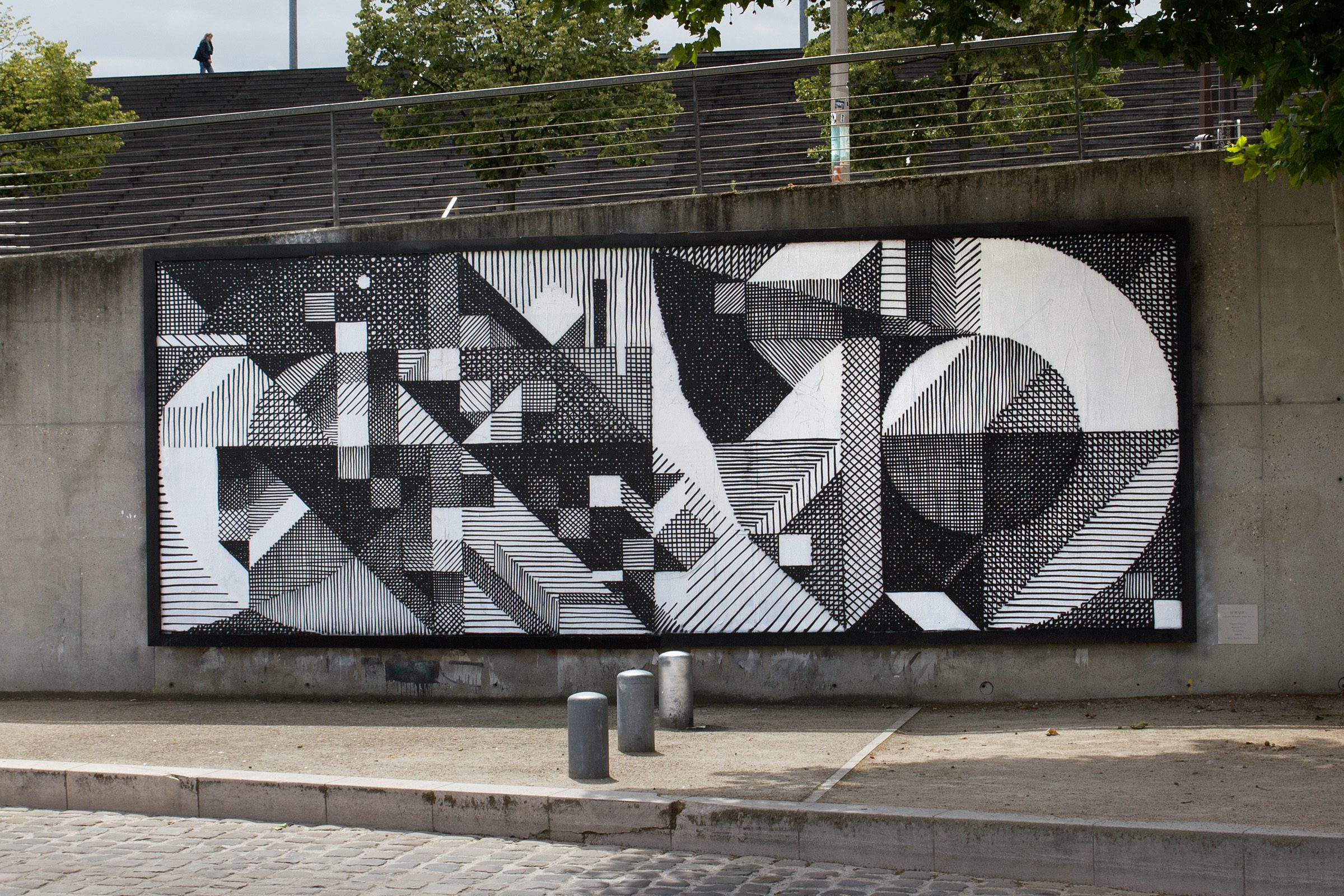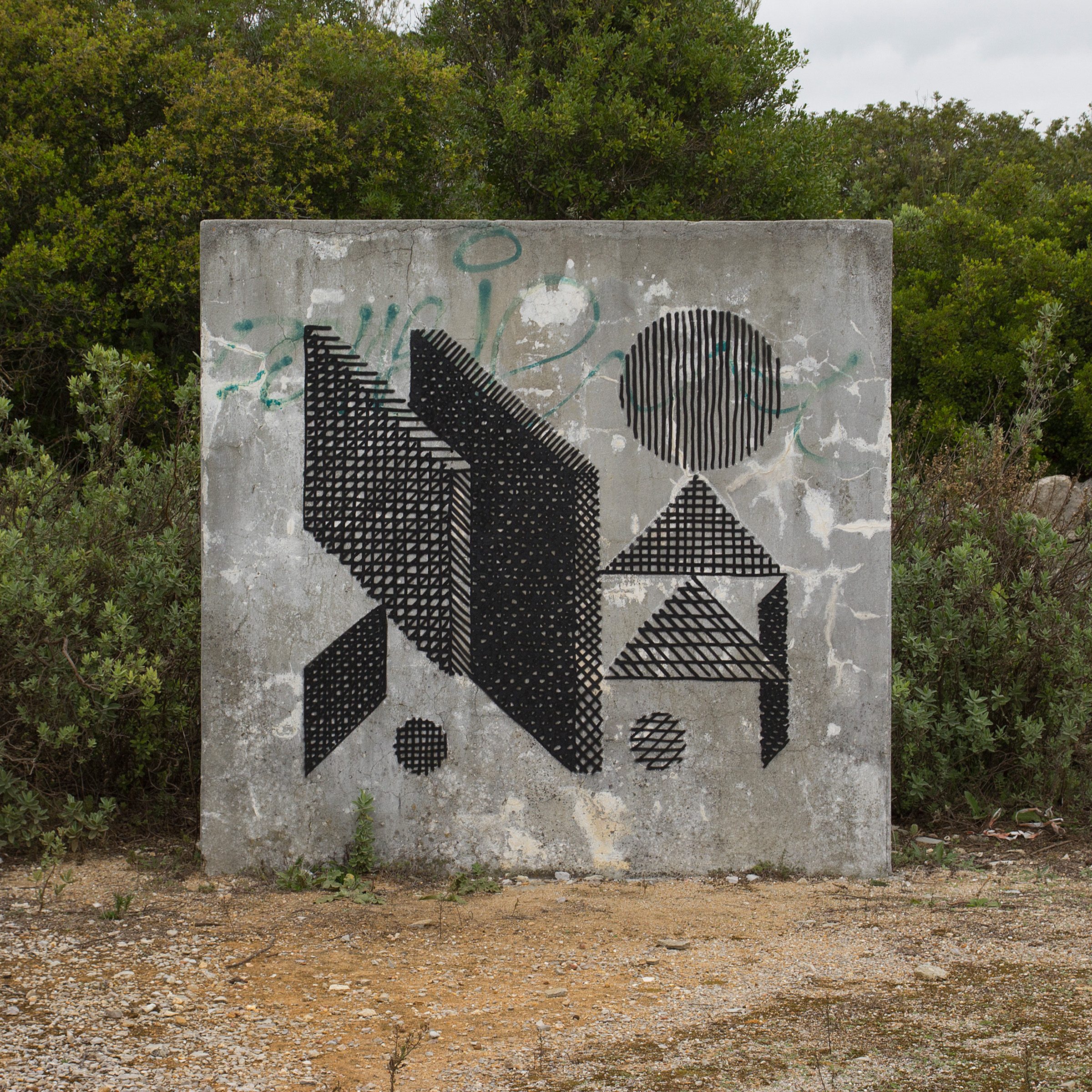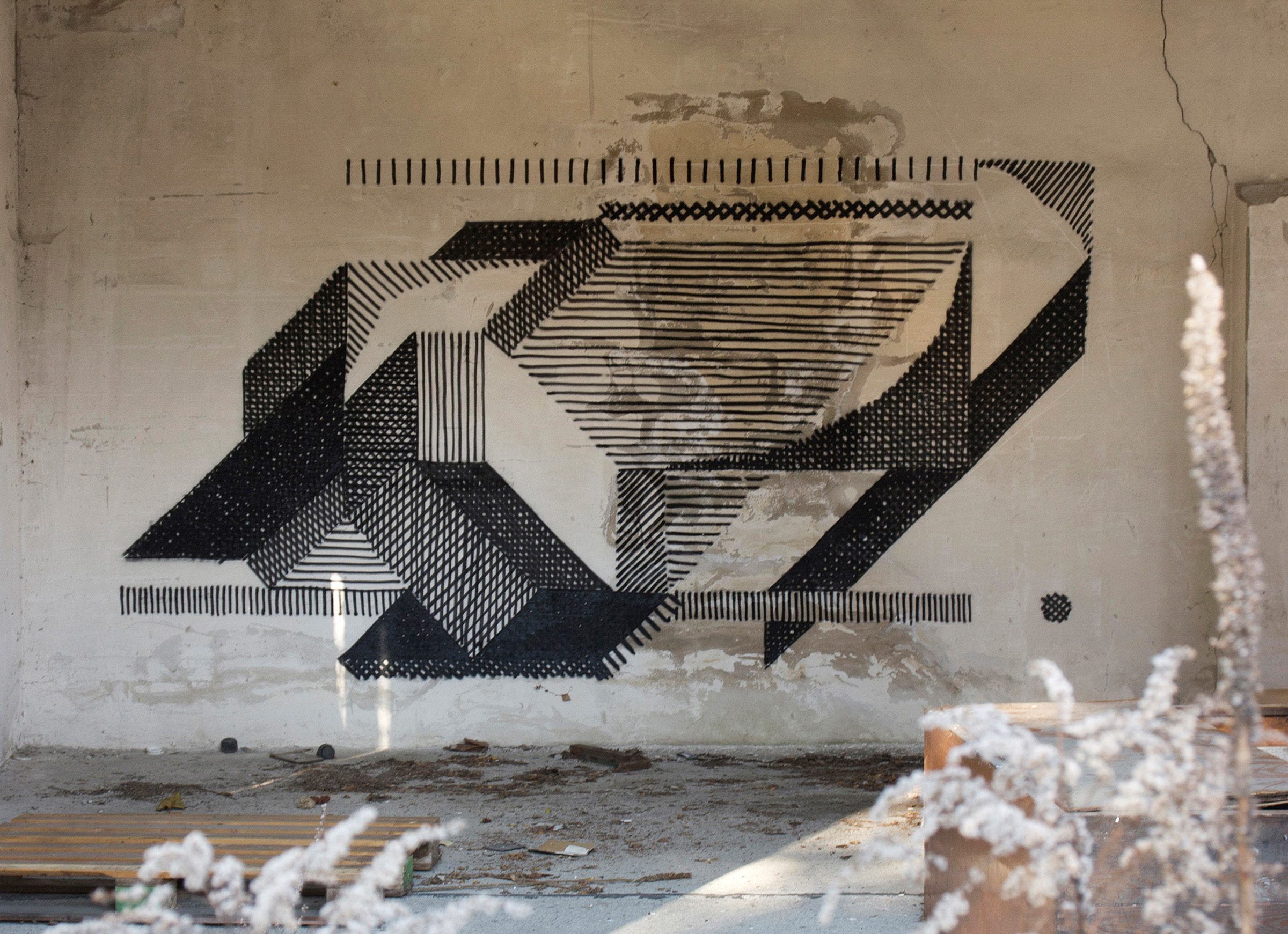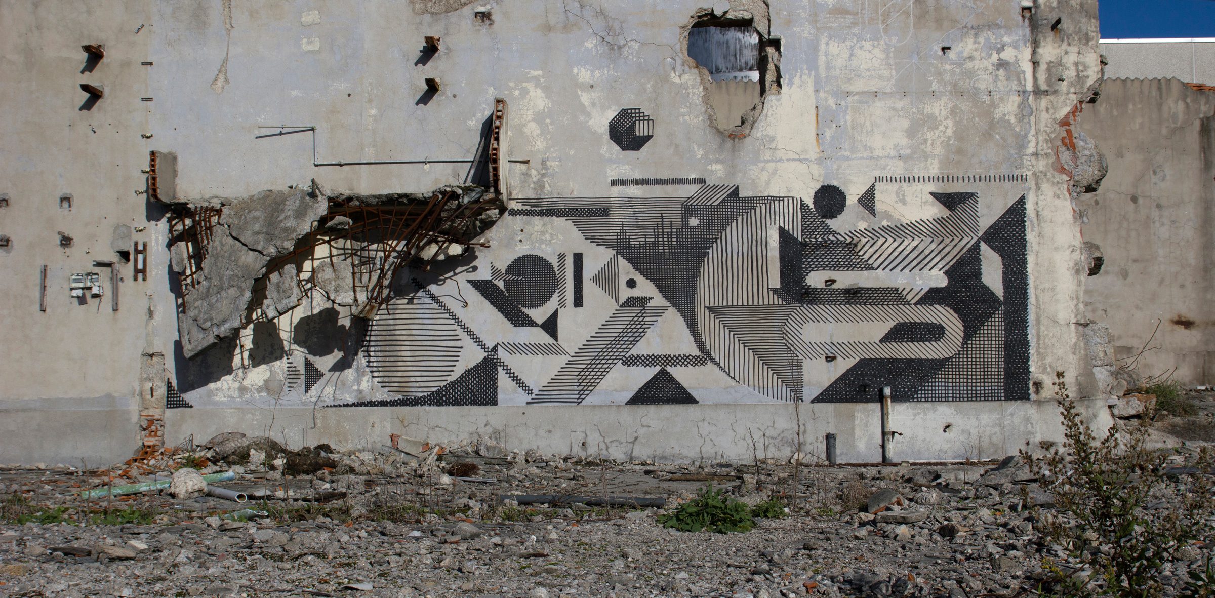 Ich male oft an verlassenen Orten. Architektonisch fasziniert mich besonders der Kontrast zwischen den geraden Linien der Gebäude und den chaotischen Linien einstürzender Mauern. Indem ich diese Dynamik des Aufbrechen in meine geometrischen Formen integrierte, konnte ich diesen Dialog mit der Architektur im Prozess des Verschwindens fortsetzen, wie beispielsweise in einer Wandmalerei, die ich 2013 in Porto malte. Dies beeinflusste auch meine Auseinandersetzung mit Strömungen jenseits des Konstruktivismus, wie dem damals aufkommenden Abstrakten Expressionismus oder den Erased Structures.