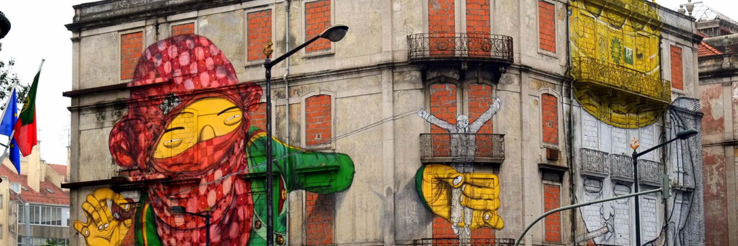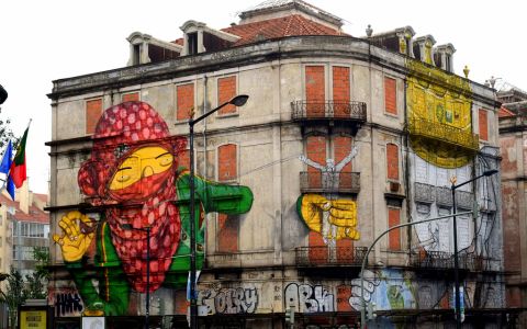 one very impressive mural is on an eight-story skyscraper and can be perfectly seen from the hills. this was created by the spanish artist aryz as part of a birthday project for the “montana shop & gallery lisboa”. the work is well worth seeing: a creative design with a great color combination.