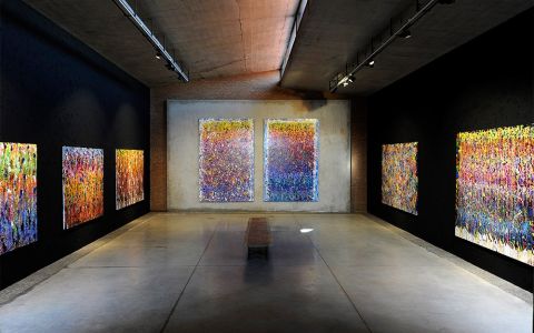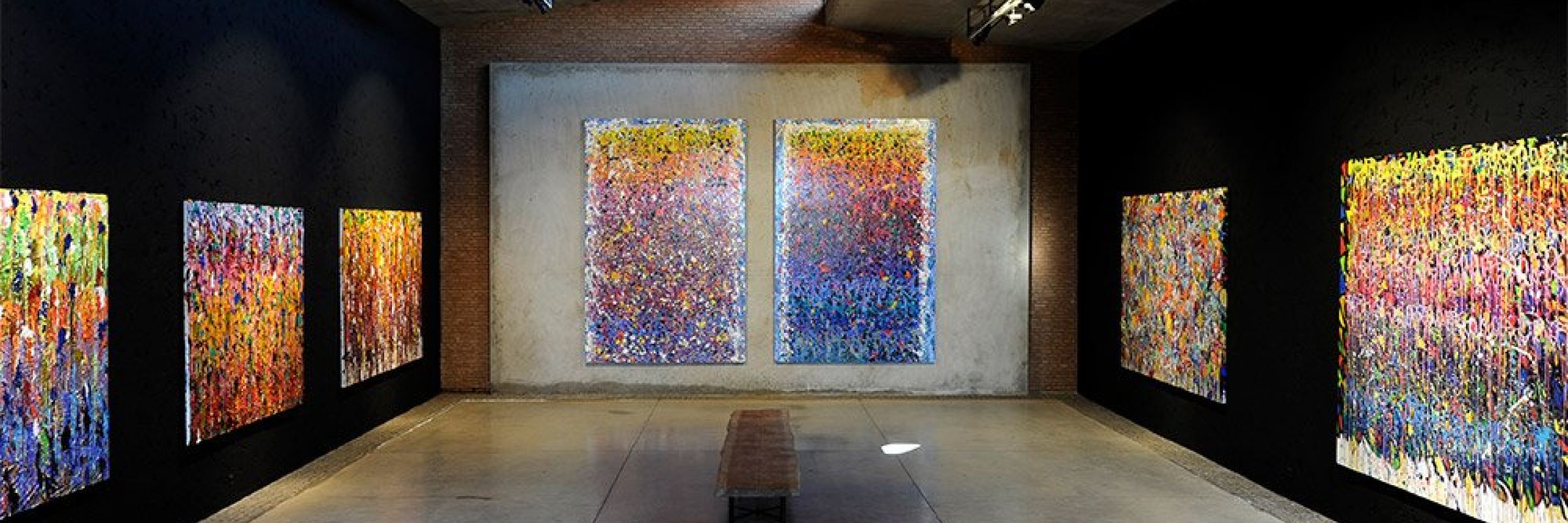 in morocco, he draws a deep inspiration and pushes the possibilities of the mediums he uses to their paroxysms. the material largely escapes from the canvas to land on the floors and walls of his studio at jardin rouge. the lattice generated by the flows of material on the canvas induce a certain automatism of the gesture which serves to break any distance between art and life. the viewer can then simply enjoy contemplating rather than watching what is seen.