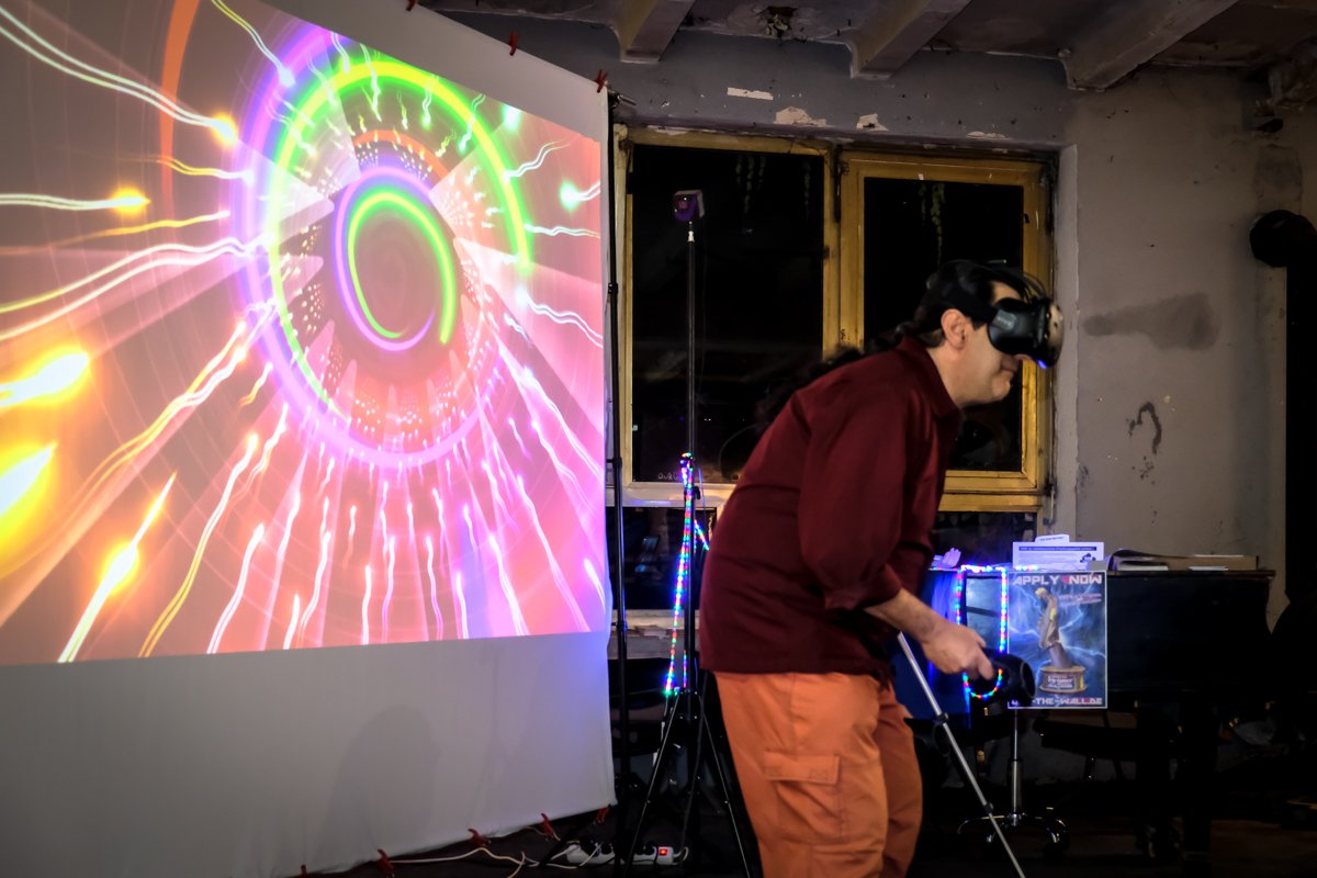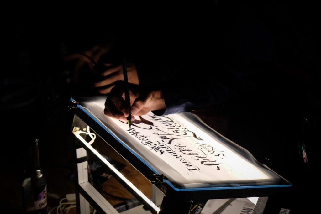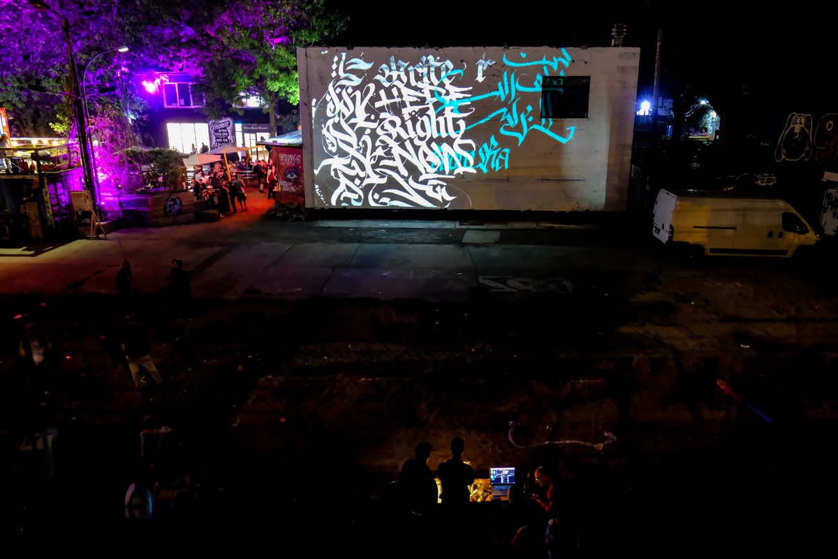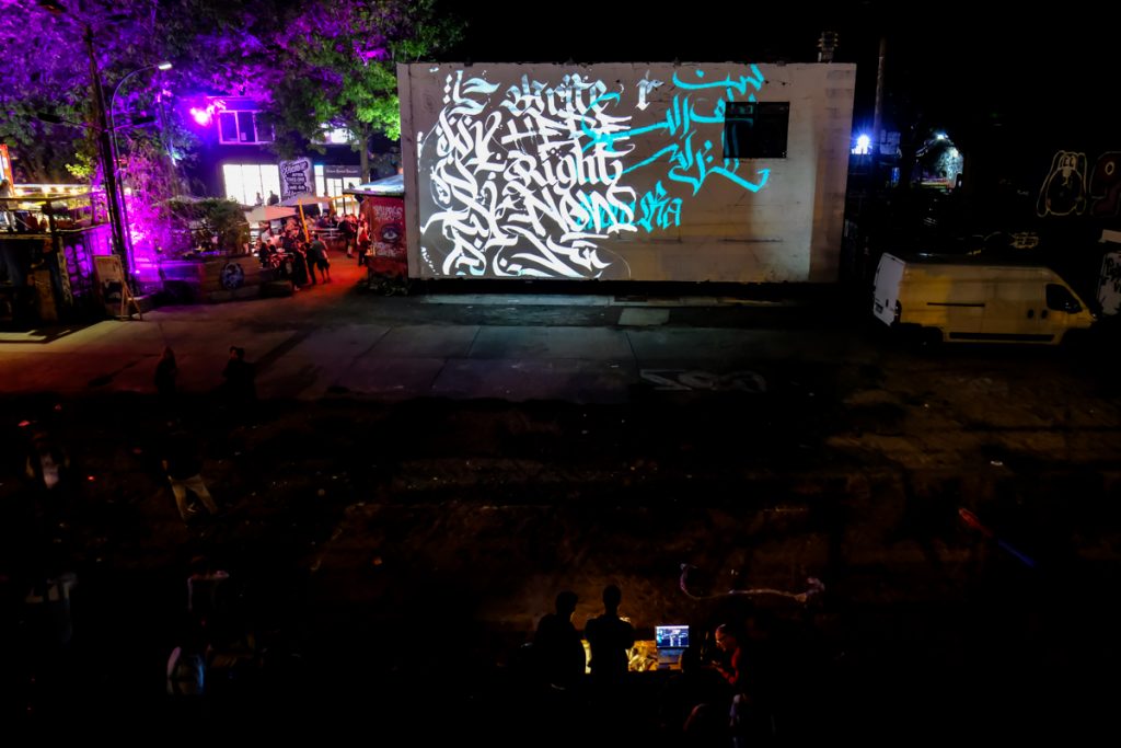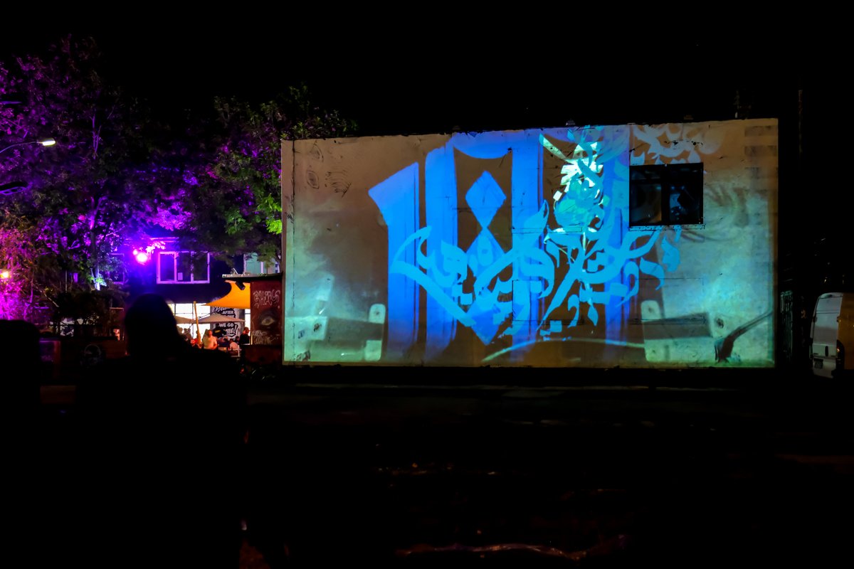 Many of the visitors were magically attracted by the digital calligraffiti projected onto an exterior façade of the Urban Spree Gallery. Various artists drew lettering on the wall of the building. Two different live streams were used – from Berlin and from Ramallah. “As a new participatory format of intercultural exchange, Digital Calligraffiti combines the traditional art form of calligraphy and graffiti with the contemporary possibilities of urban media art. Artists and residents of two cities – Berlin and Ramallah (Palestine) – exchange calligraffiti messages and project them on walls of the Urban Spree in Berlin and the Goethe-Institut Ramallah.” Artists in Berlin were:  TheosOne, Kadir Amigo Memis, Rylsee Naok Write, YAT, Drury Brennan, Jonaz Martin (JM). Artists in Ramallah: Hamza Abu Ayyash, Saher Kabi, Mohamed Omar. In collaboration with VJ Zoey Vero, Michael Ang (Network) and Torge Peters.