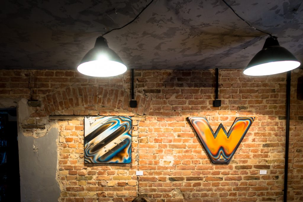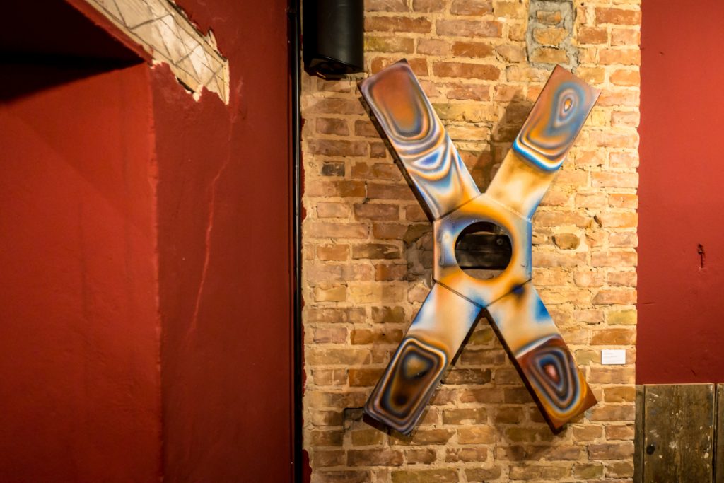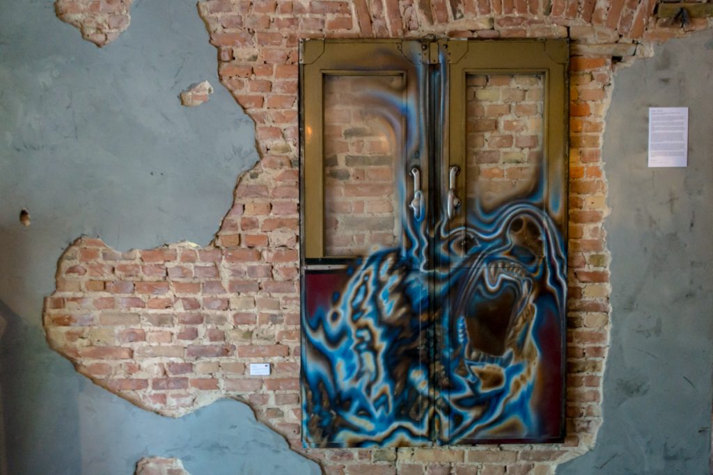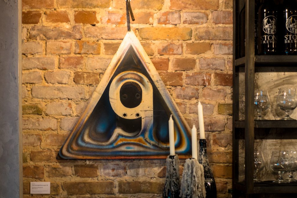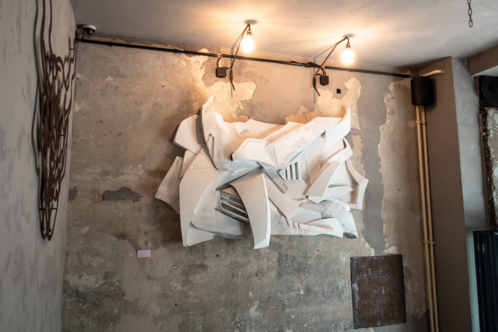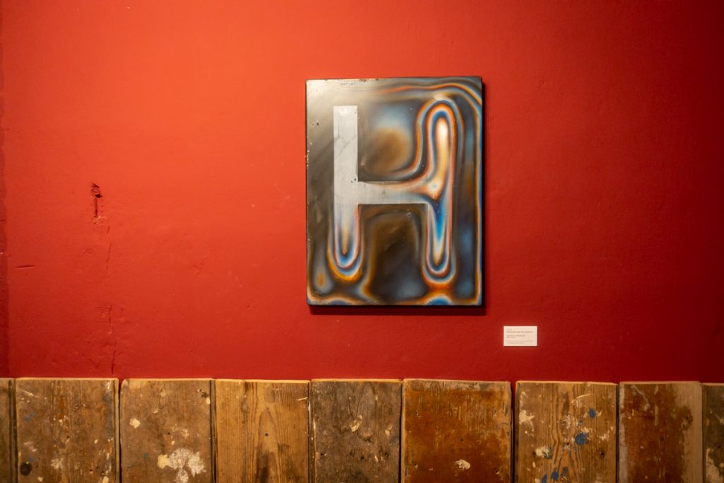 Snyder has been active as a graffiti writer since 1994 and has now his first solo exhibition with studio works. He uses elements from rail traffic such as signal boards or doors of an old S-Bahn train as substrates. These works have all the same color palette with blue, ochre and white and interesting color gradients. Aesthetic and original.
