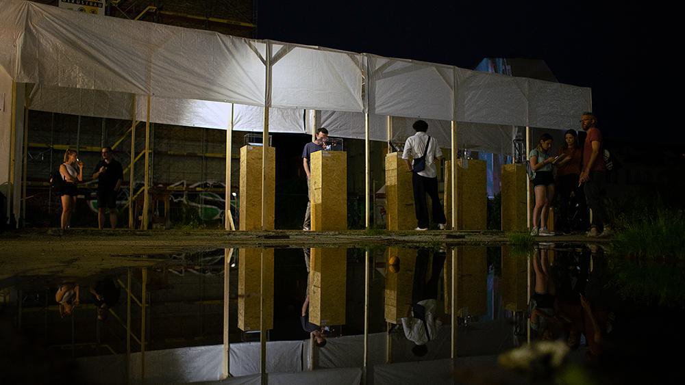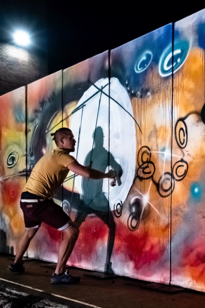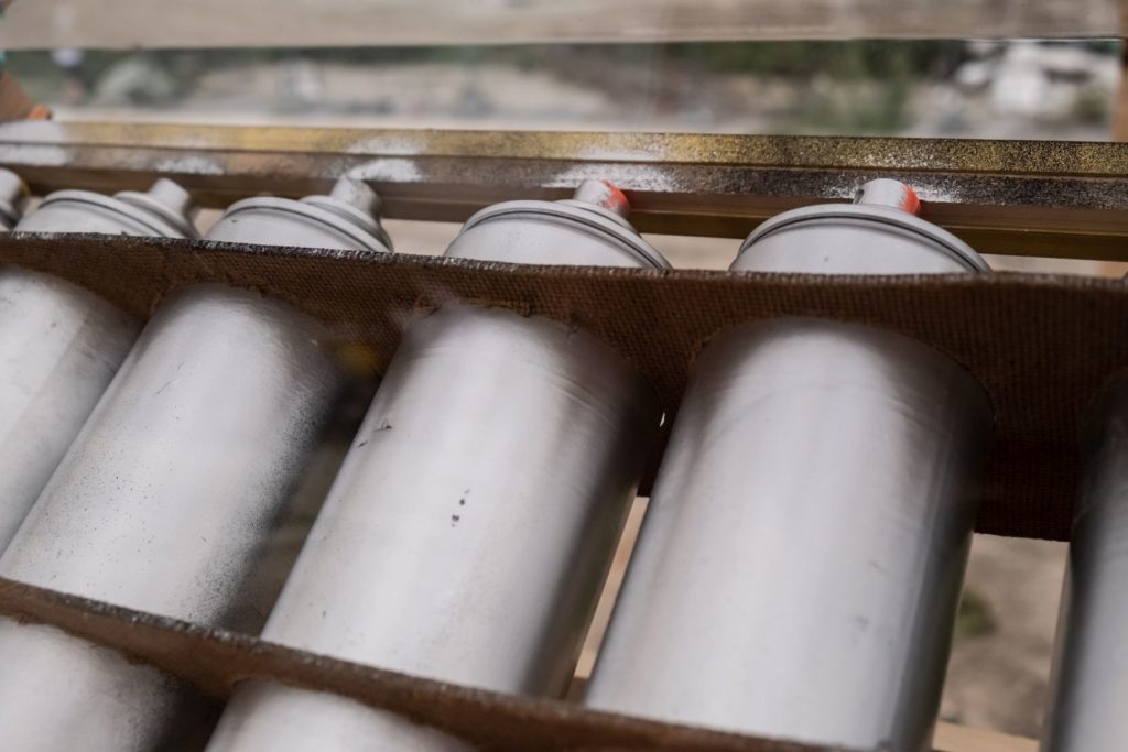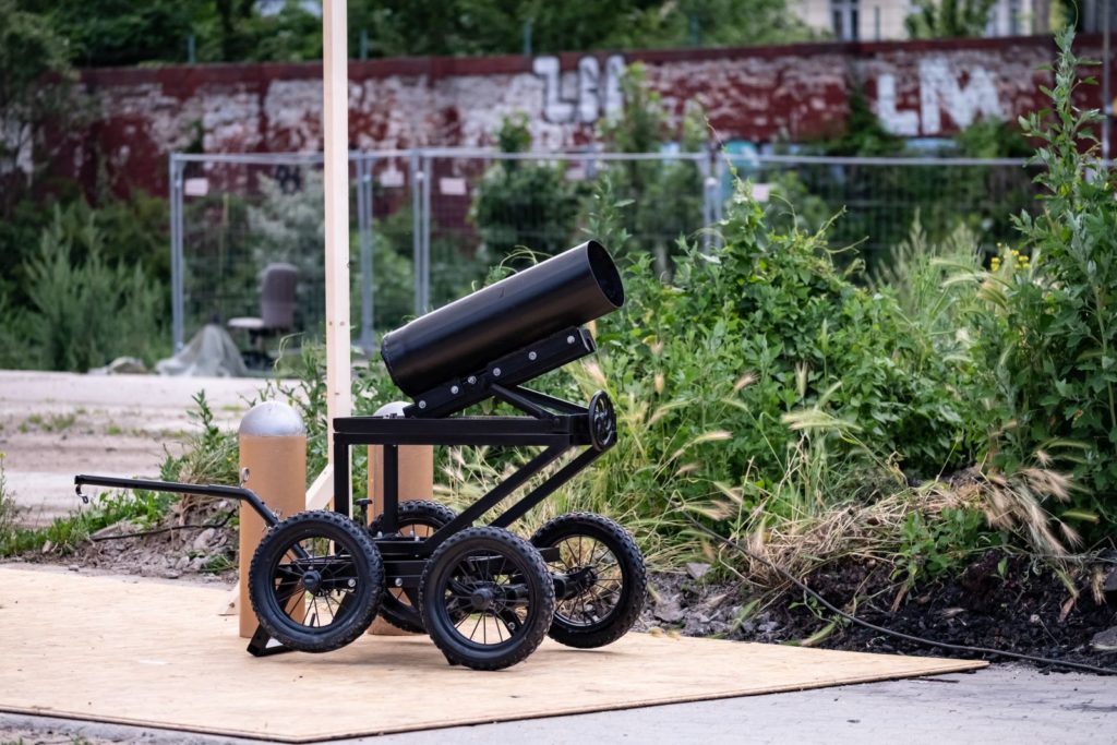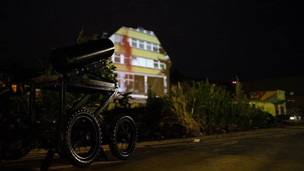 The Gallery of Tools, on a kind of catwalk on the wasteland, was exhibiting revolutionary inventions and visionary constructions in museum showcases, such as photographs and videos of homemade tools by DTagno and CAF crew, a “Chrominator” by TIK, and the noble homemade cannon by Peter Pirelli/Markus Butkereit. Historical and special spraycans and caps, borrowed from Wildstyle Ben, reminded of the first tools in the 80/90s. At night one could admire a short video “mapped” on a house wall, showing the cannon in action by Peter Pirelli/Markus Butkereit.