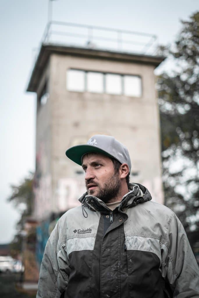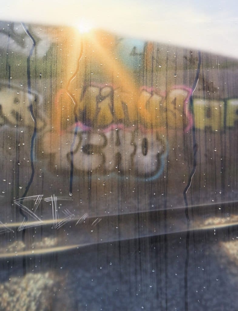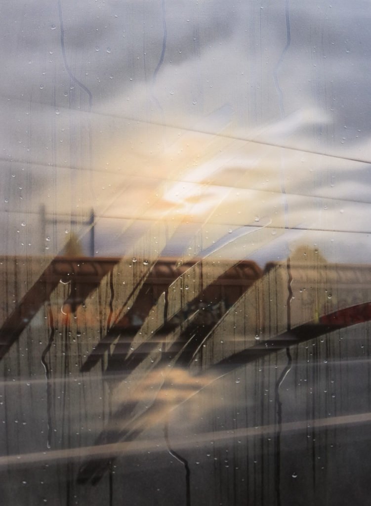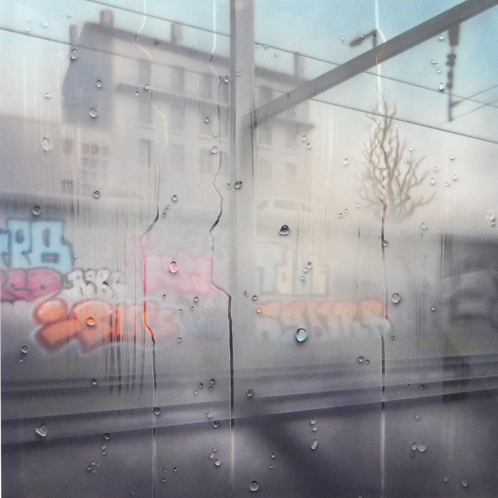 Mit 14 Jahren fing SAYPE (geb. 1989)an zu taggen und Graffiti zu sprühen. Das Lettering, die Buchstabenästhetik, legte er nach einer Weile ab und konzentrierte sich auf die Figuration. Er bemalte mit verschiedenen Writern und Künstlern auf Festivals einige Murals und malte zuhause auf kleinen Formaten weiter. Neben seiner Ausbildung als Krankenpfleger investierte SAYPE dann vor allem in die autodidaktische Arbeit im Atelier. Er experimentierte mit Sprühlack auf Leinwand und wechselte zur Airbrush-Technik, die er auch heute weiterhin anwendet. Seine technische Geschicklichkeit führte ihn zum Photorealismus. Landschafts- oder Stadtansichten als Hintergrund, auf die durch eine zusätzliche unscharfe Plexiglasschicht, wie durch eine beschlagene Fensterscheibe geschaut wird, und auf der, wie mit dem Finger in Dunst wie ein Kind gezeichnet, geschrieben oder getaggt wird. Wie der Blick aus dem Auto-oder Zugfenster an einem regnerischen Tag. Manchmal entdeckt man Graffitielemente im Hintergrund. Eine Art optische Täuschung und Hyperrealismus zugleich mit einer romantischen Note. Seine Malerei, die sich auch mit philosophischen Fragen rundum den Menschen und seiner Existenz beschäftigt ist für den Künstler “existentiell”.
