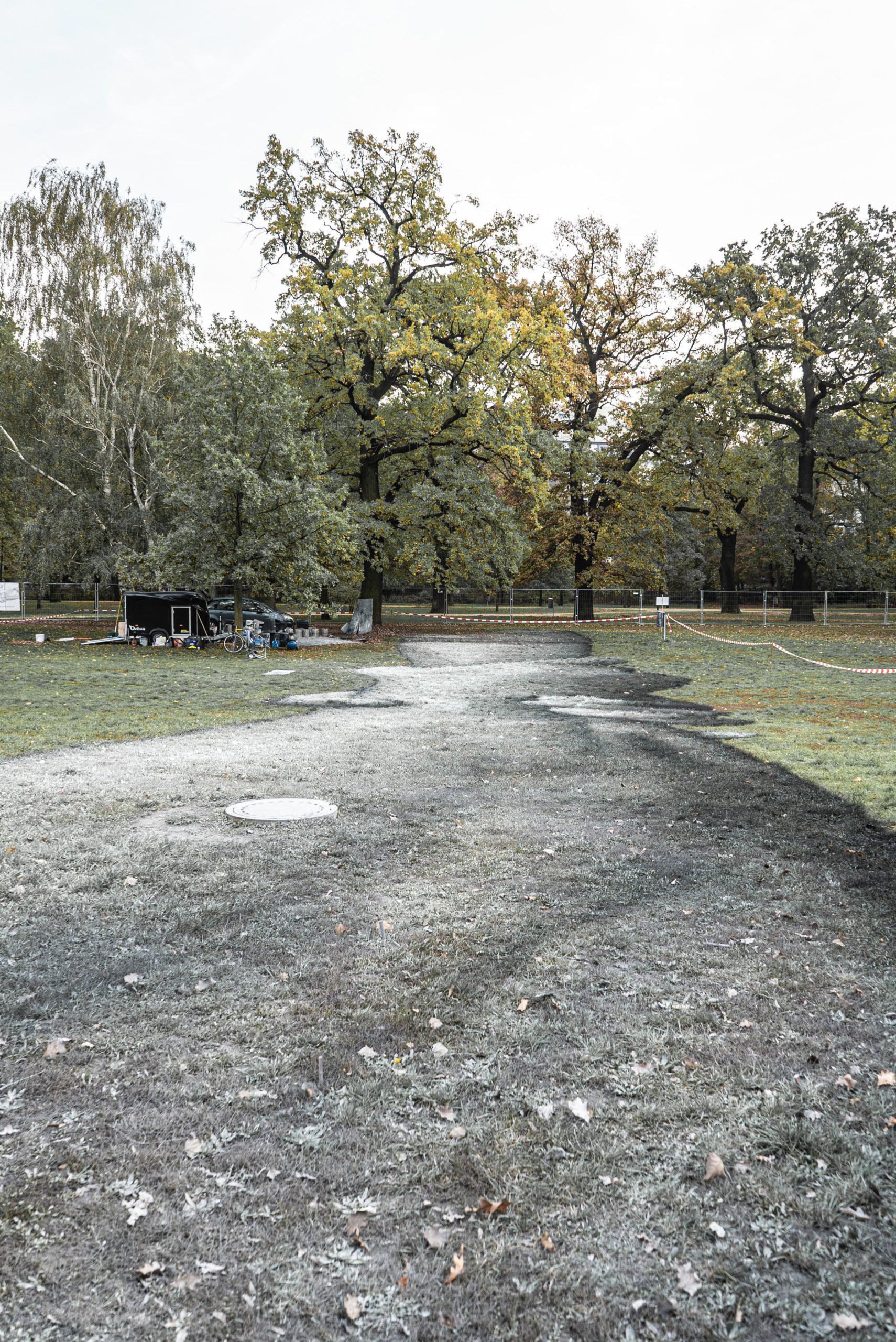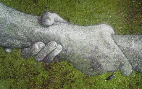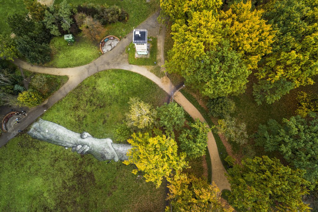 A giant biodegradable landart painting by French-Swiss artist Saype is pictured in Treptower Park, Berlin, Germany, Saturday, November 2, 2019. This fresco and a second one in a neighboring park have a combined surface of over 3000 square meters and were realized using biodegradable pigments made from charcoal, chalk, water and milk proteins. These art pieces are the fourth step of the worldwide project “Beyond Walls” aiming at creating the longest symbolic human chain around the world promoting values such as togetherness, kindness and openness to the world. (VFLPIX.COM /Valentin Flauraud)