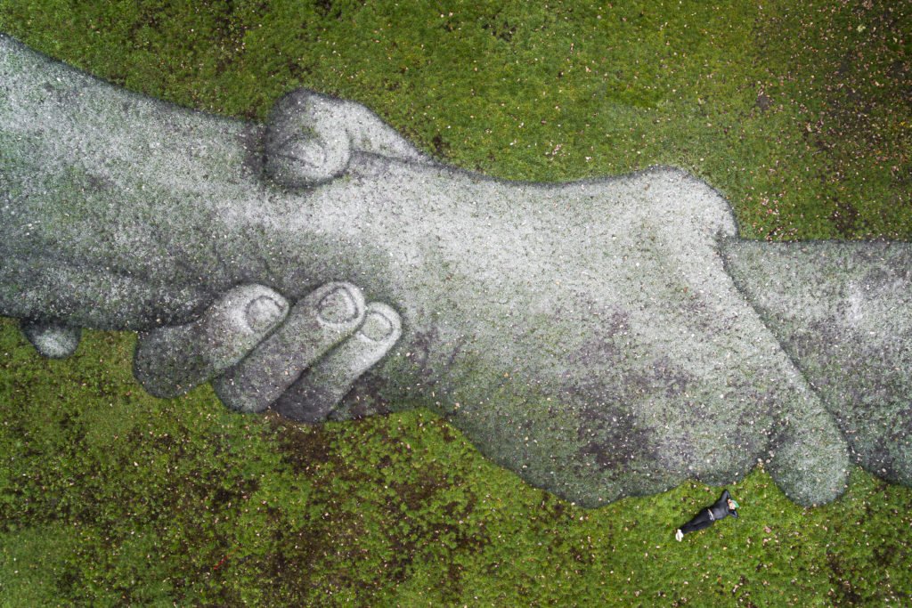 With the motif of holding hands as a sign of mutual help and support and cohesion, which he has photographed from thousands of people – whether celebrities, friends, colleagues or strangers – SAYPE then takes it as a model for the next monumental picture, reduced to grey tones. After that the artist can no longer assign the hands, they become anonymous and a universal sign for solidarity, an appeal to mankind.