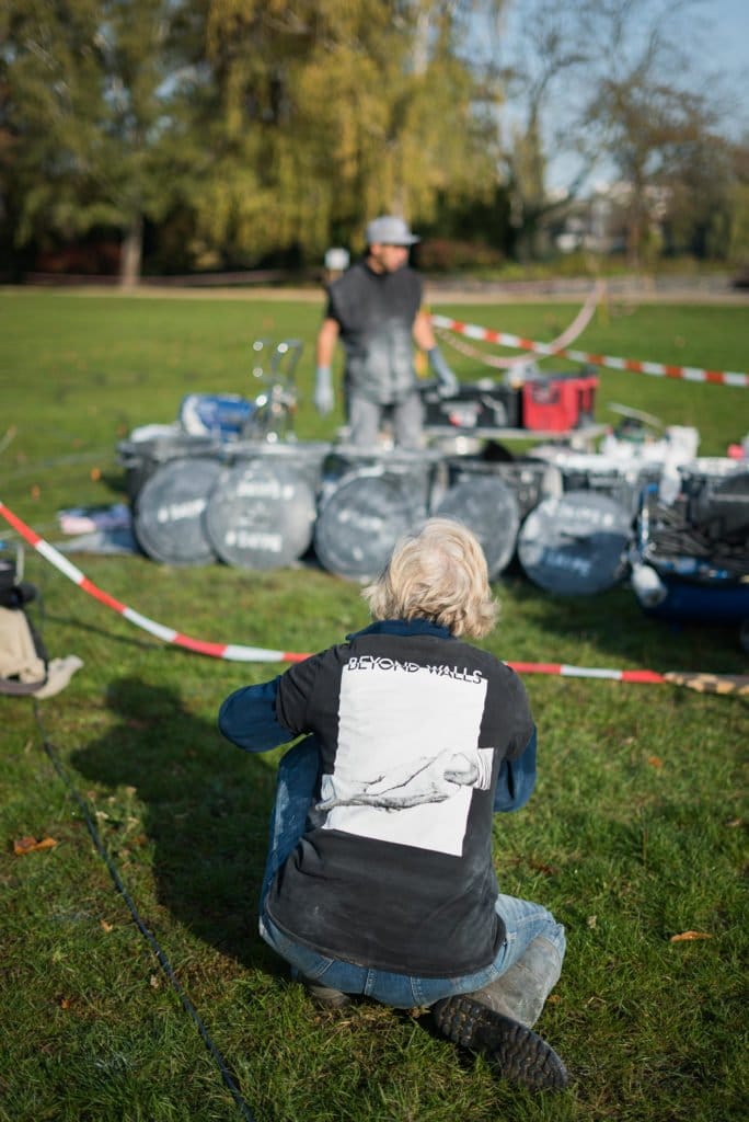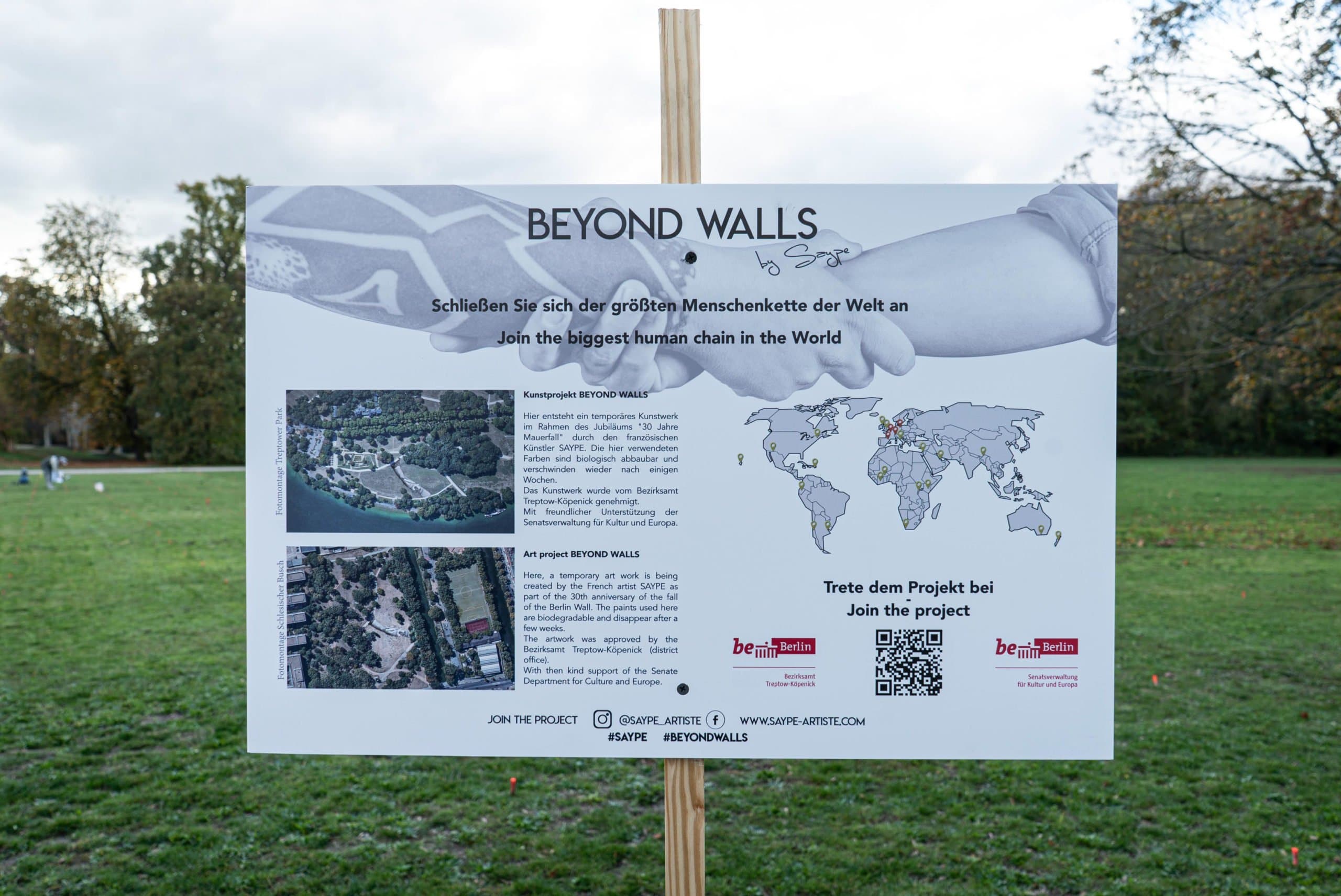At an art fair in France earlier this year, the French owner of the Urban Spree Gallery in Berlin gave SAYPE the idea to offer BEYOND WALLS to the celebrations of the city. It was to take four months until a district in Berlin agreed to participate, although the project was fully financed by the artist and supported by a letter from the senate of Berlin. Grün Berlin GmbH for the Gleisdreieck Park denied after weeks. For the Mitte district, an application had to be submitted to the art commission for public space, which was not accepted by an unknown jury and gave a negative answer after five weeks of waiting. The green strip at the Bernauer Strasse memorial and Schöneberg for two small parks were also not possible.