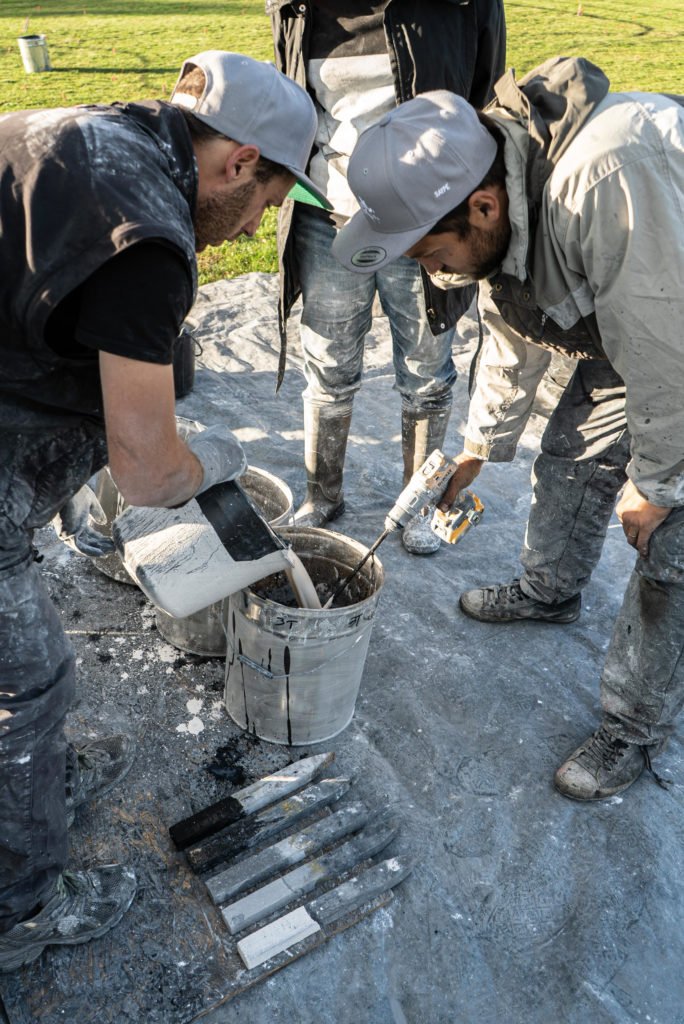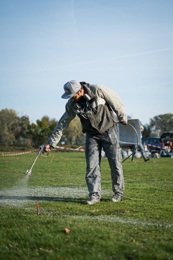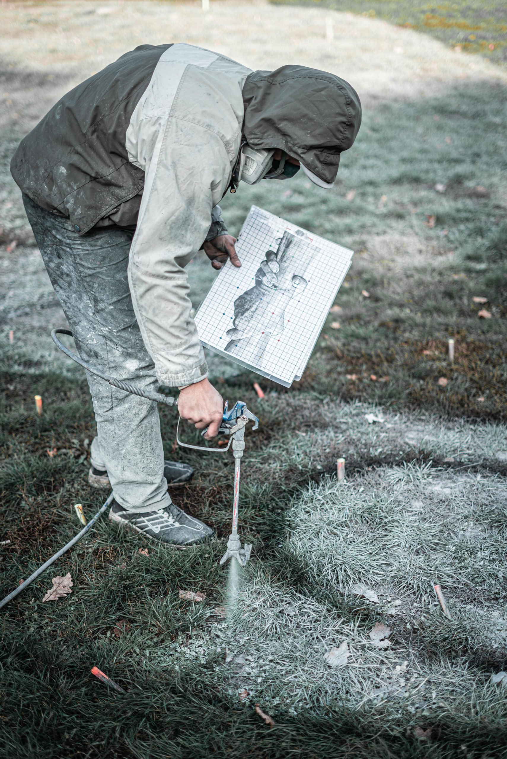SAYPE’s painting has been represented in urban art galleries for several years, such as the famous Speerstra Gallery in Geneva and Paris. SAYPE owes its roots, its approach to art, to graffiti culture, and despite a certain success in galleries, his studio work was no longer enough for him about five years ago. Grown up in the mountainous landscape in the Jura in France, in Belfort, SAYPE has a very special relationship to nature and the mountains. And so he came up with the idea to work with nature without having to give up his spraying technique and developed a new technique that allows him to paint meadows with harmless paint to create large-format temporary pictures, frescoes, mostly in grey tones. His recipe: a biodegradable paint mixture of lime, milk enzymes, coal and water, applied with the help of high-pressure cleaning devices. developed in his mother’s garden, which has supported and accompanied him for years. After about 3 weeks, the colour grows out again, leaves no traces and does not damage the grass or soil. Thanks to the drones technique one can admire his monumental frescoes from a bird’s eye view. The result is a temporary monumental Land Art artwork which can only live through photography and in its context of nature unfolds all its beauty, in the valley, next to woods, next to waters, in parks in the city seen from above, creating poetic images and a kind of “landscape art photography”.