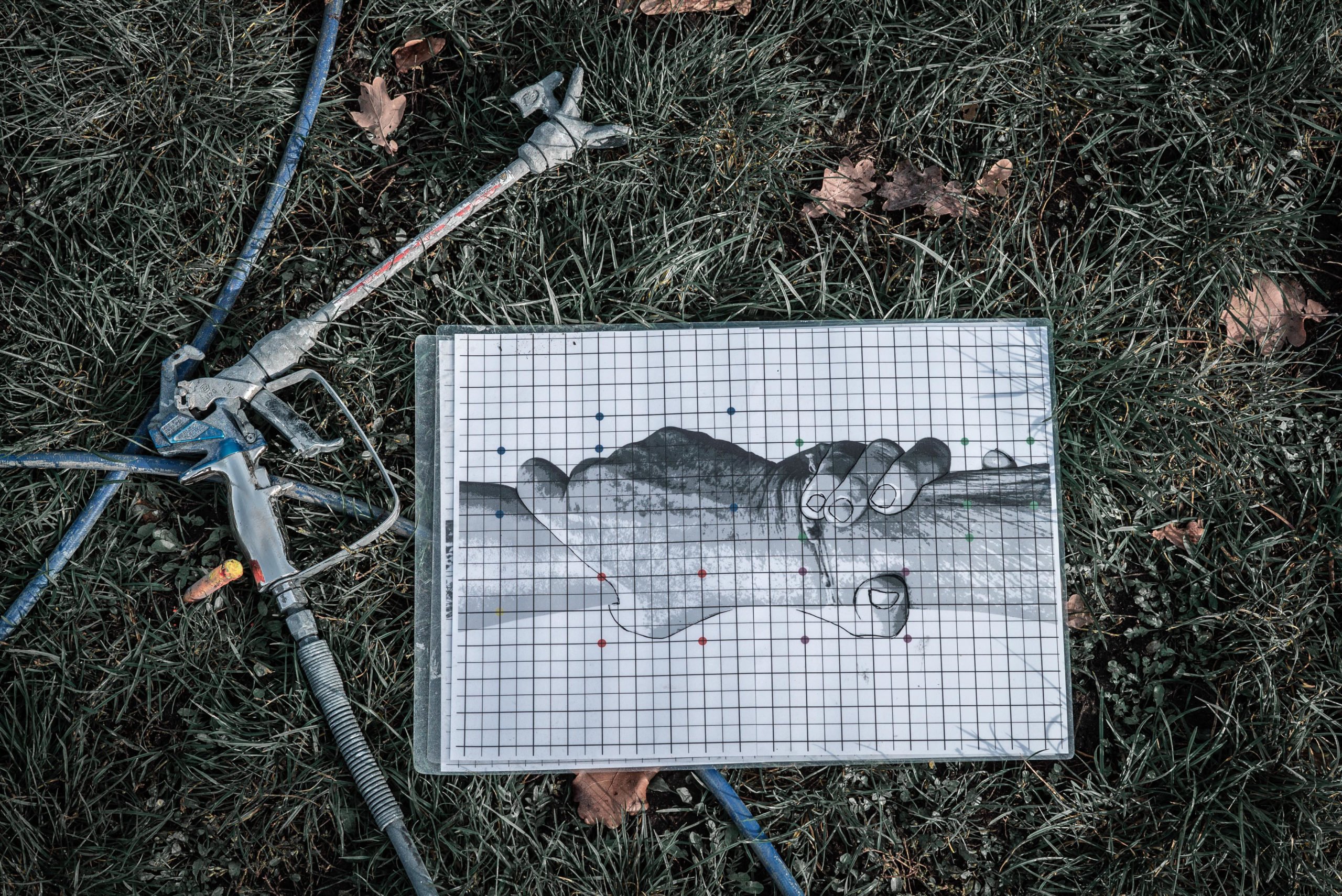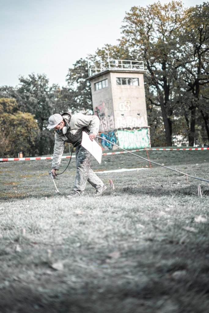 SAYPE’s Land Art ist gar unsichtbar, unfassbar vom Boden aus gesehen. Man erkennt nur dunkle Umrisse und helle Flächen auf der Wiesenfläche. Mit seinem Sprühgerät schafft er es auf großer grober Fläche feinste Schattierungen mit weiß, schwarz und drei Grautönen zu zaubern wie kein anderer Künstler. Nur er beherrscht das Rezept und die Technik. Er gilt als Urban Art und Land Art Künstler zugleich und man spürt, dass SAYPE’s Wurzeln in der Arbeitsweise in der Graffiti Kultur liegen, mit einer gewisse DIY-Mentalität: draußen malen, Sprühtechnik beherrschen, experimentieren, Werkzeuge selbst bauen/umfunktionieren, schnell und gut auf großen Flächen arbeiten und natürlich immer größere Bilder schaffen wollen, Menschen erreichen und Anerkennung schöpfen.