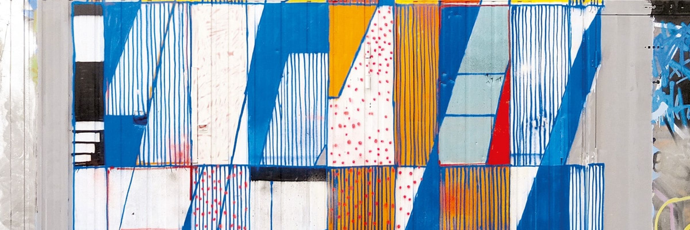 In the 2010s, BOE continues his research, repeatedly defining a rectangular landscape format on a wall surface for the background, which he paints at first in one color and grounds it as a kind of canvas for his compositions in urban or rural environments. In 2015, he starts a project with the aim of compiling the results of his work in a publication. At the beginning of the project, he sets some parameters to create a certain atmosphere with them. For example, he defines a canon of colors that he draws on in each piece in a different composition. And he establishes other stylistic devices, such as some shape parameters and the rectangular outer shape. In the abstract series, he is concerned with “creating a raw, warm atmosphere, letting approachable simplicity prevail and making the inner soul resound” through the choice of mediums and the joy of experimentation. He was also inspired by painterly aspects of his own photographs taken on forays through various cities and by the warm analog sounds of rock steady and high life music from the 60s/70s. In the publication “No condition is permanent”, published by Hitzerot 2019, he presents these works alongside a series of photographs in three booklets.