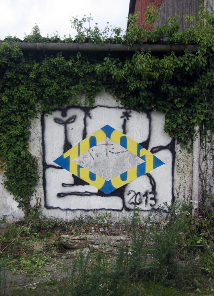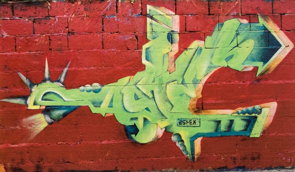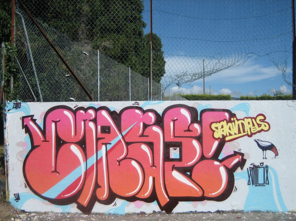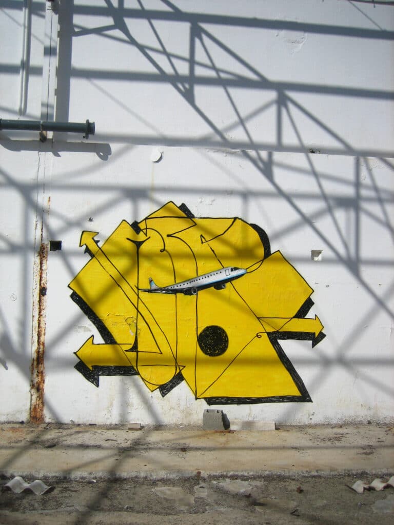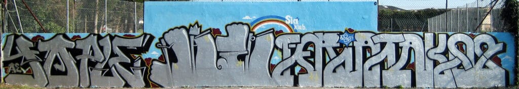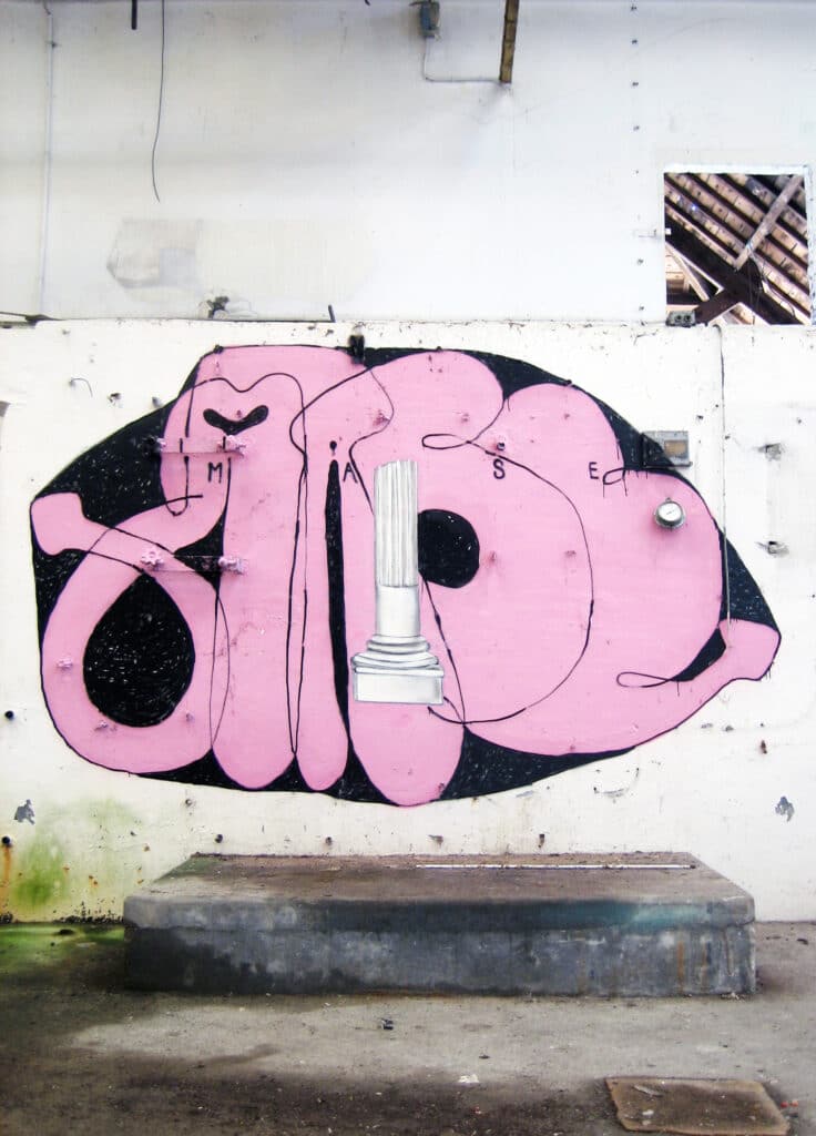 In the early 2000s, there were already a number of writers around the world who were rethinking graffiti and developing new kinds of styles. On the Internet, Enroc followed these developments and networked at the time through websites like aero.fr, fat cap, fotolog and streetfiles. From 2007, Enroc changed his style and intentionally painted failed “innocent” letters, as he calls them, with sometimes poorly drawn lines, and added figurative motifs over his lettering with a kind of sticker effect. These realistically painted motifs, such as plants, airplanes, classical architectural elements, or antique sculptures, appear strangely, bizarrely displaced on his pieces because they had nothing to do with the graffiti context. In this phase, Enroc deliberately did not want to create reproductions of well-known classical graffiti codes, but rather to break codes, experiment, create an anti-style, with simple typographies, representational motifs taken out of context, and thus create atypical pieces, images, hybrids of graffiti and painting. The outlines of the pieces were no longer only horizontally laid out like a lettering, but partly oval or misshapen, or they were surrounded by a painted frame. Single simple small drawn letters of his pseudonym were placed here and there in the large letters.