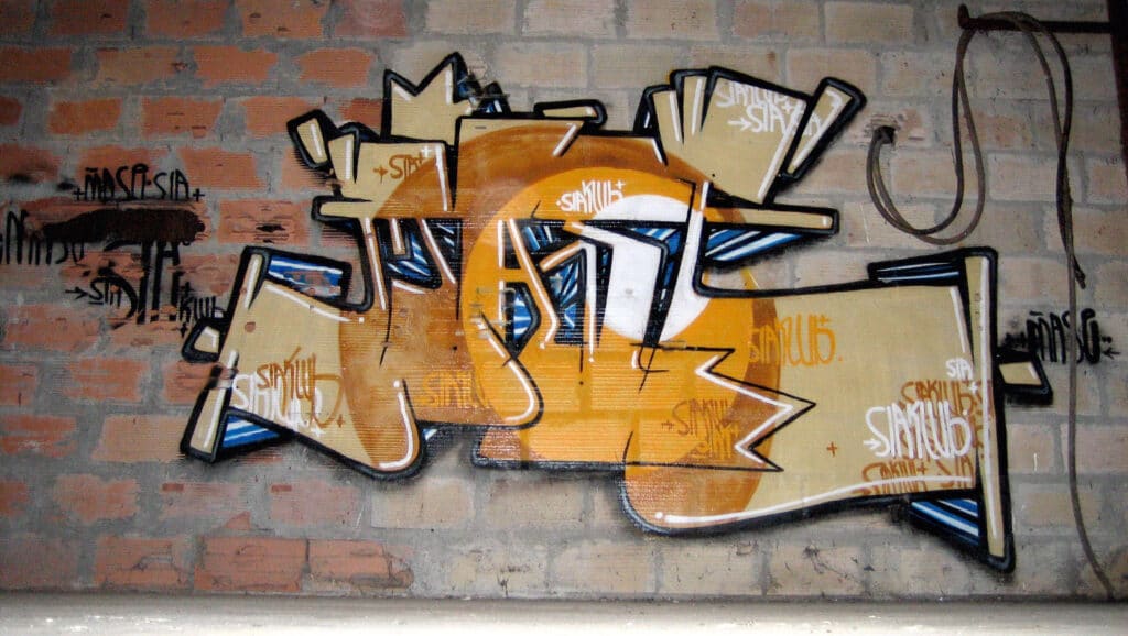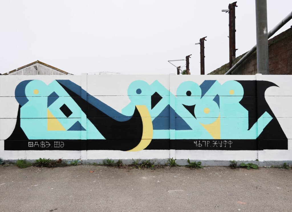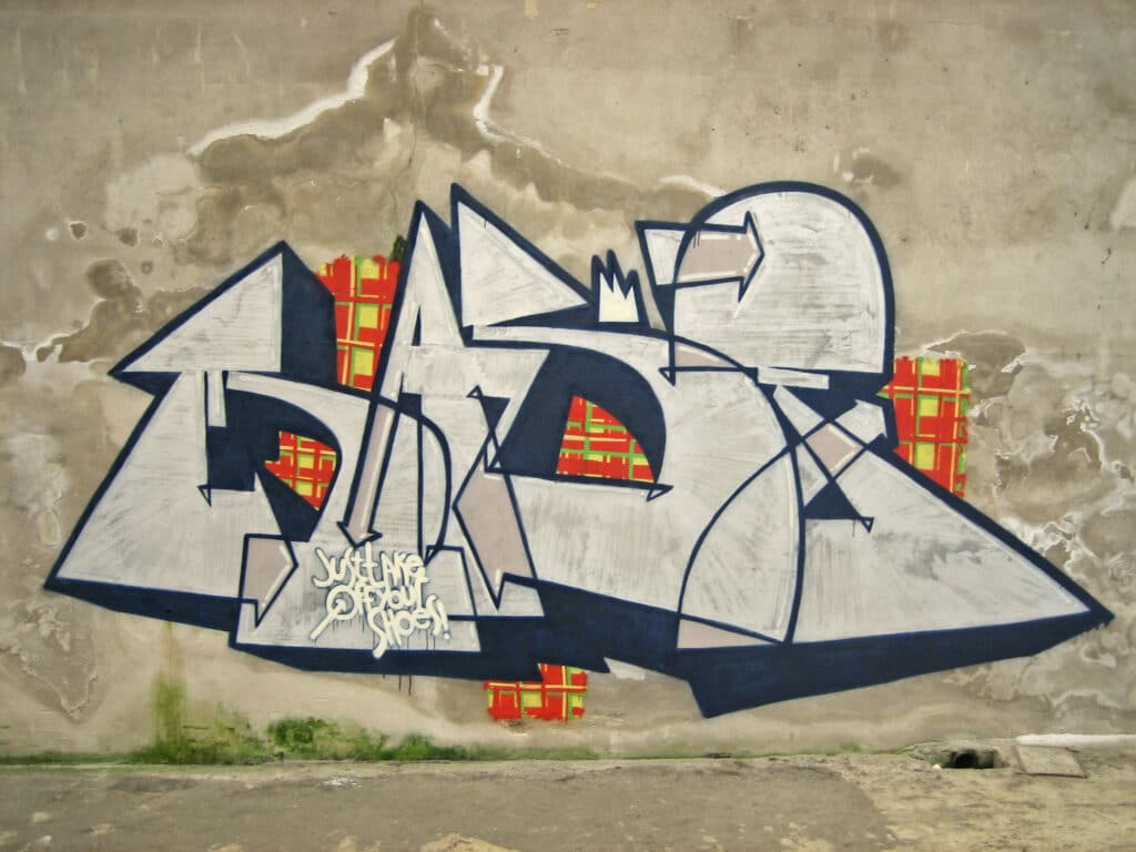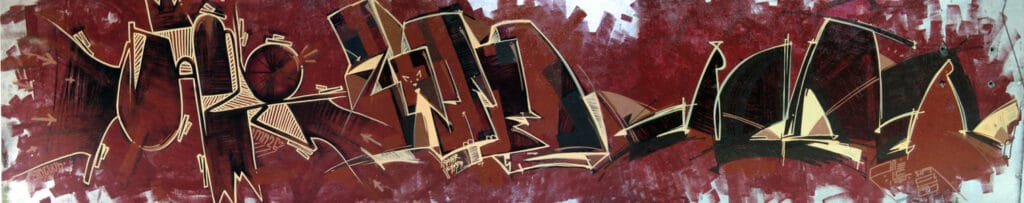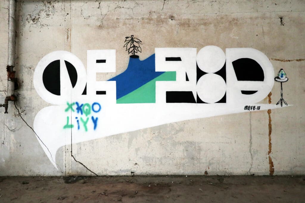 At this time, Enroc increasingly constructs his letters with geometric angular and round voluminous forms that are chained together, drawn from a single stroke as in cursive writing and barely decipherable. The play with emptiness and fullness, outer form and inner forms of the letters blur the logic and legibility of the typeface images. He also integrates into his compositions small simple printed letters, like inscriptions, like scratched graffiti, and letters from other alphabets such as the Cyrillic alphabet or Korean characters. Inscriptions and new letter forms that seem partly antique, cryptic, bizarre and in this context futuristic as well. Enroc likes to play with trace blurring and visual misdirection by using other letters for his writer’s name, such as using the next letter in the Roman alphabet of his four letters of his name for example, thus creating a new name. Since 2014 Enroc likes to integrate the Nike logo in some of his pieces. As a distinctive feature for everyone, it is used here as a pure form, which with its sweep also reminds of the typical arrow or debauchery of a letter in classic graffiti.