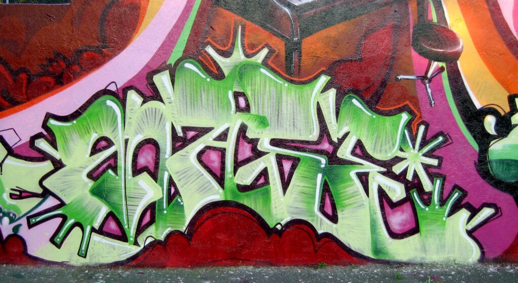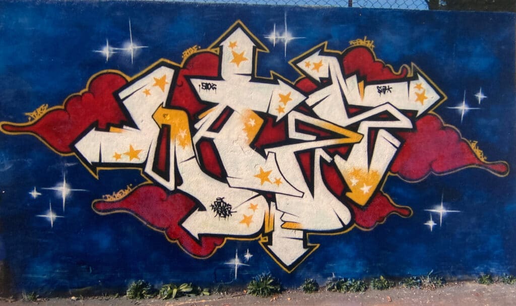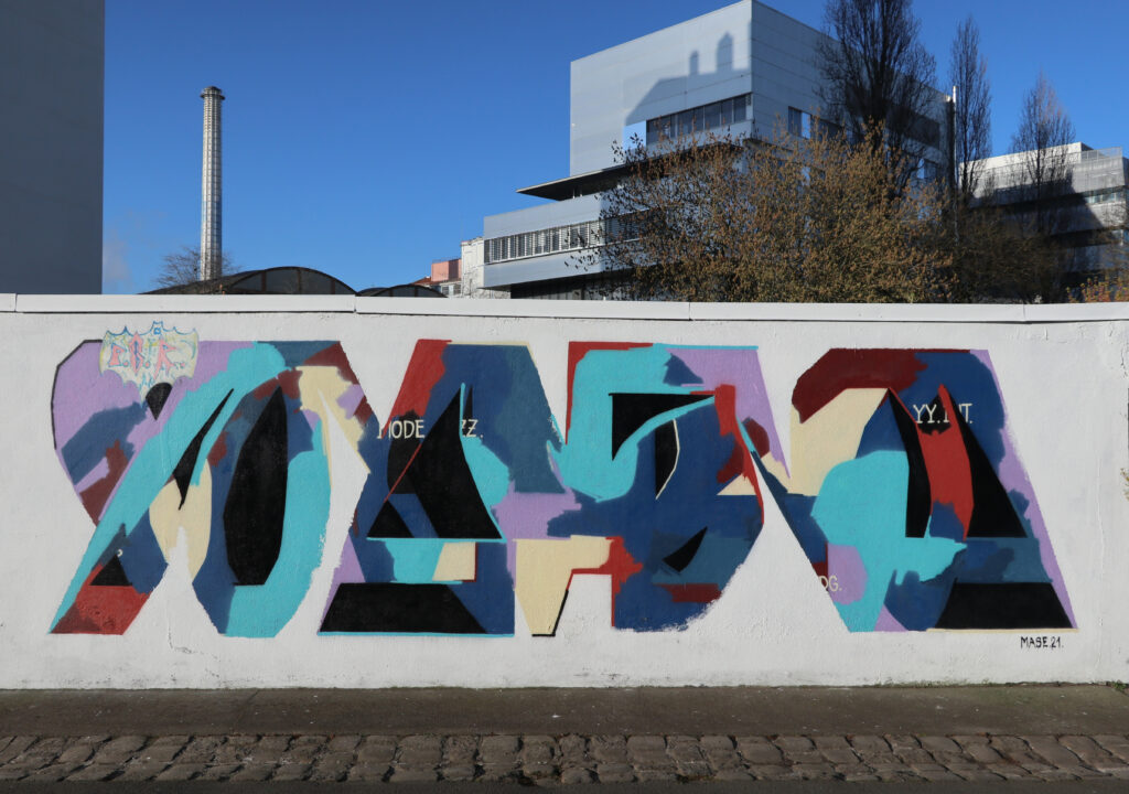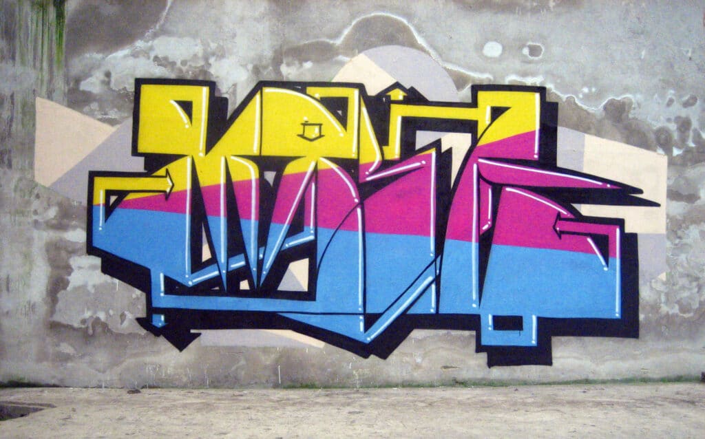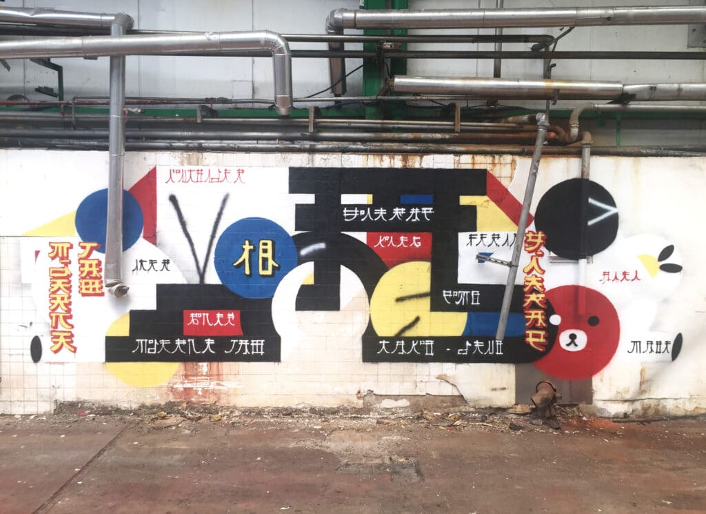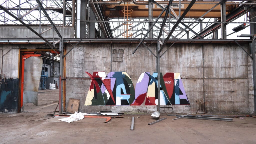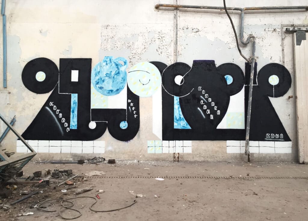 Since 2019, the forms of his letters in his pieces are more open, almost without outlines, only the inner surfaces are filled abstractly with different colors. He finds his way back to simple shapes in the style of throw ups, which he appreciates a lot with their quick, spontaneous gestures in execution. Enroc likes to work with accidents during the execution on the wall of a previously sketched piece. Because he always goes to the wall with a black and white sketch in his hand, draws a lot, on paper or even on a pad, for which he also allows his intuition and spontaneity. For his wall paintings, he has developed his own mixed media technique and works with wall paint, brushes, rollers, car paint and spray paint. He used to mix colors with a lot of white, so he often painted with pastel tones. He still appreciates Black-and-white works very much and today he is sometimes advised for the color choice from a Japanese book he owns, which suggests various color combinations of three to four colors.