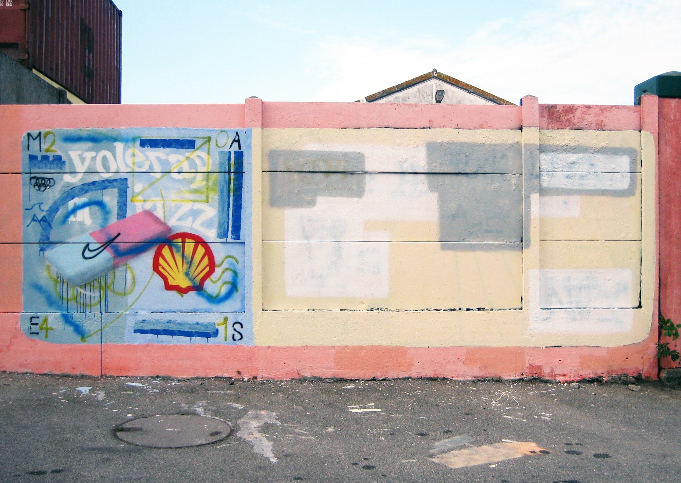 In the following years, Enroc continues to experiment and realizes many works, some partially appearing like a montage, with elements from naive painting or pop art. The composition of surfaces with patterns, abstract color gradients, figurative representation of objects like the vase, which stands for letters, or the integration of logos from our contemporary everyday life, like from Nike or Shell, form picturesque images with simply held forms and recognizable quotations from our Western culture and partly without clear, legible letters.