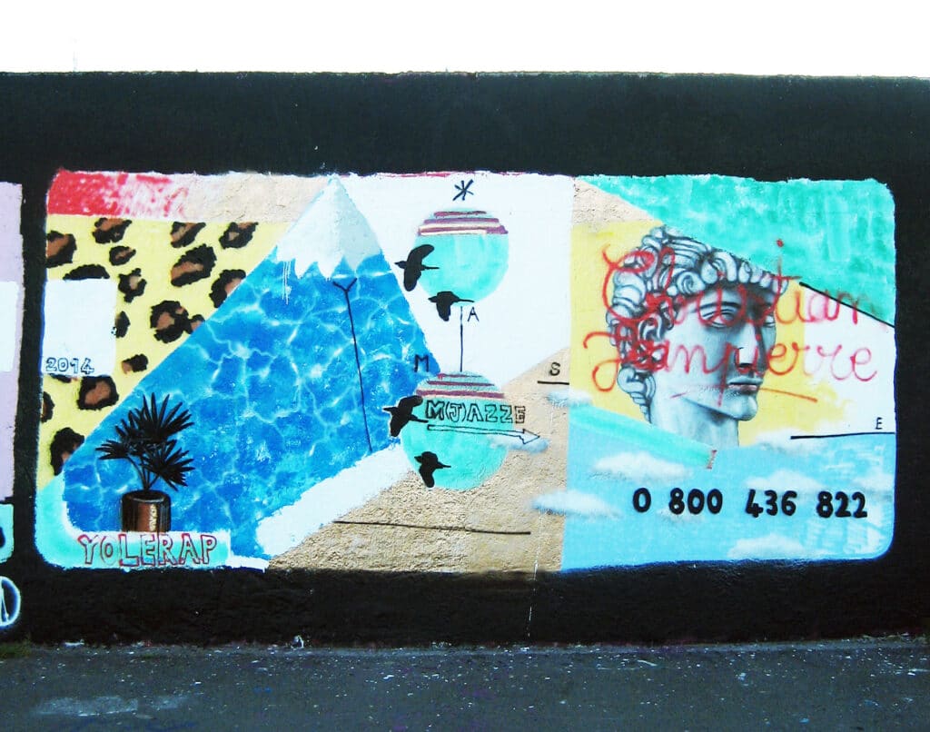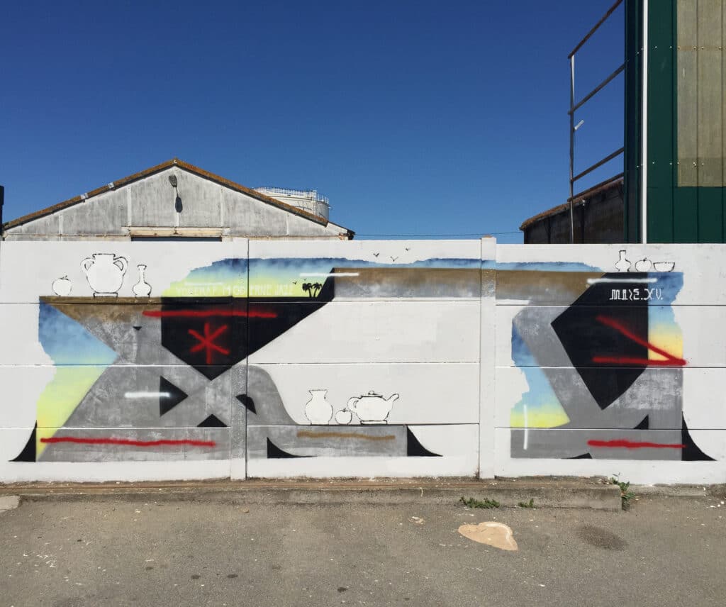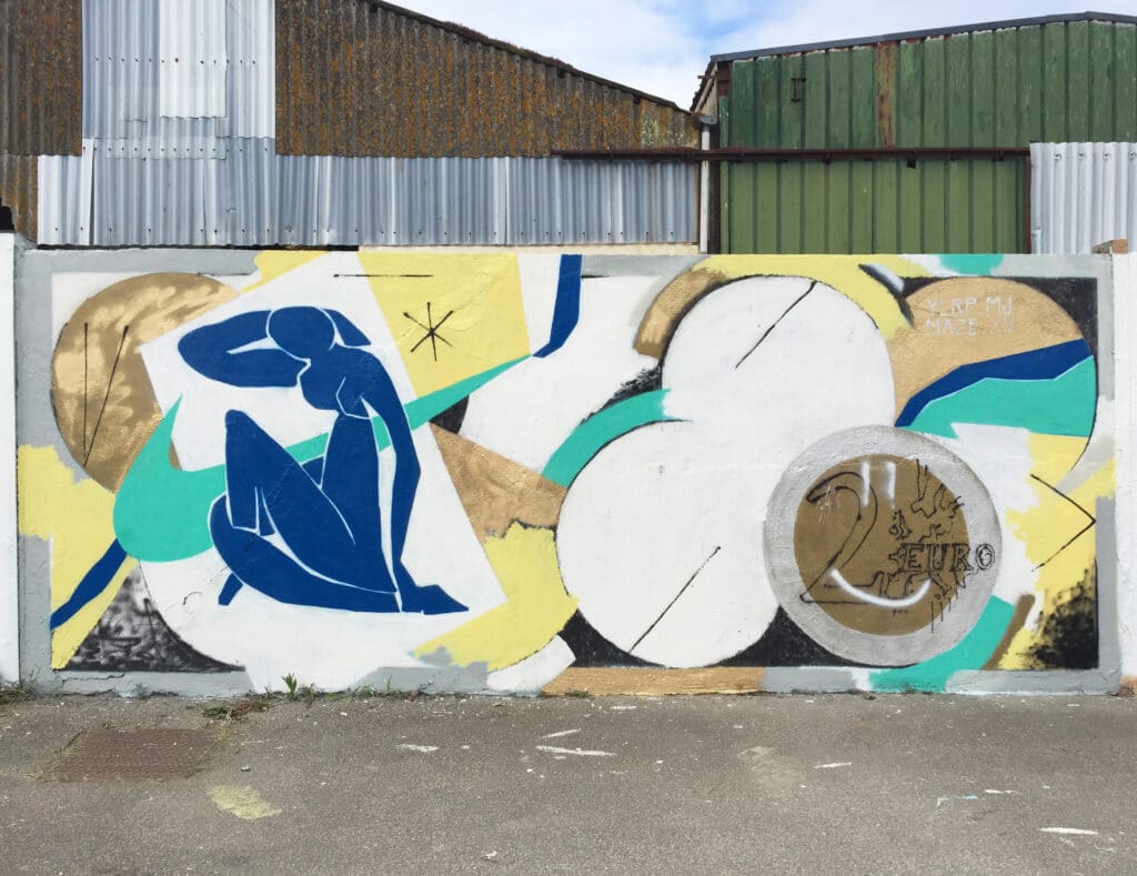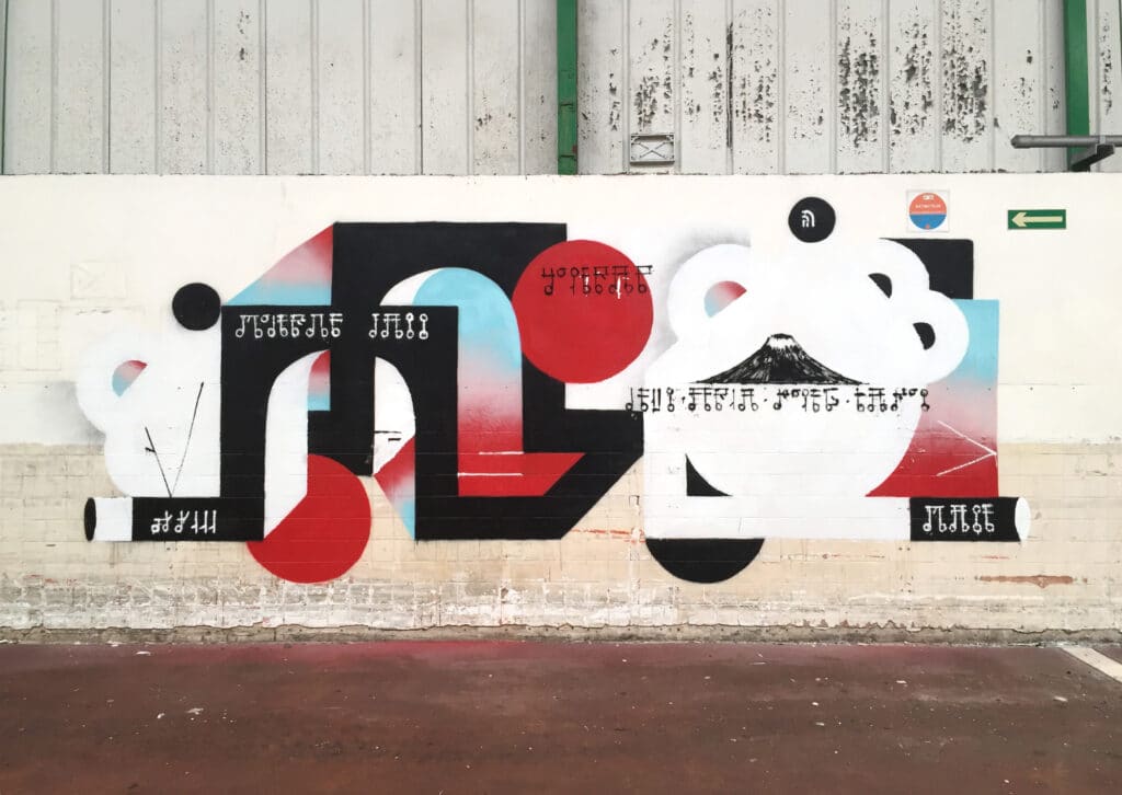 After 2013 Enroc painted even more experimental. The legibility of the letters interested him less and less, his pieces were increasingly only about shapes and motifs. For this, he also liked to fall back on kitsch, was inspired by random images from the photo platform tumblr, used ornaments and simple figurative representations, such as the motif of the vase, which appears again and again in his work to this day. He also added quotes in the form of motifs from classical antiquity, such as columns, or classical modernism, such as the world-famous silhouette by Matisse ” Nu bleu“. The French artist Matisse continues to be a source of inspiration for the French writer with his planar coloring and tense lines, playful pictorial structure, lightness of his pictorial themes and, in his late work, his concentration on the essential. Just as the play with emptiness and fullness is an important theme in the silhouettes, the paper cutting, it is also a theme in Enroc’s work. Modern painting inspires Enroc for his visual language till now, even if, according to him, he has not dealt with it in depth. But his work continues to revolve around the letter, which he constructs and deconstructs in his pieces, abstracting it, stylizing it into geometric forms or even making it disappear, all in favor of an experimental picturesquely aesthetic.