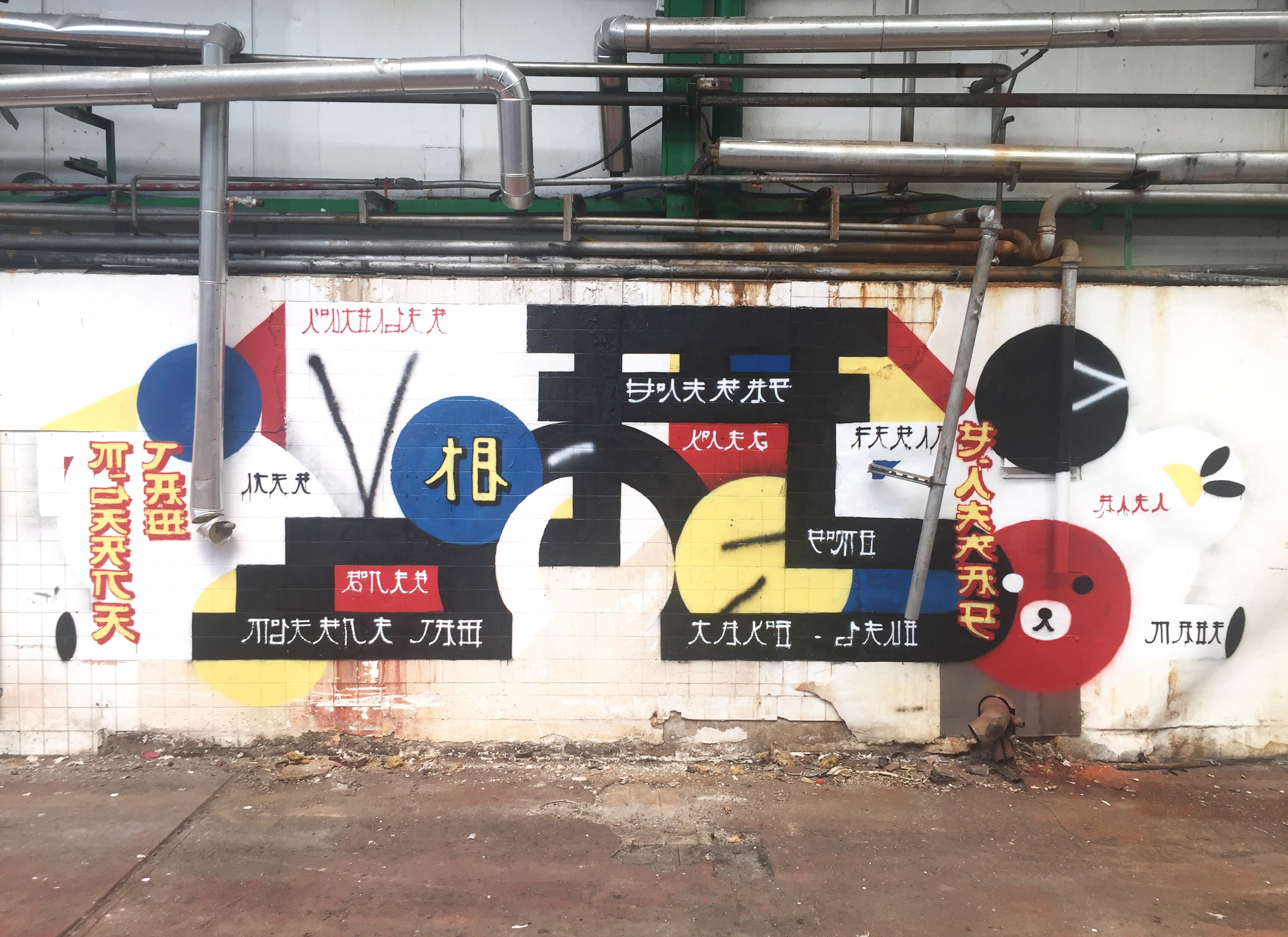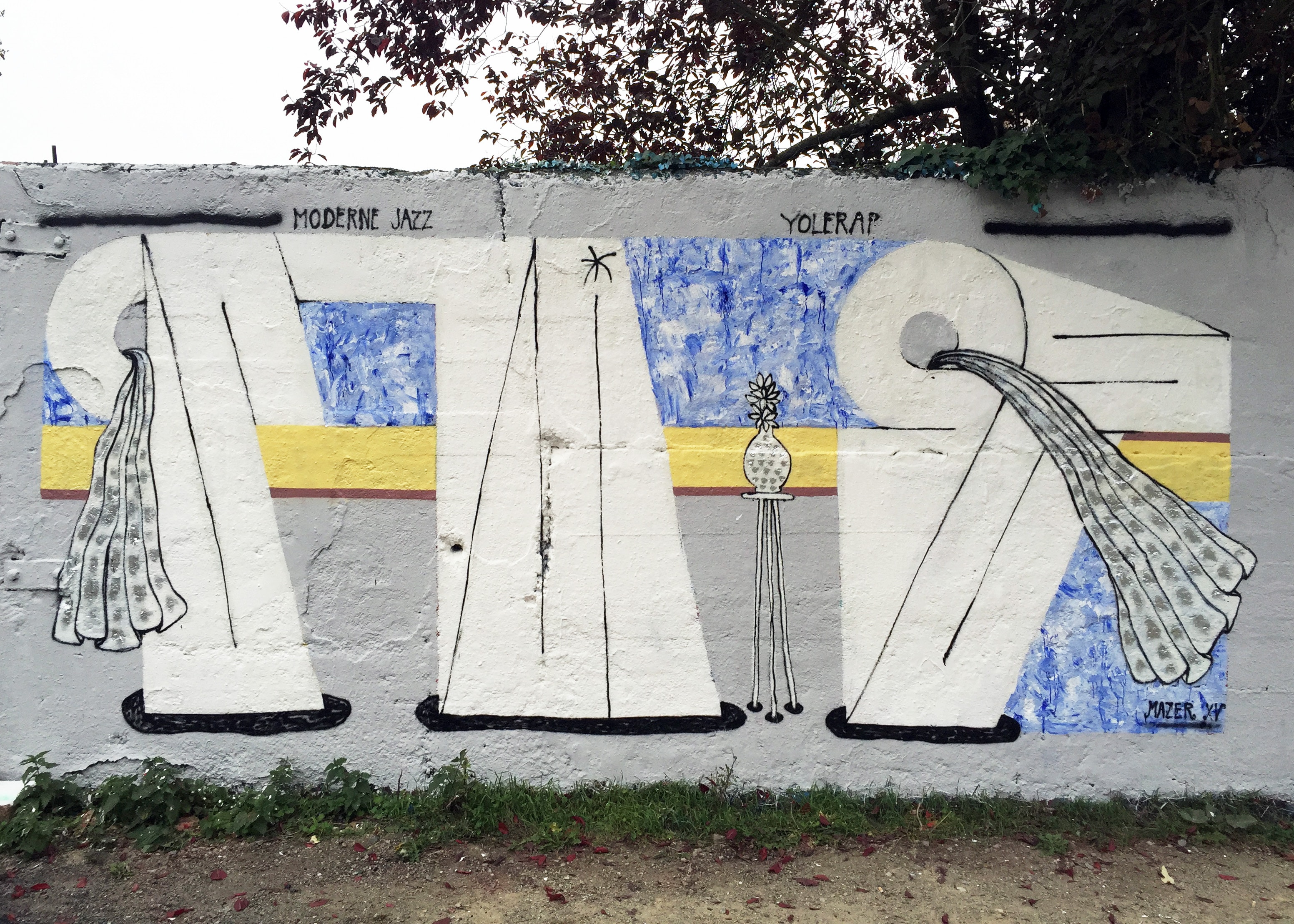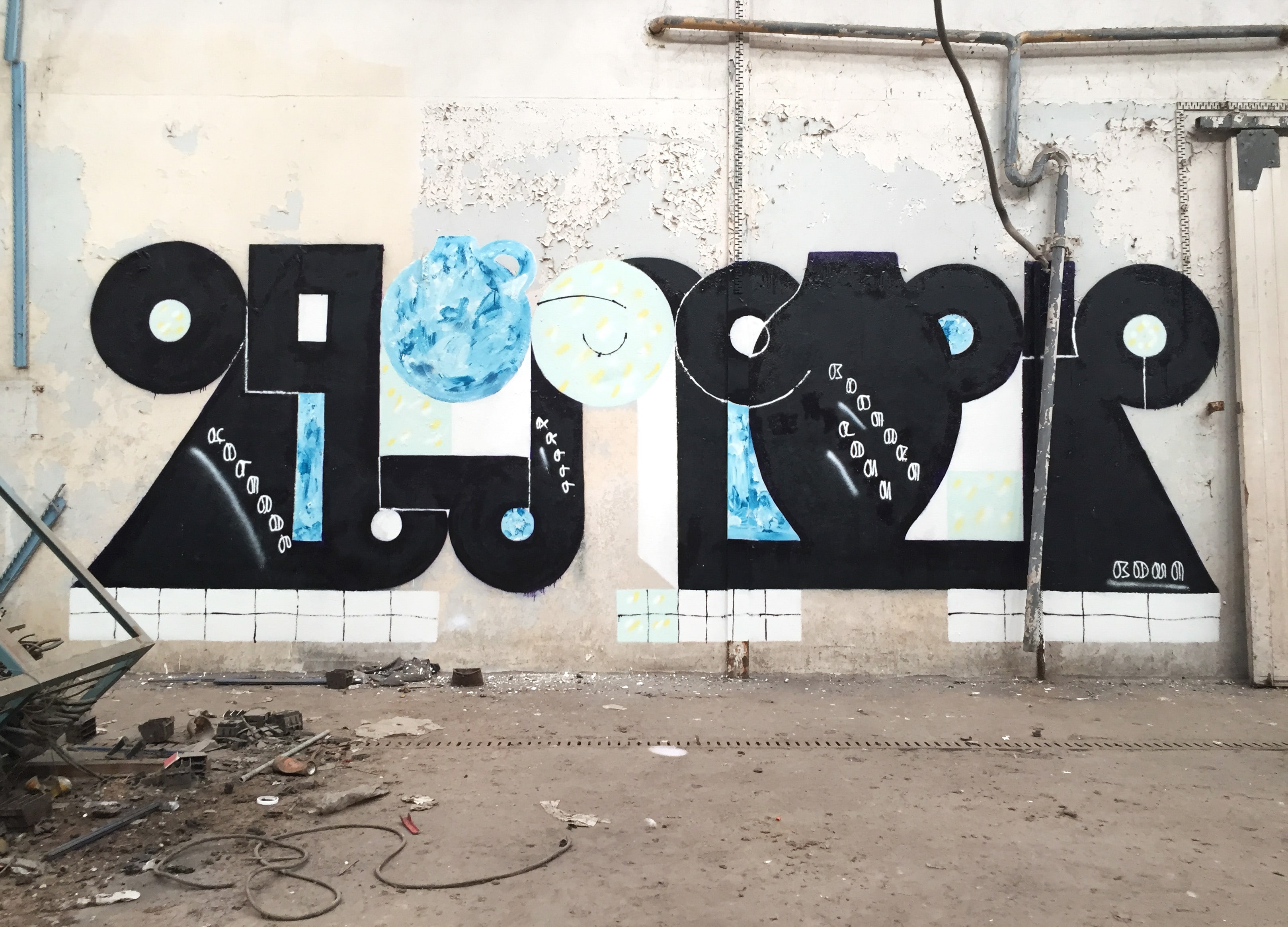 After 2013 Enroc painted even more experimental. The legibility of the letters interested him less and less, his pieces were increasingly only about shapes and motifs. For this, he also liked to fall back on kitsch, was inspired by random images from the photo platform tumblr, used ornaments and simple figurative representations, such as the motif of the vase, which appears again and again in his work to this day. He also added quotes in the form of motifs from classical antiquity, such as columns, or classical modernism, such as the world-famous silhouette by Matisse ” Nu bleu“. The French artist Matisse continues to be a source of inspiration for the French writer with his planar coloring and tense lines, playful pictorial structure, lightness of his pictorial themes and, in his late work, his concentration on the essential. Just as the play with emptiness and fullness is an important theme in the silhouettes, the paper cutting, it is also a theme in Enroc’s work. Modern painting inspires Enroc for his visual language till now, even if, according to him, he has not dealt with it in depth. But his work continues to revolve around the letter, which he constructs and deconstructs in his pieces, abstracting it, stylizing it into geometric forms or even making it disappear, all in favor of an experimental picturesquely aesthetic.