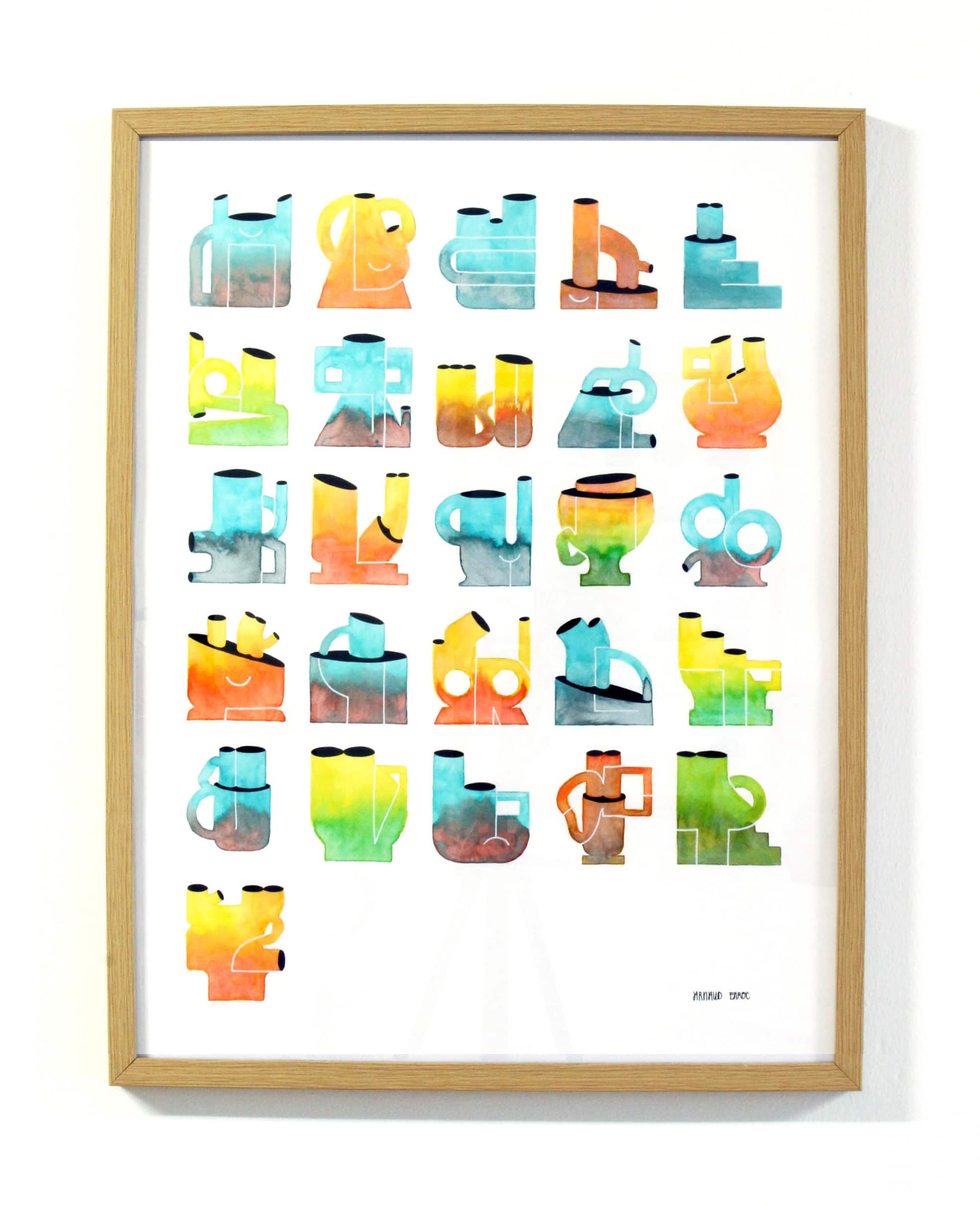 In 2017 Enroc developed the reduced form of a car with rectangles and circles (for the wheels.), which he used in some of his pieces. The wheels gave Enroc the idea to animate them with a software on the photo of the piece. He wanted to make them rotate and thus created his first GIF animation. Later, he achieved more animations with balls rolling along his pieces as if on a track. This new playful digital medium resulted in the creation of specially designed works on the wall: in which all the abstracted letter forms were linked together and constructed so that the ball could roll perfectly along the shapes up and down as if on a “roller coaster” in the painting.