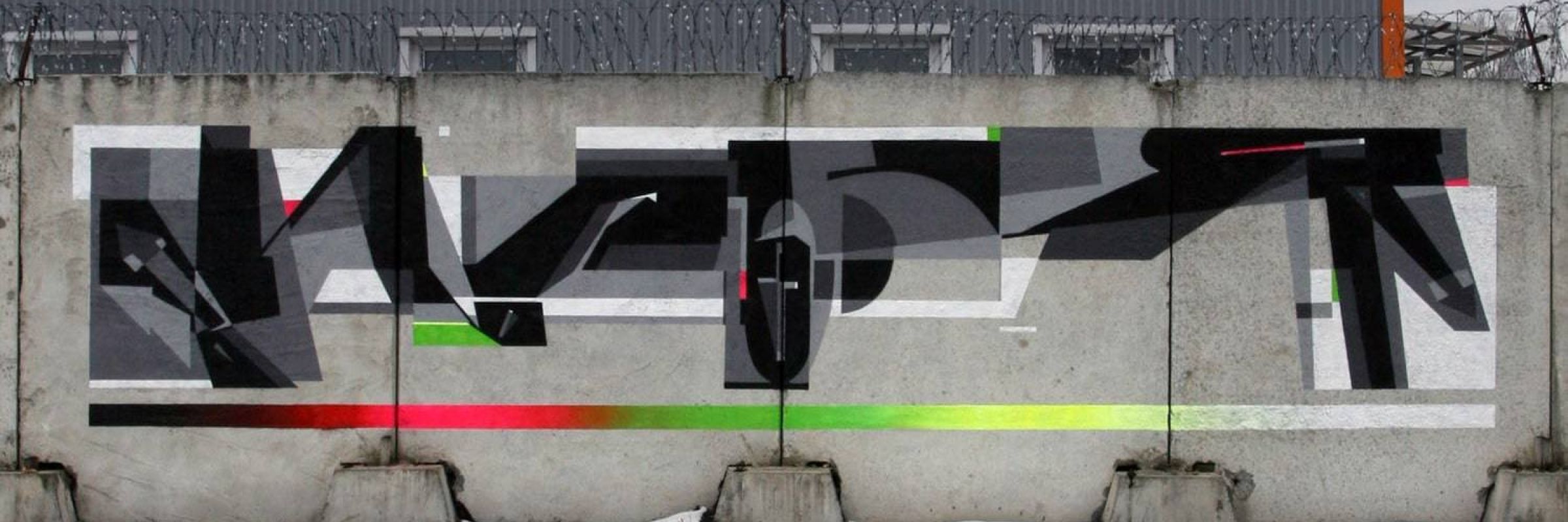 In 2006 SLAK met PETRO the time first when he was in the PSY crew. PETRO had organized a group of writers before in 2004 with MBOS and MAYPE. In 2008, he invited SLAK to join their team, it was called AES – Aerosol Systems. Later more members joined like Vedro and Sugar18. The name was changed into Aesthetics group along with changes in style and a turn towards abstraction around 2015. PETRO and SLAK decided to work together, because it was logical in terms of style and a great coincidence of similar views.Their similarities lie in the same artistic formal language they use for their graffiti and studio works since more than ten years now: geometry. From the aesthetic and ideological point of view, the duo has passed a way from classical graffiti to constructivist post-graffiti. Usually their works combine aesthetic aims, visual experiences of both artists with a constant desire to expand knowledge. They developed a unique style keeping an authorial approach in all their art works, not distinguishing the ones created on the street, for exhibitions in galleries or commission works. Their practice include wall painting, muralism, paintings on canvas, digital illustrations, graphics, collages, etc.