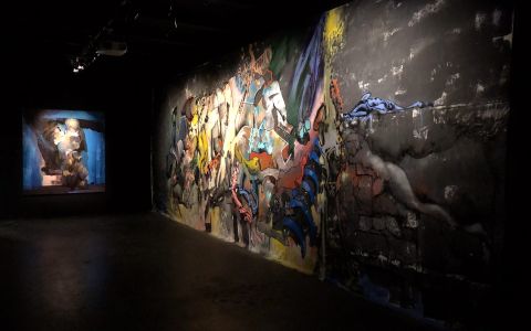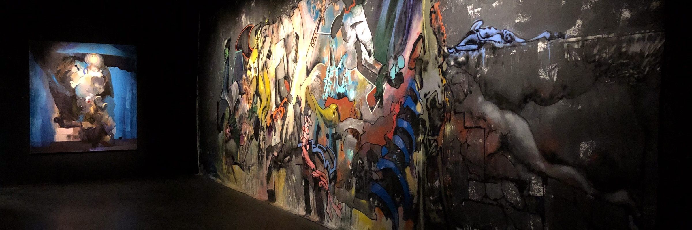 The new solo exhibition presents over 25 canvases created in the studio, as well as a linen measuring 3.40 by 10 metres, which he created outside on the wall of Urban Spree three days before the opening. Just as he usually paints his murals, i.e. spontaneously and freestyle with wall paint and spray paint in a few hours, the “Hallbild” was created outside and then moved into the interior, into the second exhibition room, the dark room of the gallery. In this way, he manages to integrate his wall painting into the exhibition context.