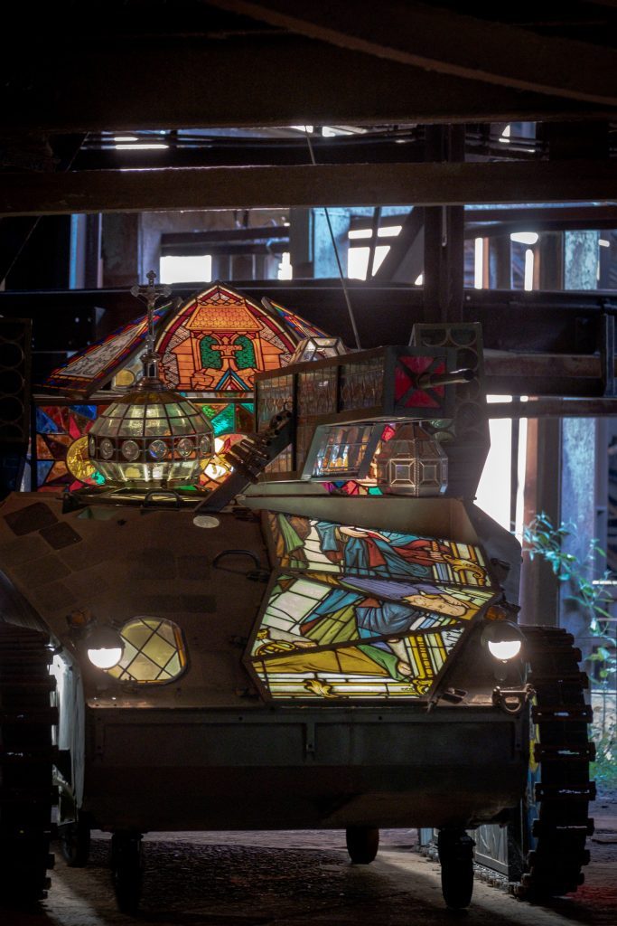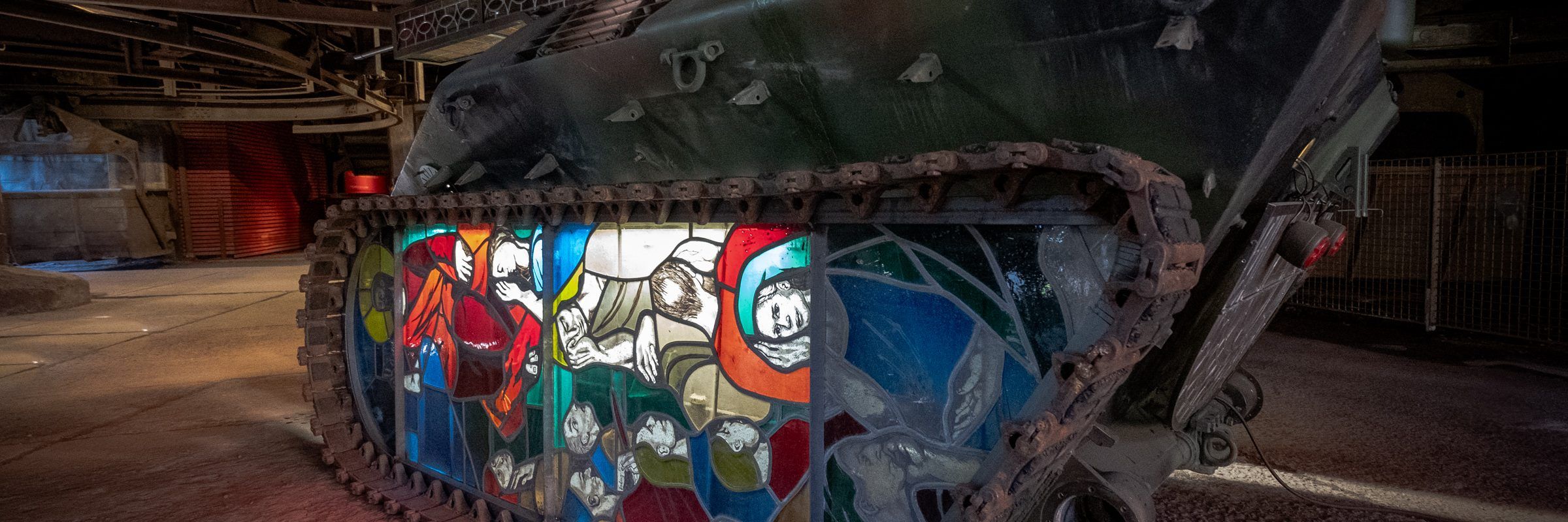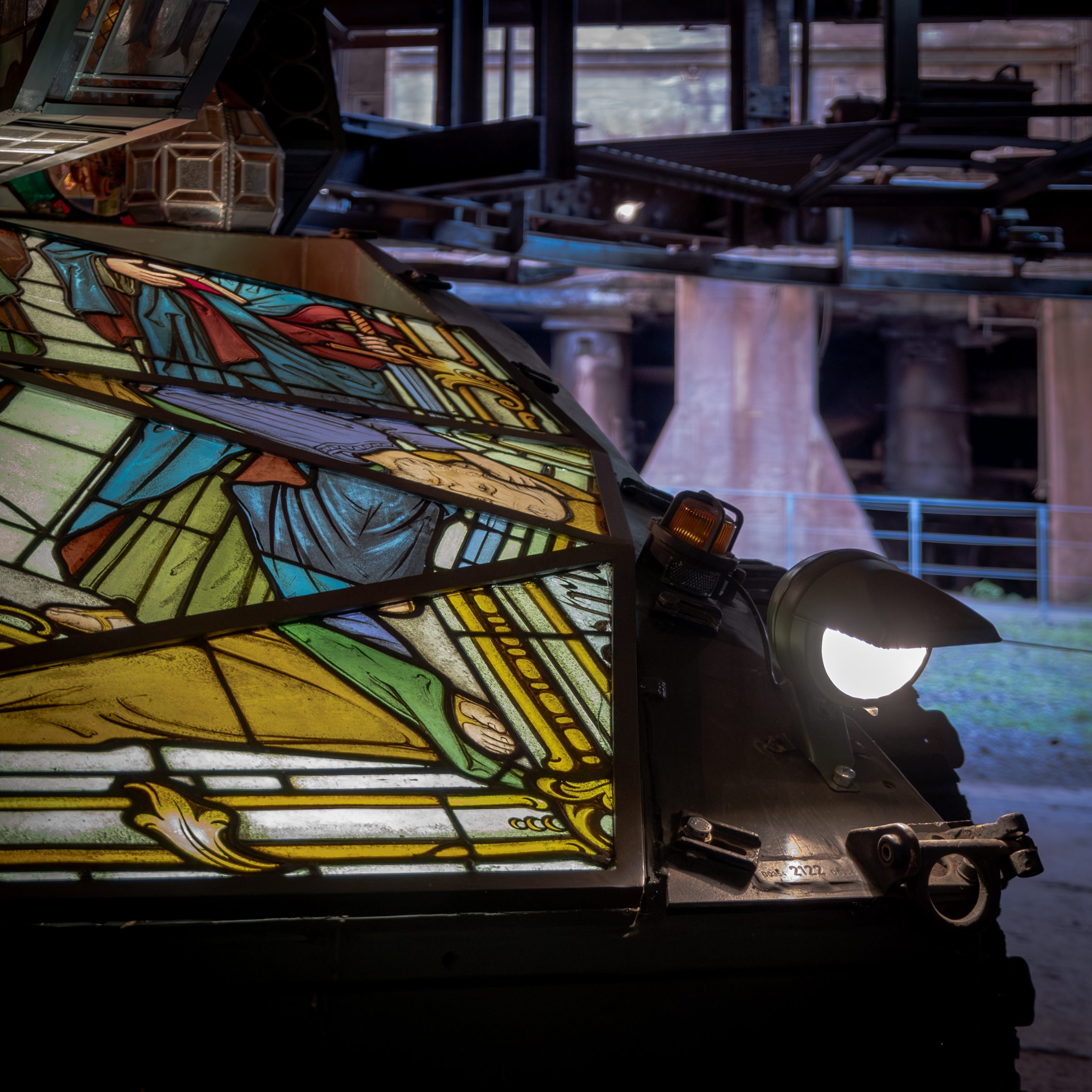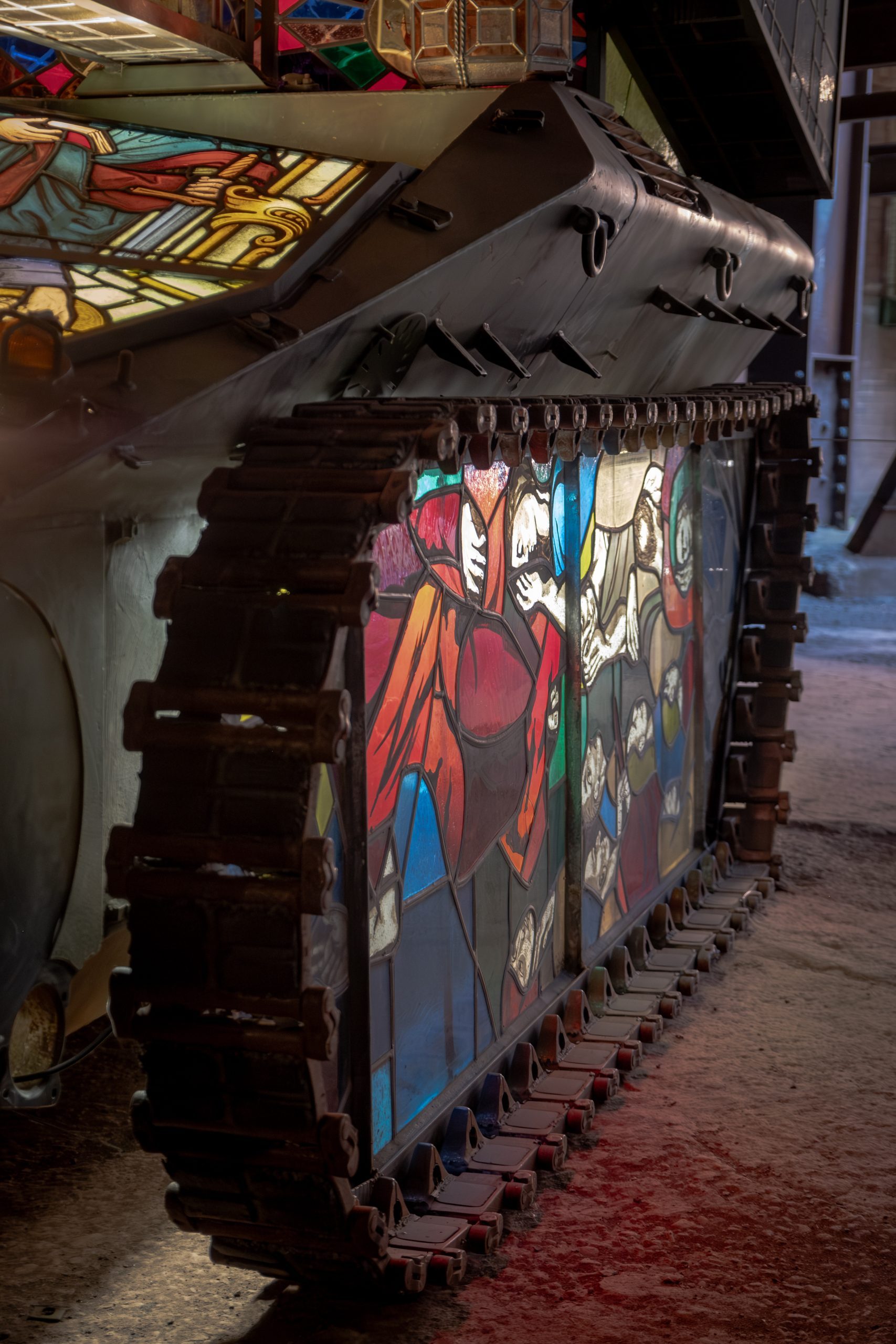 Rocco und seine Brüder are one of the most active collectives at the crossover between urban art and agitational activism. In terms of art-historical analogies, they could be described as Dondi White meets Klaus Staeck, with an added dash of Yes Men. Religious props and motifs have featured a number of times in the Berlin group’s work: a church pew in front of an ATM, a policeman in a confessional, a graffiti variation on the creation of Adam and, in 2019 at the World Heritage Site Völklinger Hütte, a church window depicting the graffiti-sprayed doors of a subway train. These works offer an allegorical dramatisation of other forms of social criticism or celebration of subcultures. By contrast, Deus ex Machina takes aim at the problematic nature of religion itself and – cautiously formulated – religion’s complicity in what human rights advocates would designate as “evil”: the benediction of weapons of war, the forging of new identities, the conquering of “holy” lands, the justification of genocide and the suppression of the freedom to pursue life as one sees fit. Here, the motif of the leaded church window makes a return on the tracks of a Wiesel tank. Let us therefore hope that the fragility of this construction will be confirmed on the plane of human history. If not, the god who made iron can continue to exult.