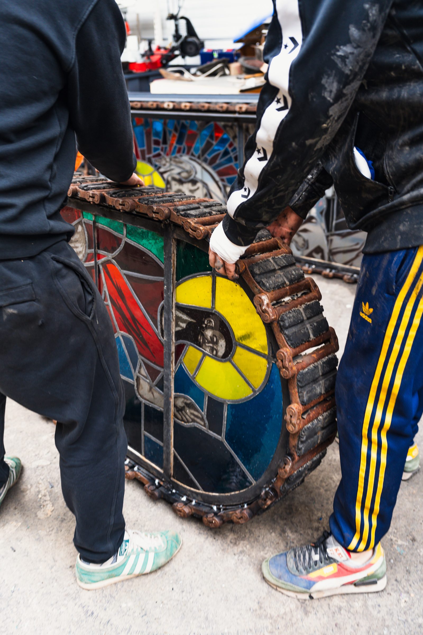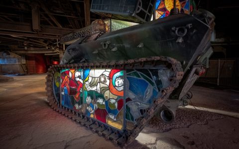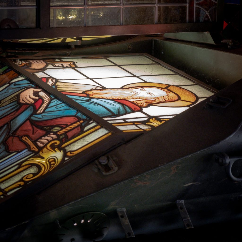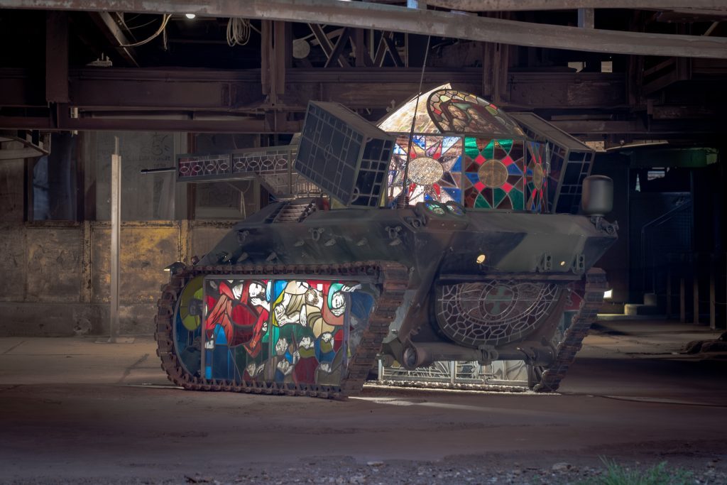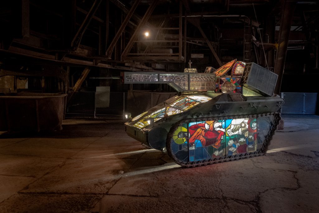 Rocco und seine Brüder are one of the most active collectives at the crossover between urban art and agitational activism. In terms of art-historical analogies, they could be described as Dondi White meets Klaus Staeck, with an added dash of Yes Men. Religious props and motifs have featured a number of times in the Berlin group’s work: a church pew in front of an ATM, a policeman in a confessional, a graffiti variation on the creation of Adam and, in 2019 at the World Heritage Site Völklinger Hütte, a church window depicting the graffiti-sprayed doors of a subway train. These works offer an allegorical dramatisation of other forms of social criticism or celebration of subcultures. By contrast, Deus ex Machina takes aim at the problematic nature of religion itself and – cautiously formulated – religion’s complicity in what human rights advocates would designate as “evil”: the benediction of weapons of war, the forging of new identities, the conquering of “holy” lands, the justification of genocide and the suppression of the freedom to pursue life as one sees fit. Here, the motif of the leaded church window makes a return on the tracks of a Wiesel tank. Let us therefore hope that the fragility of this construction will be confirmed on the plane of human history. If not, the god who made iron can continue to exult.