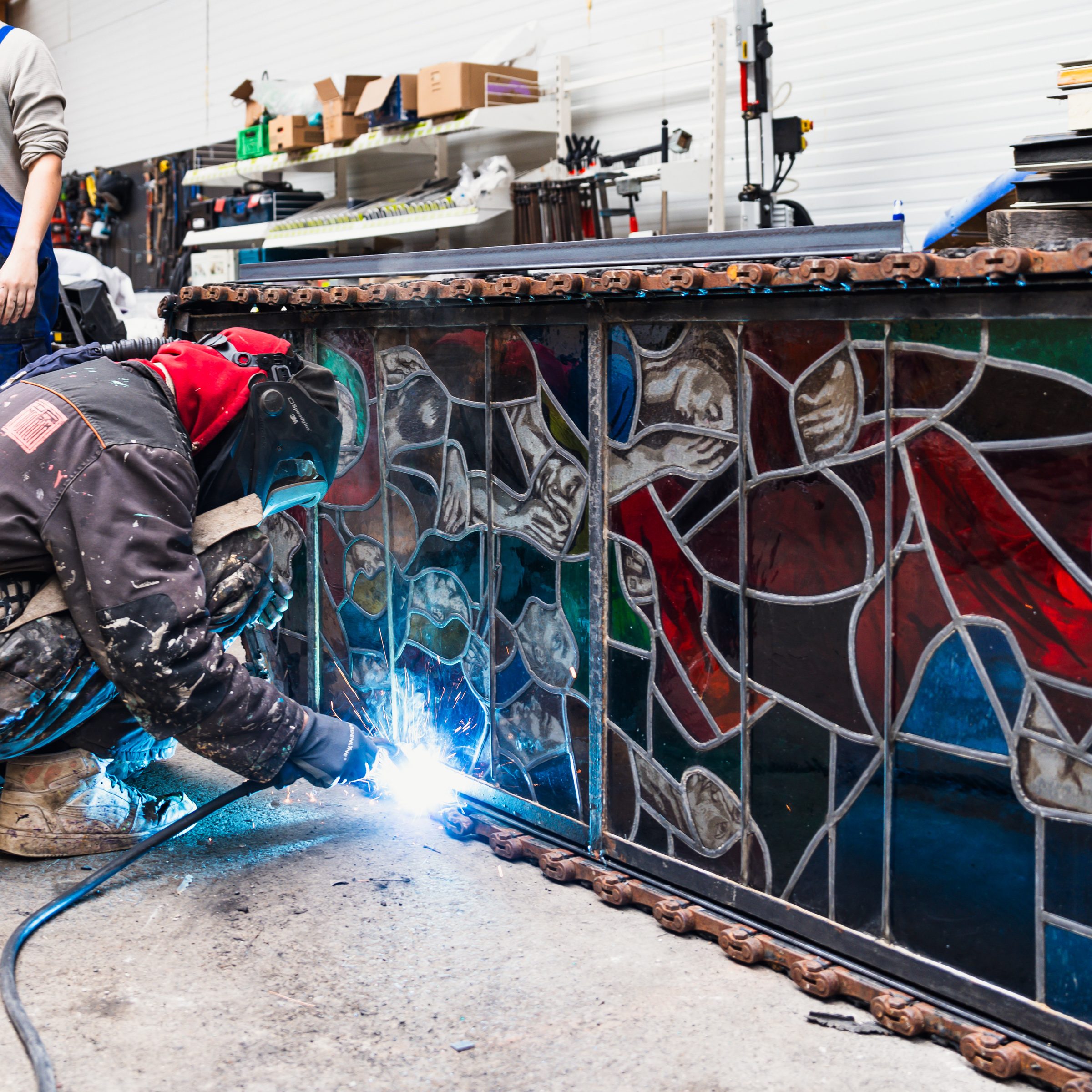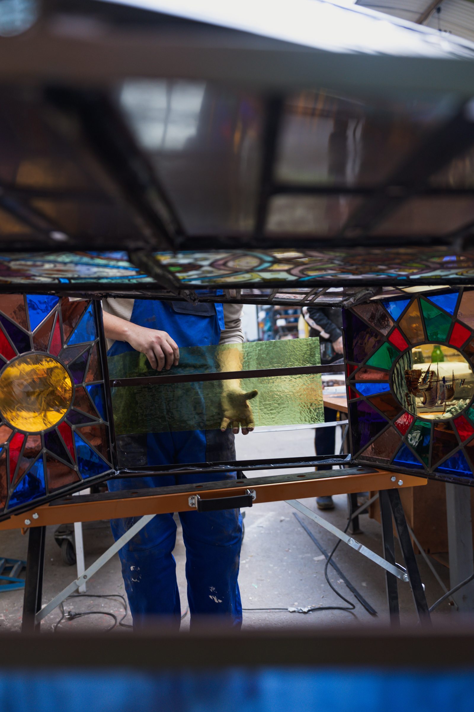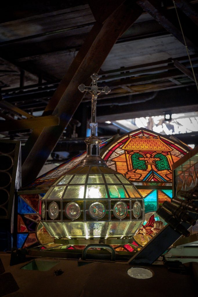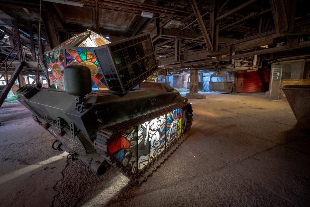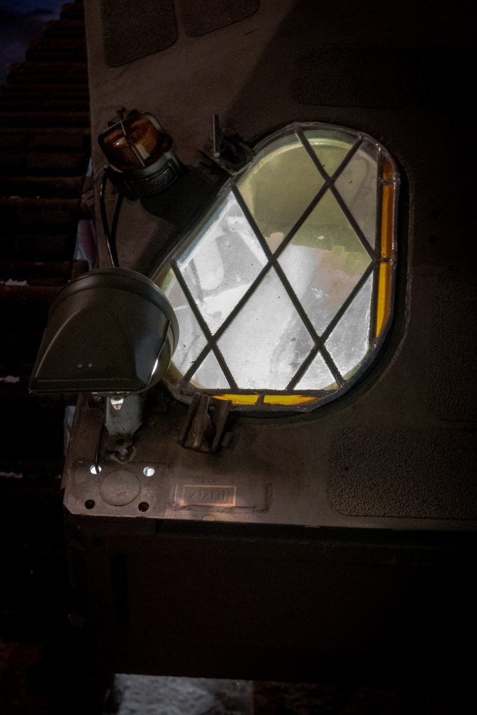 Rocco und seine Brüder are one of the most active collectives at the crossover between urban art and agitational activism. In terms of art-historical analogies, they could be described as Dondi White meets Klaus Staeck, with an added dash of Yes Men. Religious props and motifs have featured a number of times in the Berlin group’s work: a church pew in front of an ATM, a policeman in a confessional, a graffiti variation on the creation of Adam and, in 2019 at the World Heritage Site Völklinger Hütte, a church window depicting the graffiti-sprayed doors of a subway train. These works offer an allegorical dramatisation of other forms of social criticism or celebration of subcultures. By contrast, Deus ex Machina takes aim at the problematic nature of religion itself and – cautiously formulated – religion’s complicity in what human rights advocates would designate as “evil”: the benediction of weapons of war, the forging of new identities, the conquering of “holy” lands, the justification of genocide and the suppression of the freedom to pursue life as one sees fit. Here, the motif of the leaded church window makes a return on the tracks of a Wiesel tank. Let us therefore hope that the fragility of this construction will be confirmed on the plane of human history. If not, the god who made iron can continue to exult.