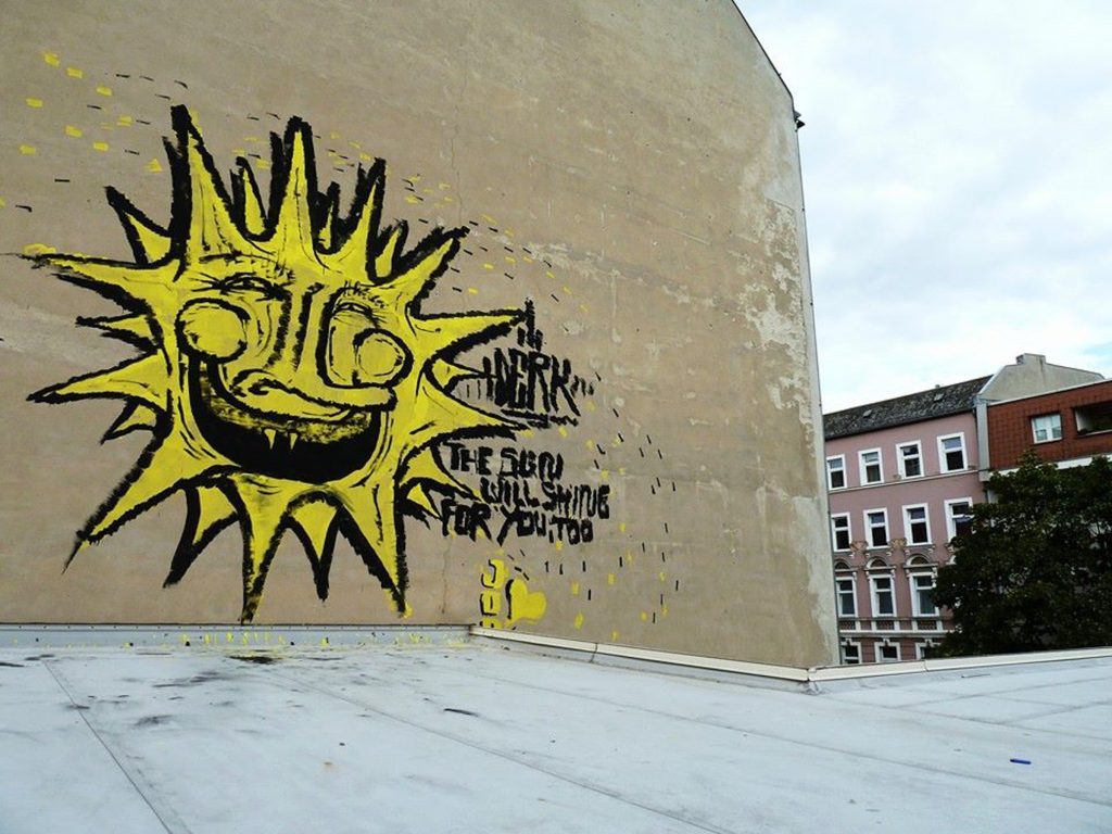 I came up with the sun because I deliberately thought about which symbol could later function as a kind of trademark. I thought about children’s drawings and how children (like I used to) often draw a sun in the upper corner of the picture. My thought was whether it might be cool to take these suns out of that context and put them in a different one.