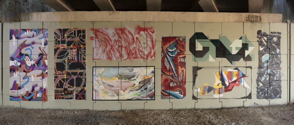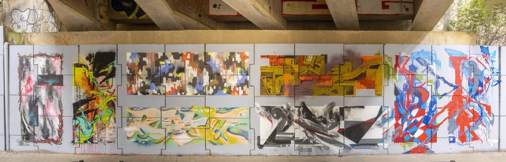 Eyes-B already knew  about this location and another guy from Brussels was responsible, he was already painting at this spot. They talked about this Abstract Session if it could be done at his location. The puzzle pieces that shape the wall are just the existing structure of the concrete blocks which are used to build this viaduct.