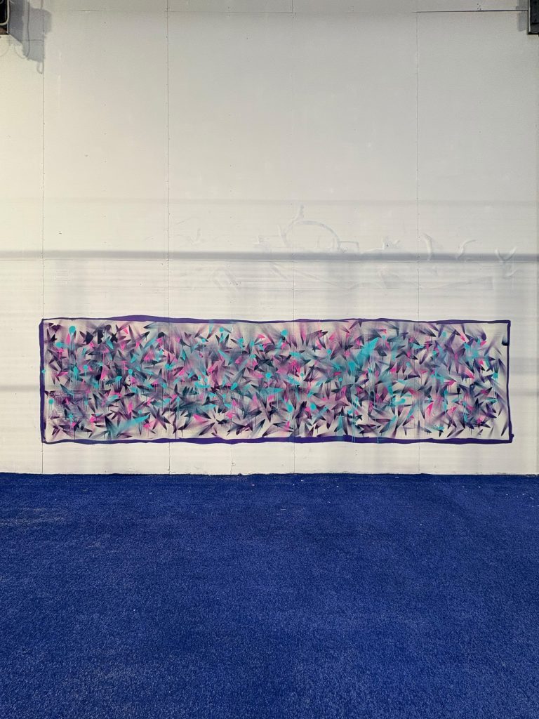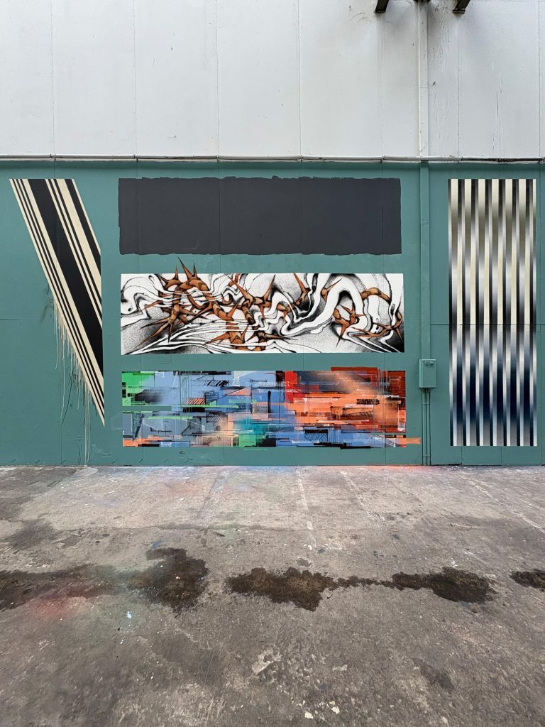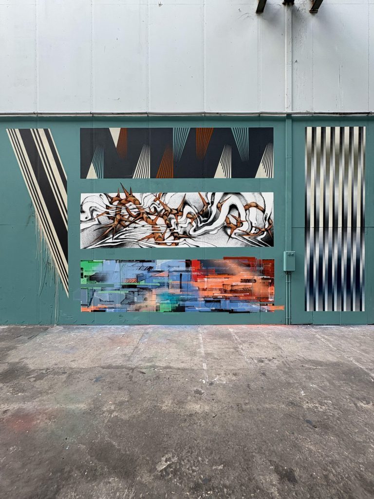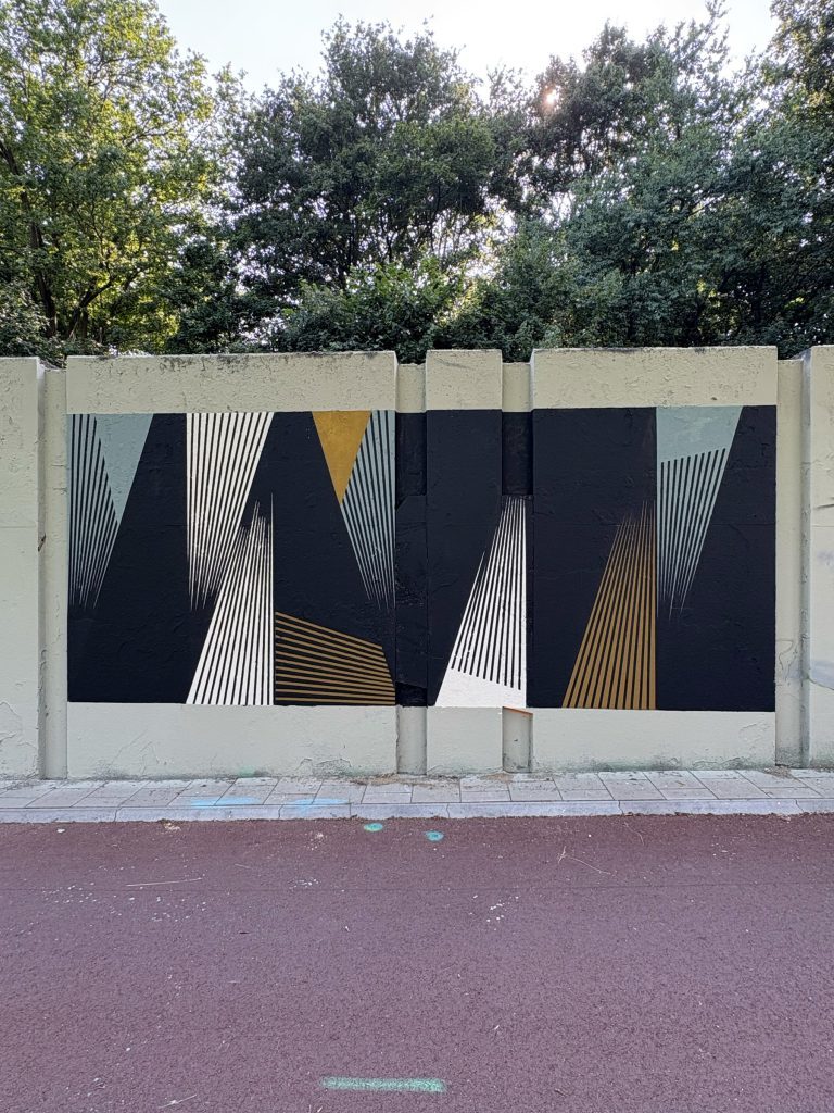 Although all the works are abstract, there are many differences within this ‘style’. Some, for instance myself, work in a geometric mathematical way with straight lines. I have a sketch or a plan in advance. Others work more from their feelings in the space and use an organic way of painting. And some are led by the techniques they use and work from there. They just start and see what happens. This is what we all like about each other. We all have our own way of painting on walls with abstraction, found our own style within abstraction, but we still feel alike.