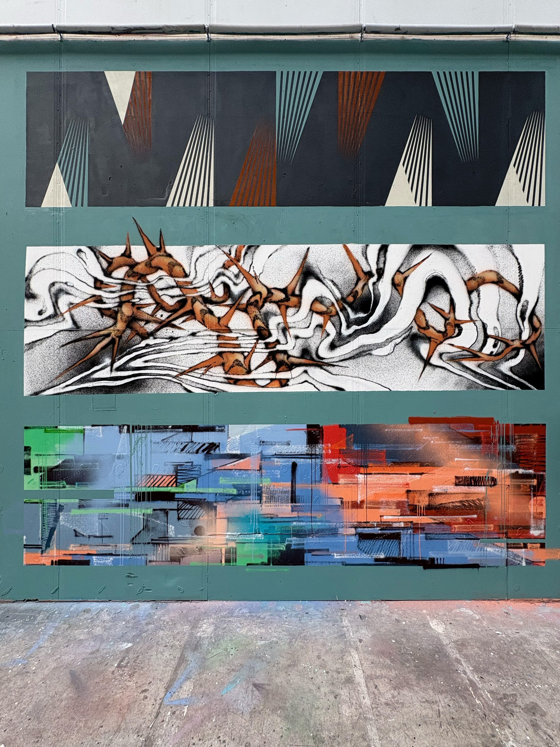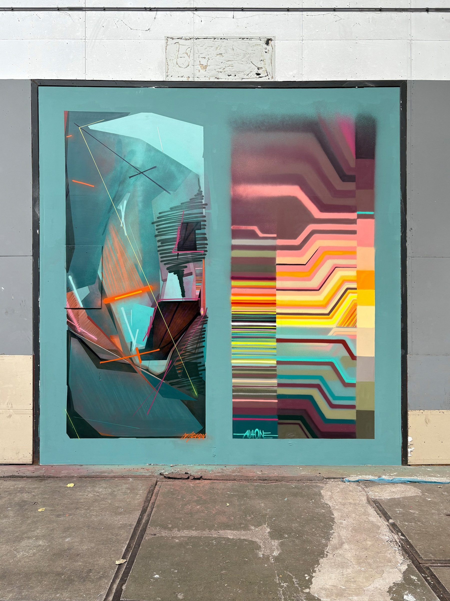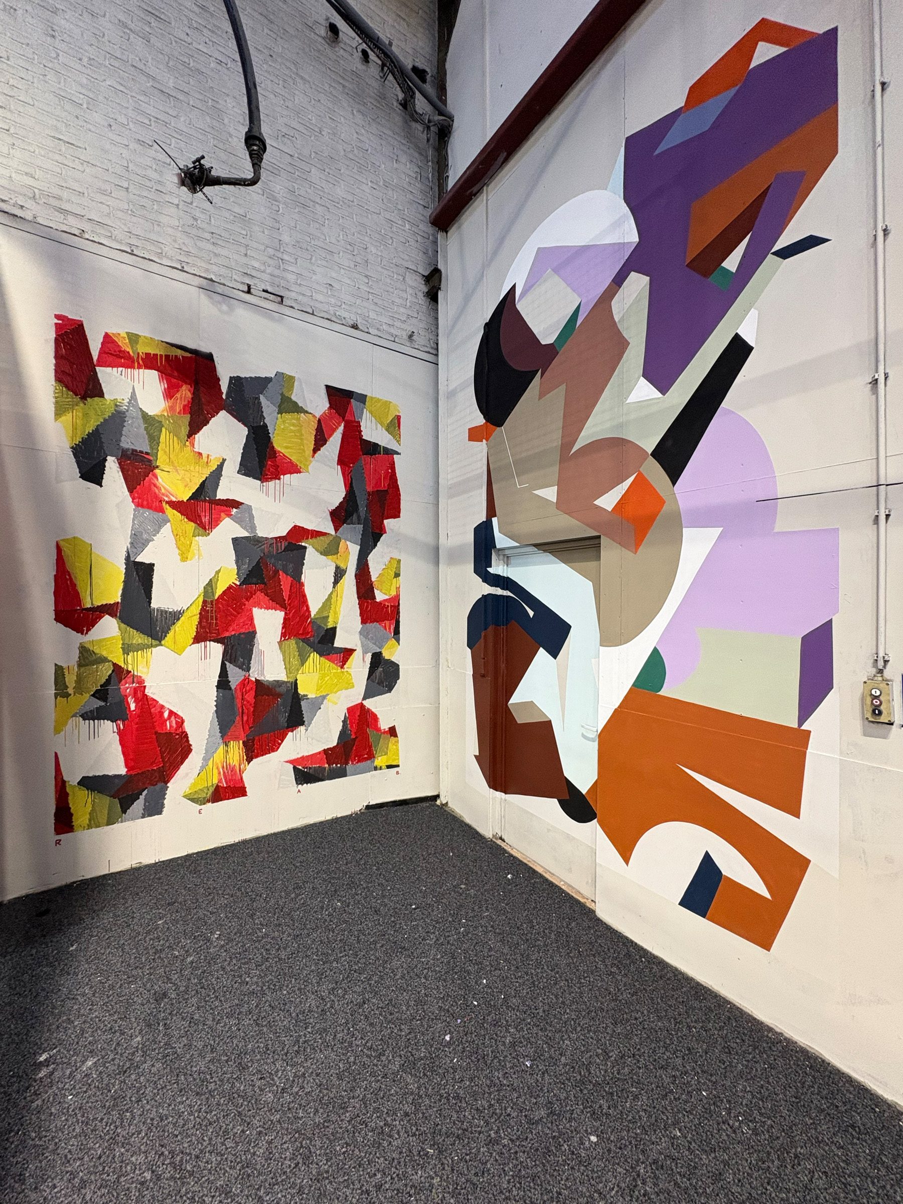Although all the works are abstract, there are many differences within this ‘style’. Some, for instance myself, work in a geometric mathematical way with straight lines. I have a sketch or a plan in advance. Others work more from their feelings in the space and use an organic way of painting. And some are led by the techniques they use and work from there. They just start and see what happens. This is what we all like about each other. We all have our own way of painting on walls with abstraction, found our own style within abstraction, but we still feel alike.
