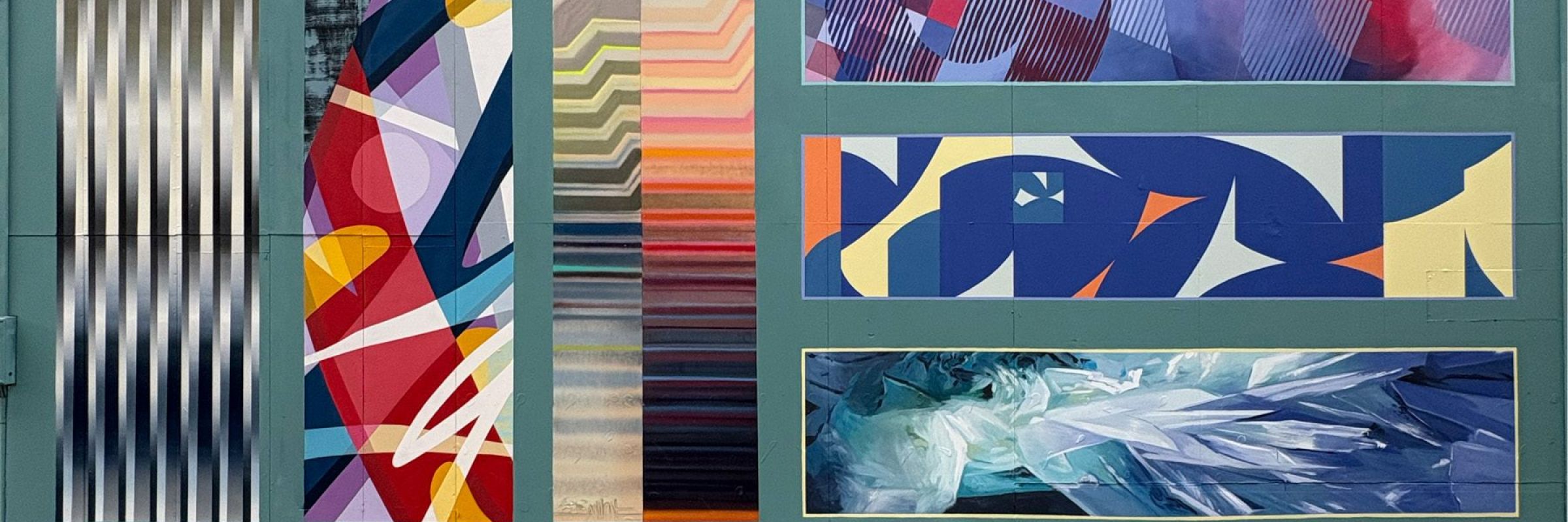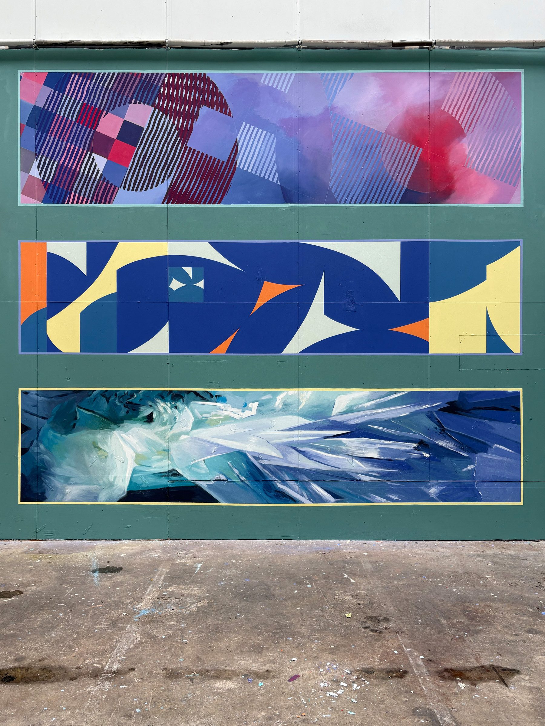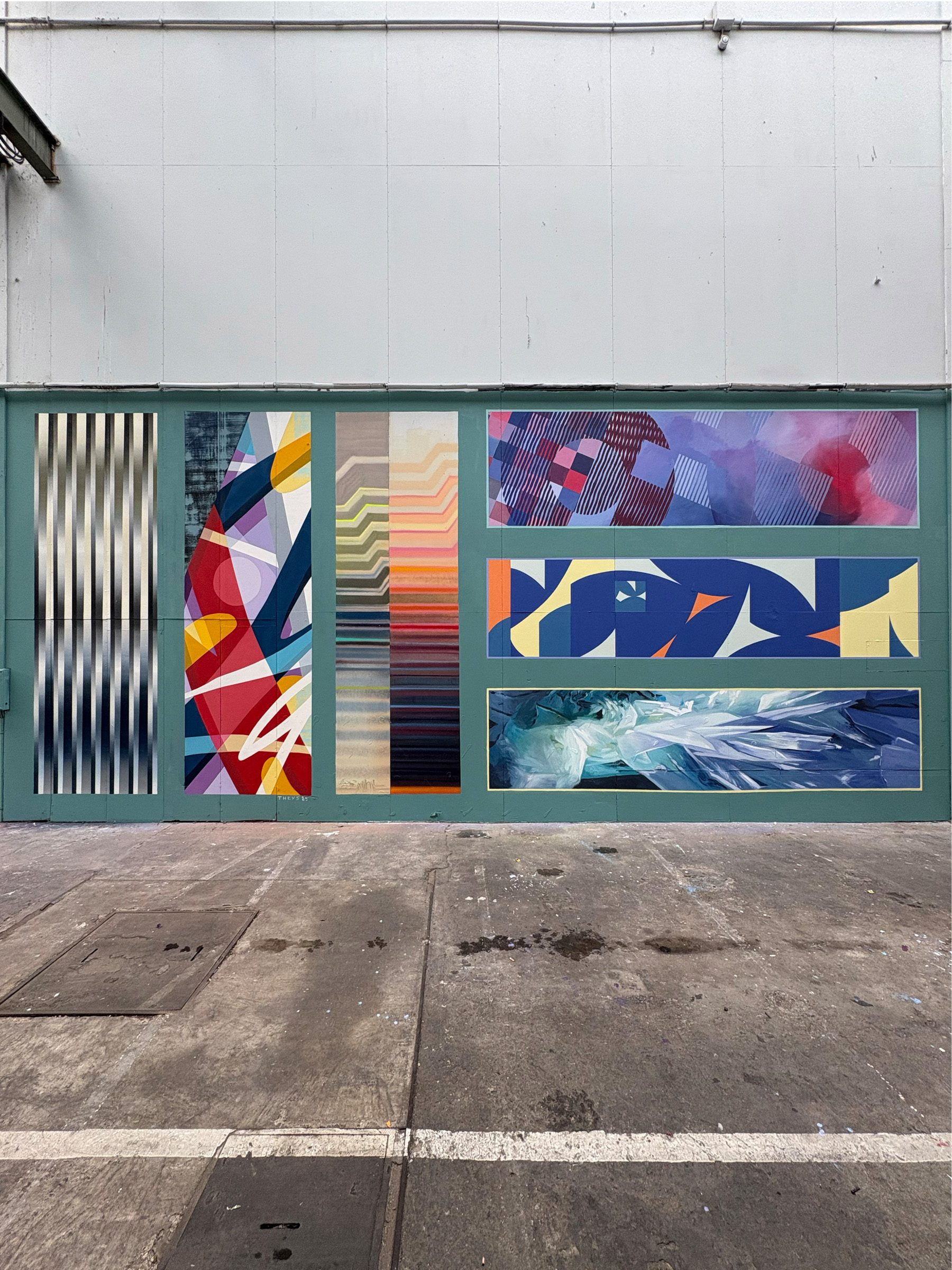 Although all the works are abstract, there are many differences within this ‘style’. Some, for instance myself, work in a geometric mathematical way with straight lines. I have a sketch or a plan in advance. Others work more from their feelings in the space and use an organic way of painting. And some are led by the techniques they use and work from there. They just start and see what happens. This is what we all like about each other. We all have our own way of painting on walls with abstraction, found our own style within abstraction, but we still feel alike.