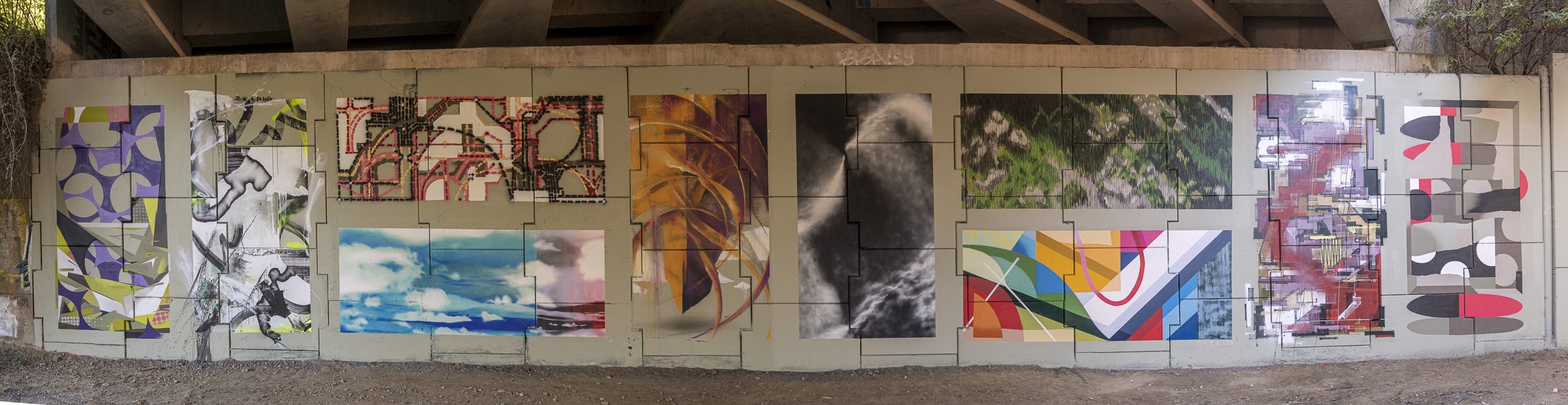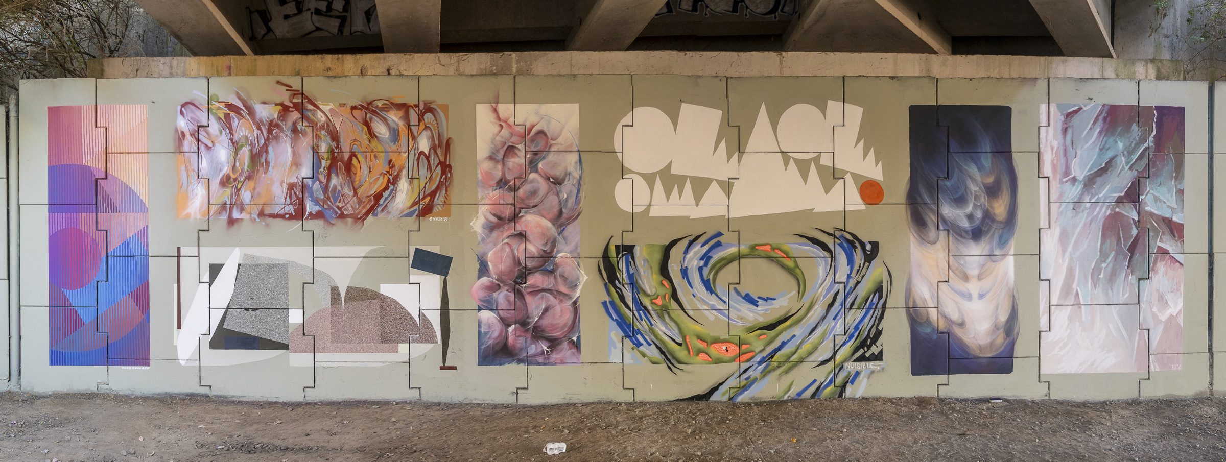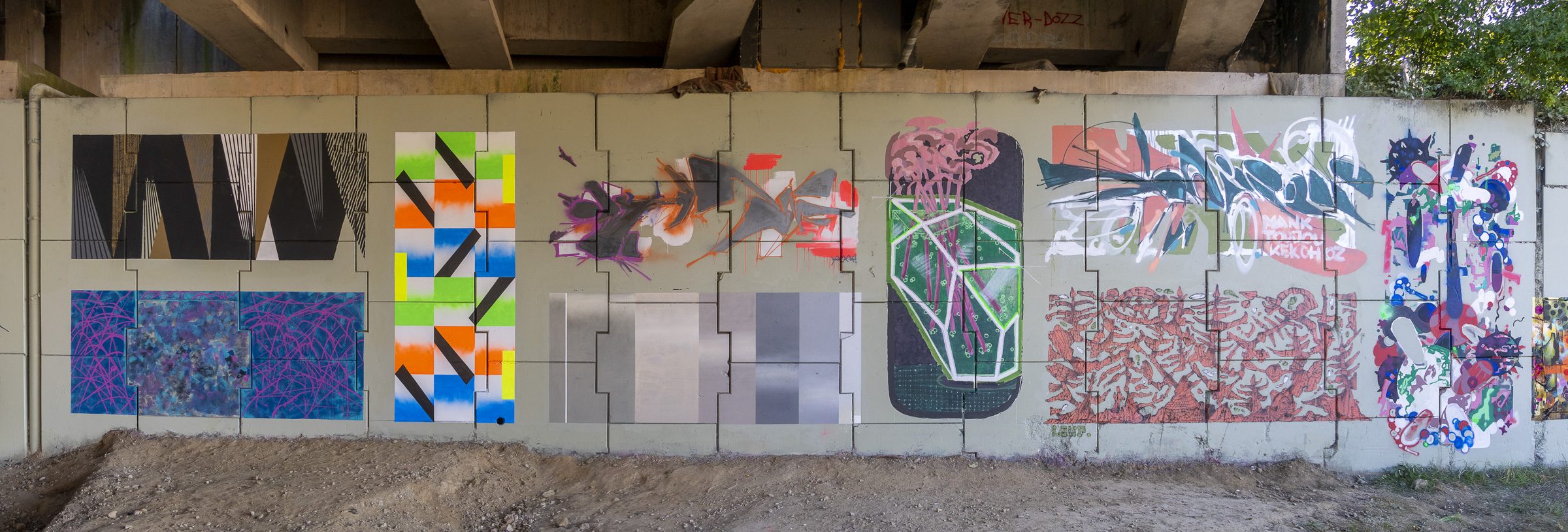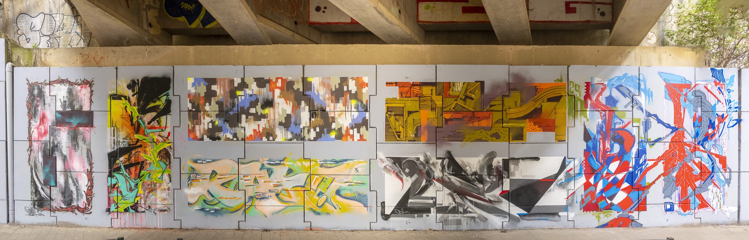 Eyes-B already knew  about this location and another guy from Brussels was responsible, he was already painting at this spot. They talked about this Abstract Session if it could be done at his location. The puzzle pieces that shape the wall are just the existing structure of the concrete blocks which are used to build this viaduct.