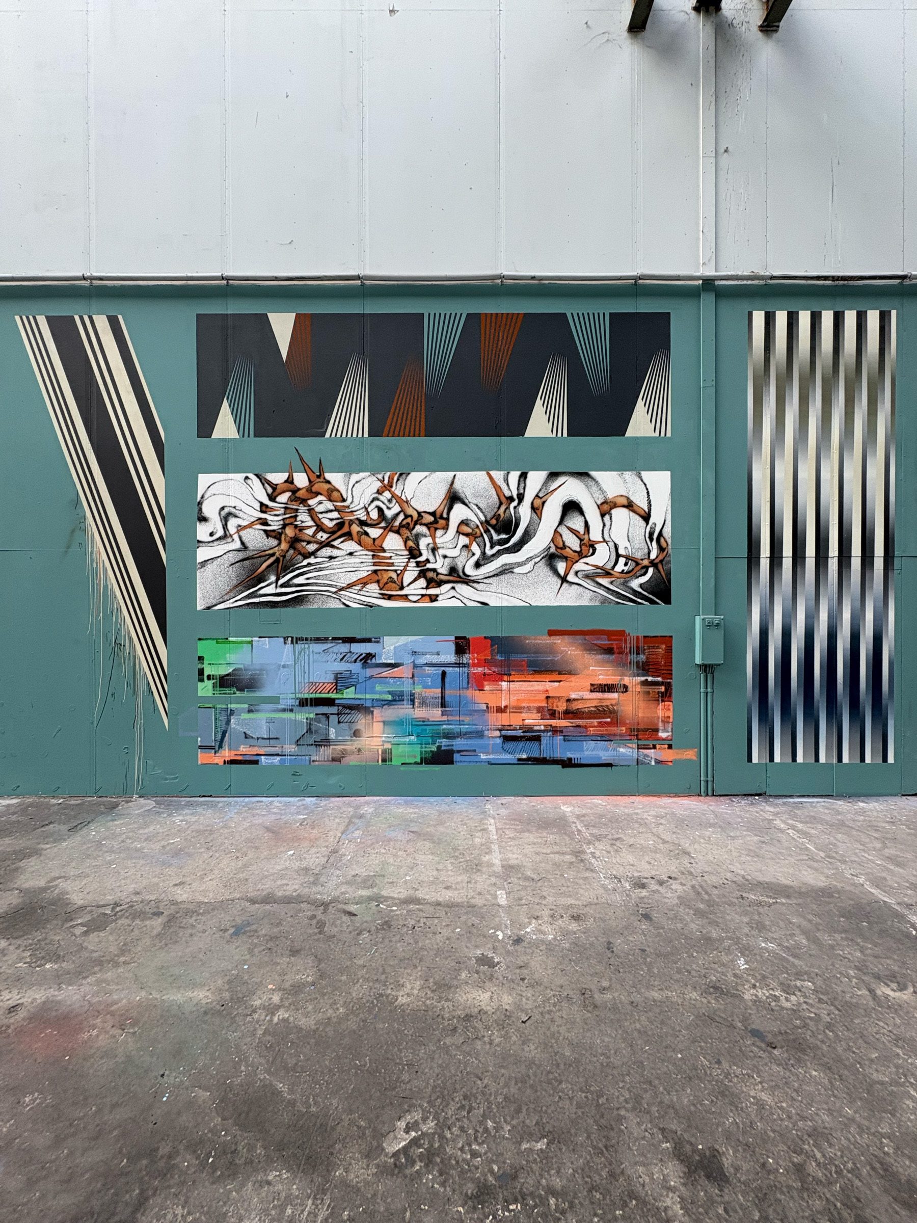 The idea was to have a smaller size of the wall to paint, and thus have more time to meet other like-minded artists. You know many via Instagram but not in real life. And if you have a larger area, you will only be busy painting all day. The social aspect is then left behind. The goal was to have more like a defined canvas format on the wall for each artwork. The idea was not to make one big composition like a regular graffiti jam. The idea is also that our Abstract Sessions are not only about painting but more about the social aspect, to become more a community event.