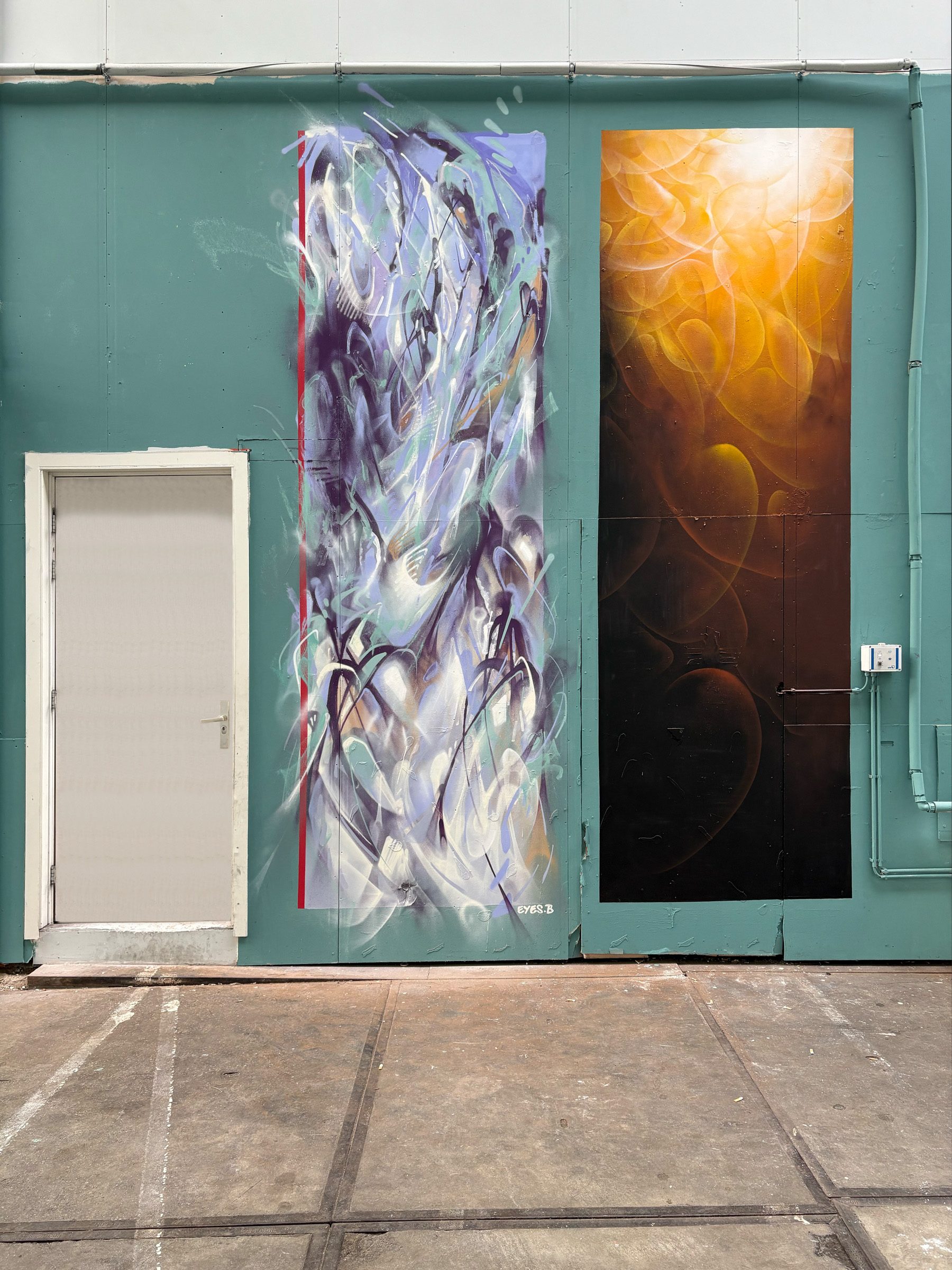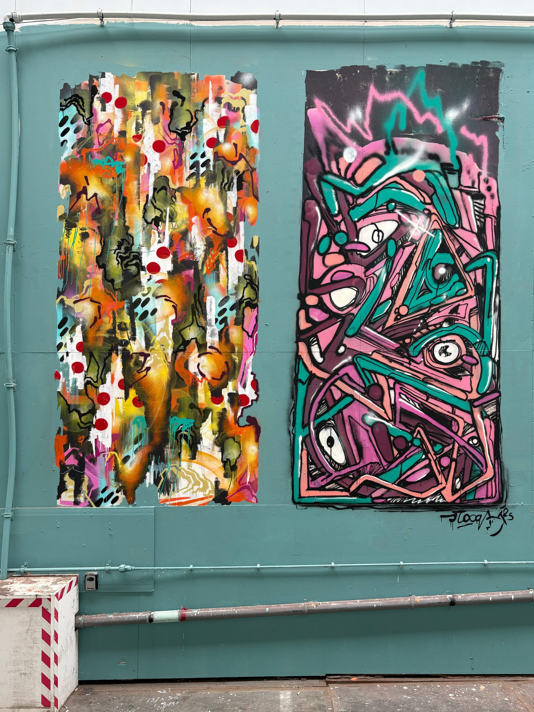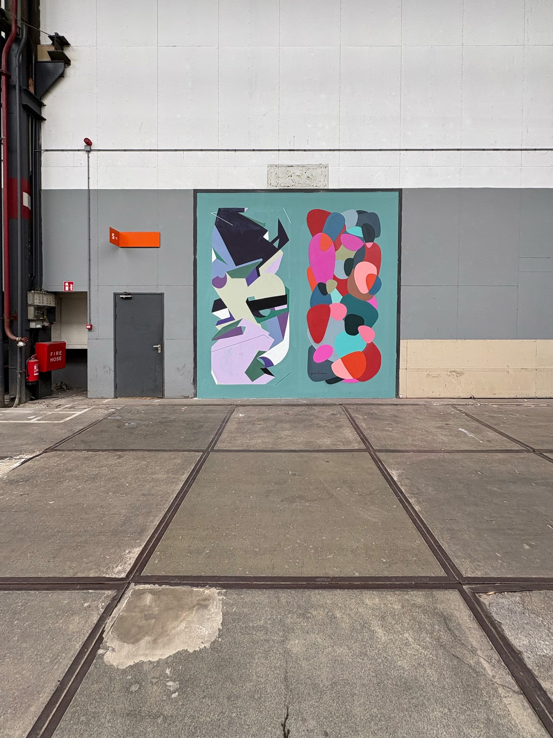 A friend of mine works at the Kabeldistrict as a Placemaking manager. She sorts out things that can be done for just temporary use. She asked to have a talk about a way of finding signage inside the building so people could navigate to the different companies located inside this building. When we walked through this building we passed by a huge wall (64 meters wide and 12 meters high) and I asked what the plan was with this wall. They actually didn’t have a specific plan for this wall. So I came up with the idea to use it as a curated art wall. They liked this plan. Every half a year, I invite five artists to paint a mural of 10 x 4,5 meters. I curated this wall four times already. To get to this big wall you also pass by other useful walls. Every artist who had painted on the big wall has asked about the other walls. So a couple of months ago, I inquired if I could get these walls as well to paint upon. They asked me to take photos of the walls and sent me back a file with notifications which walls I could paint. Now I have about 400 m2 of walls that I can use.