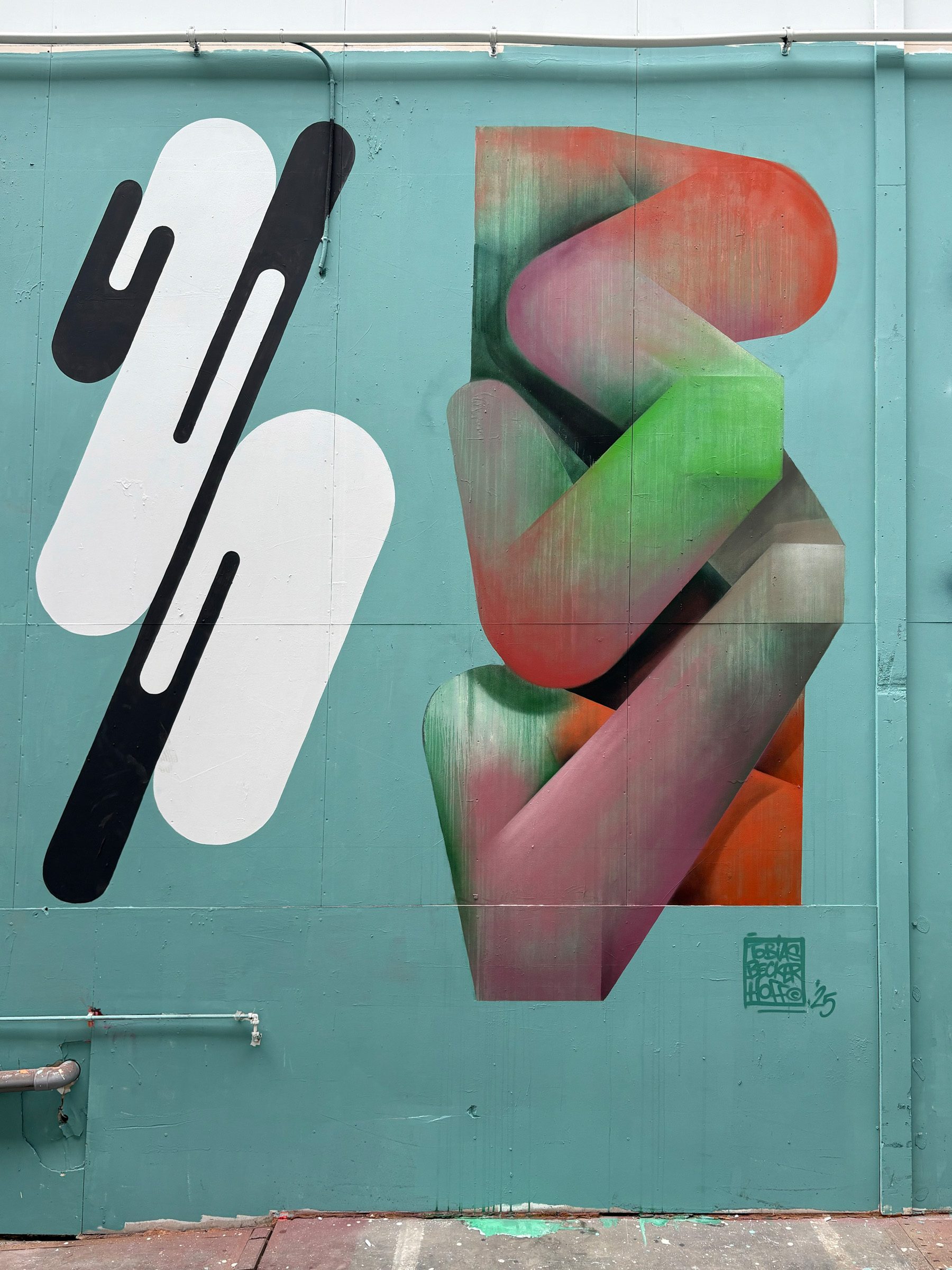 I work very mathematically and start with a grid. I try to start with a certain shape which I then repeat a couple of times within the design/composition I’m making. Just by changing some small parts, it doesn’t become a repetitive pattern, but it still feels alike. Next to that, the placement and the surroundings also make the composition satisfying. For me not only the design makes the composition. I often paint in urban locations, and then I try to match the composition with the place/wall that I find there. But most of the time you don’t know what the surroundings give you. You just bring certain colours along, but you don’t know if it will blend in or match with the surroundings or just with a small detail in the surroundings. For me, it is satisfying if all comes together like a puzzle. The design can be placed really well in the surroundings, the colours match with the environment and the natural light that is at the location. The complete image altogether, makes it satisfying to me.